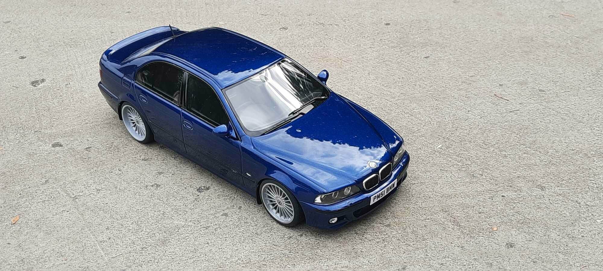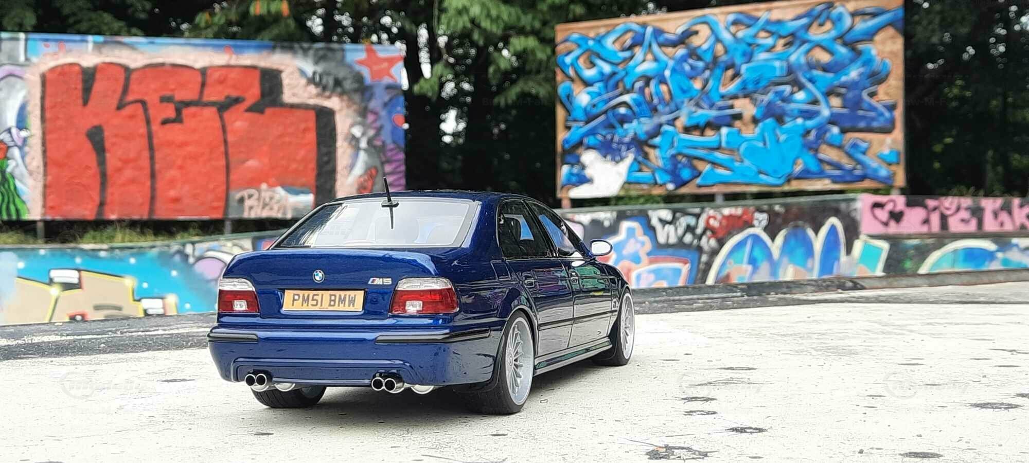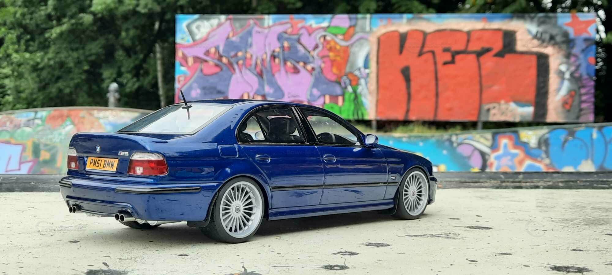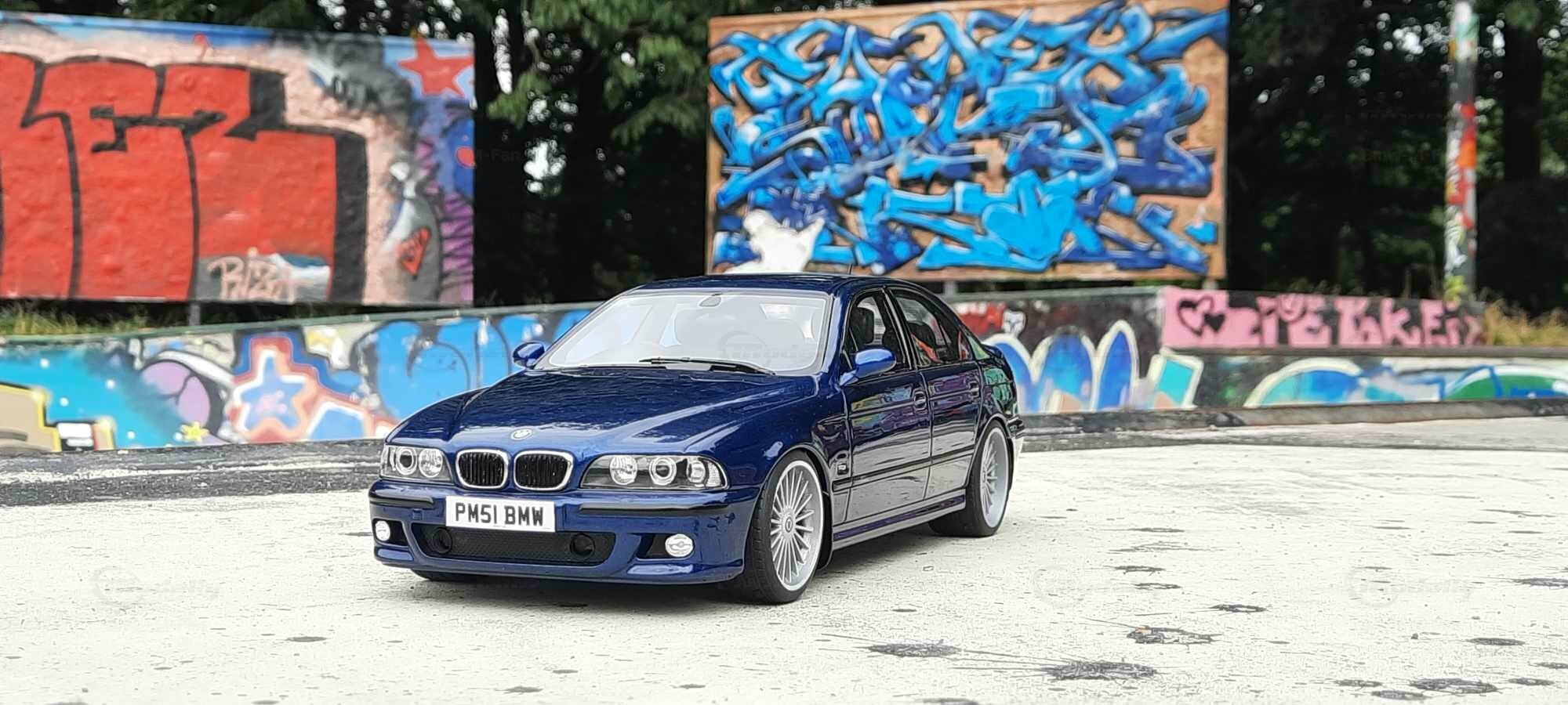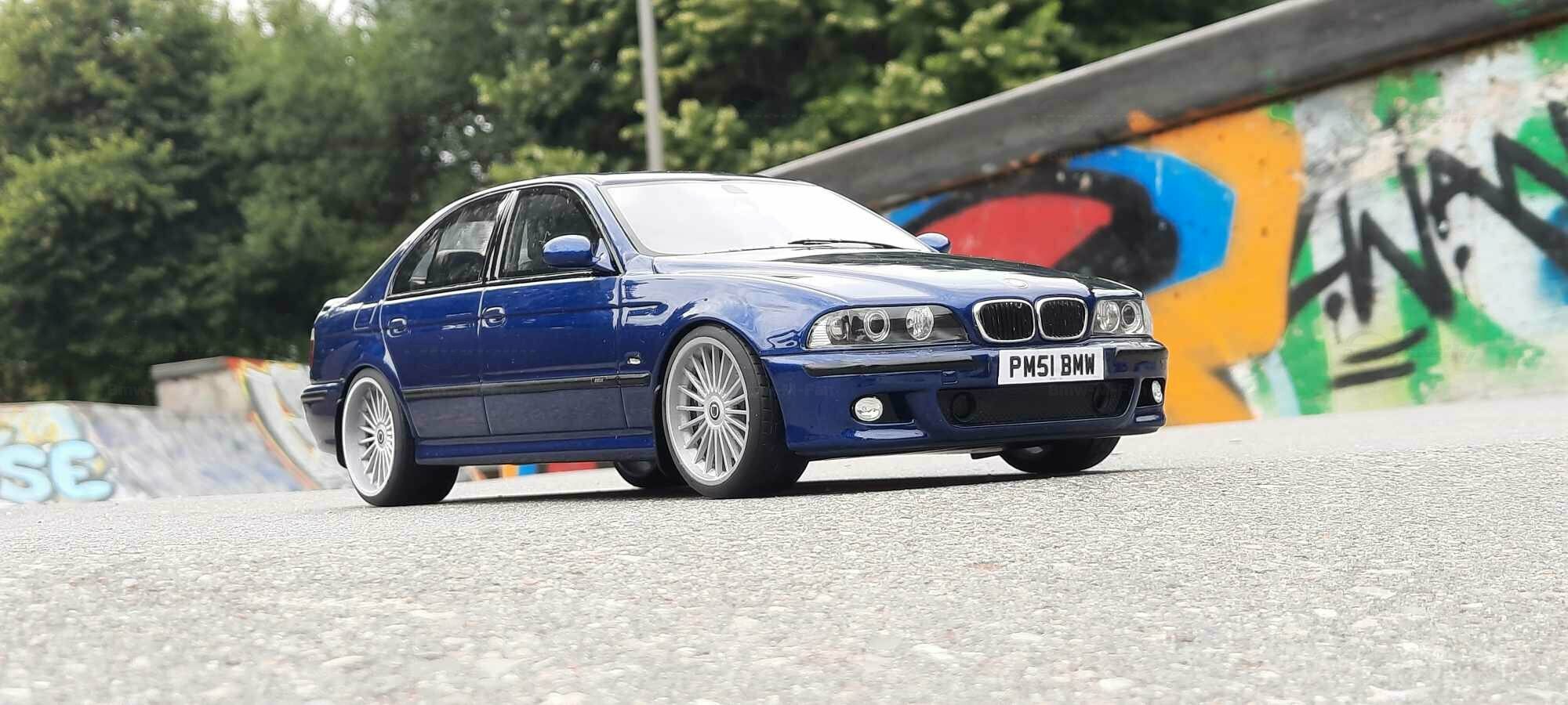 The miniature of BMW E39 M5 in 1/18 scale impresses with its deep blue paintwork, reflecting the elegant and sporty character of the original. The collector "Bmw-M-Fan" has added a special piece to his collection with this model. The wheels and possibly other specific details indicate modifications that individualize the model. The headlights, taillights, and grille have been meticulously replicated, giving the model an extremely realistic appearance. These customizations and details ensure that this model car possesses a high degree of authenticity and collector value.