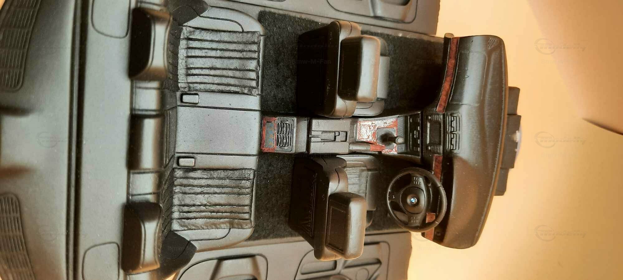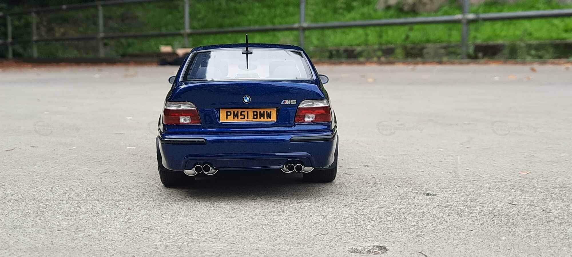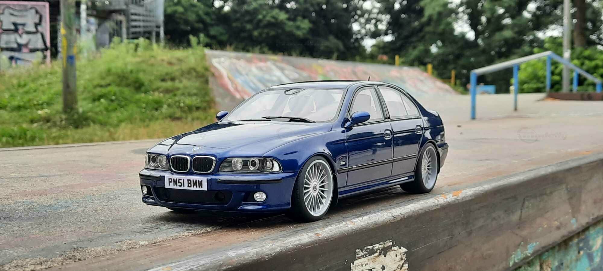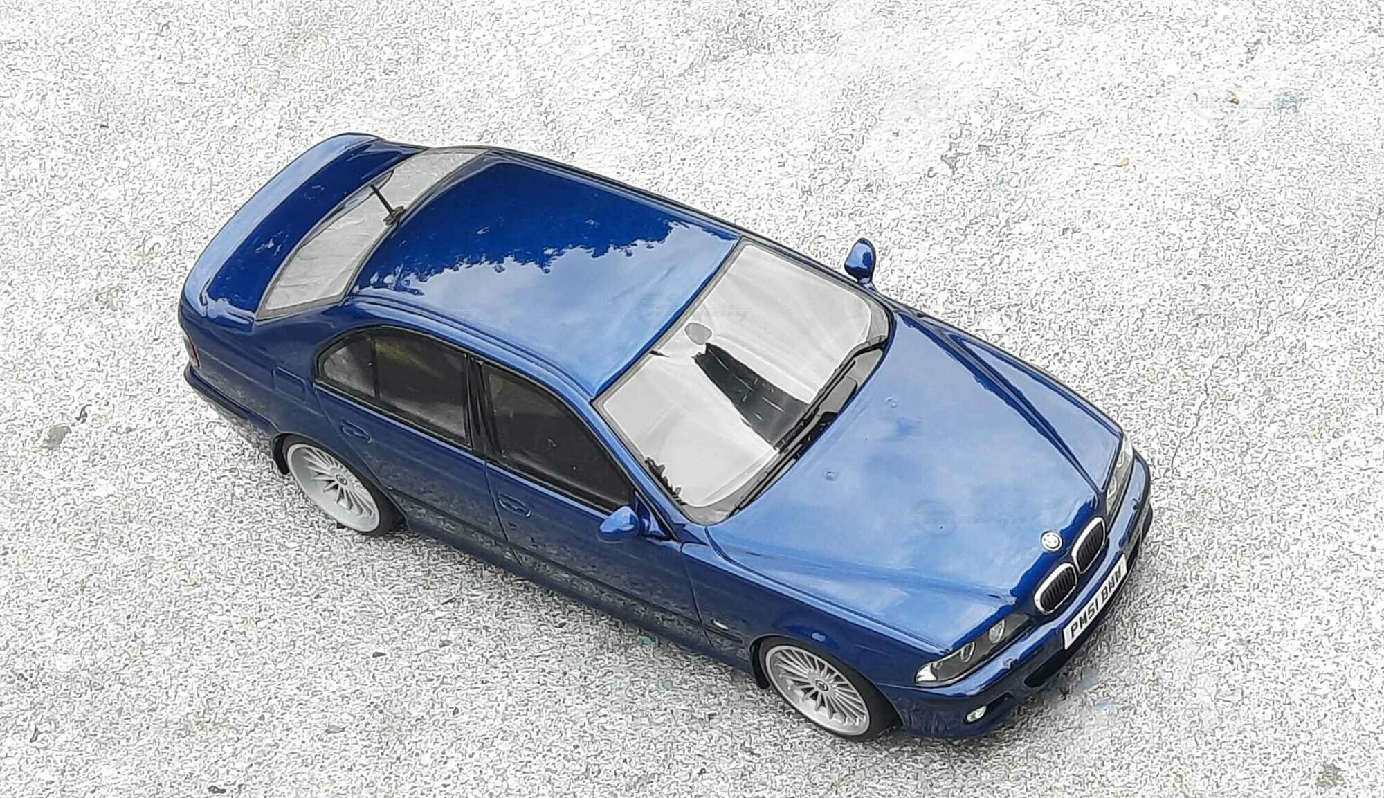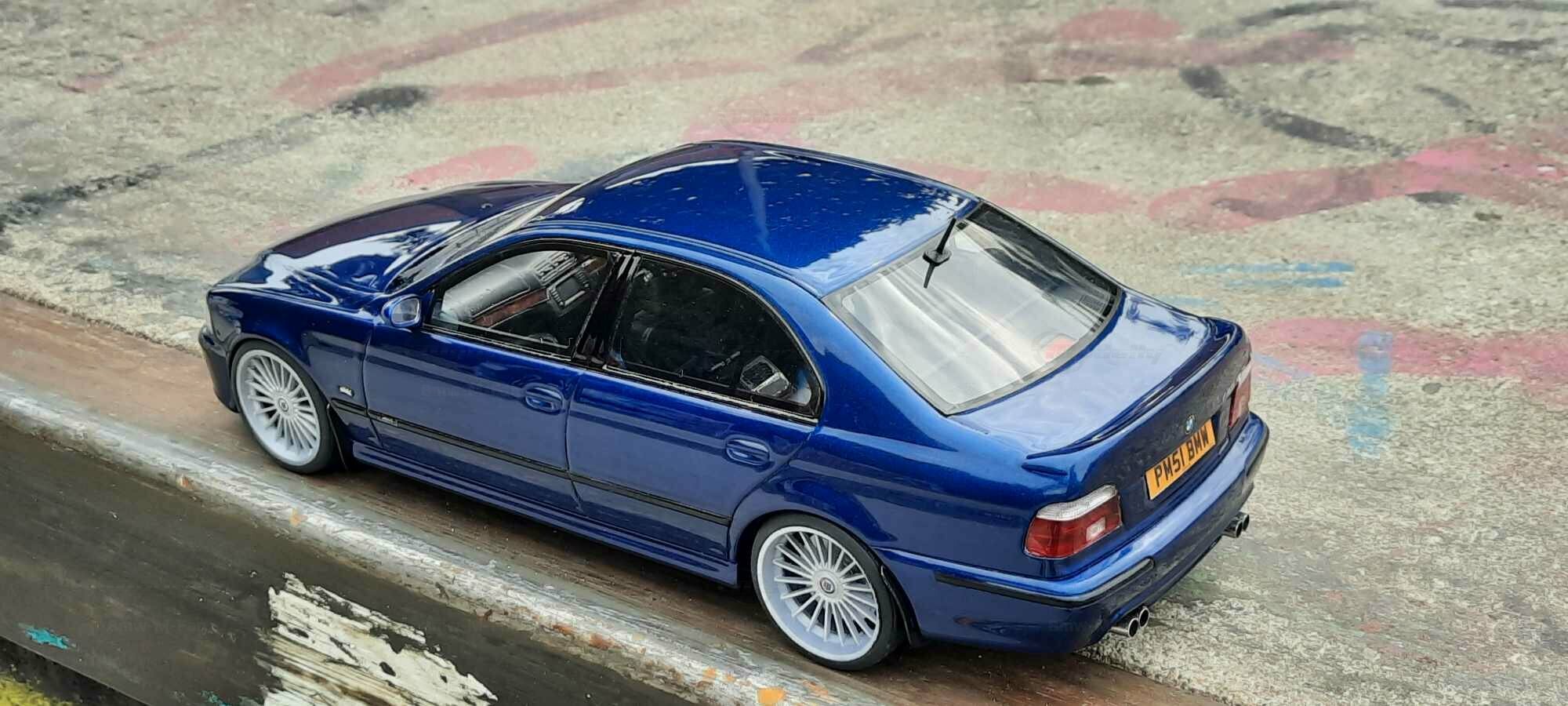 The miniature of BMW E39 M5 in 1/18 scale impresses with its deep blue paintwork, reflecting the elegant and sporty character of the original. The collector "Bmw-M-Fan" has added a special piece to his collection with this model. The wheels and possibly other specific details indicate modifications that individualize the model. The headlights, taillights, and grille have been meticulously replicated, giving the model an extremely realistic appearance. These customizations and details ensure that this model car possesses a high degree of authenticity and collector value.