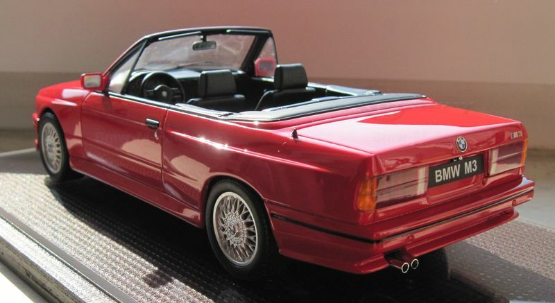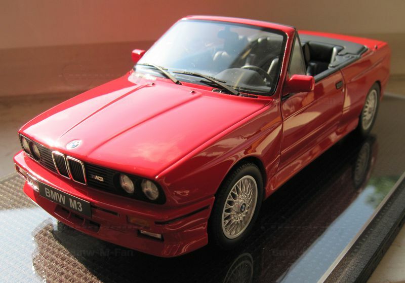 The model shows off the classic traits of the BMW M3 Cabrio (E30) in a vibrant red finish. This color was particularly popular and really highlights the car's sporty vibe. The red paint pairs beautifully with the almost vintage-looking, star-shaped BBS wheels, which became a hallmark of ’80s racing flair. The replica stays true to these design elements and gives a real sense of that era in 1/18 scale. Especially noteworthy is the attention to detail, like the M logos, headlights, and grille design, which all add to the authenticity of this mini version.