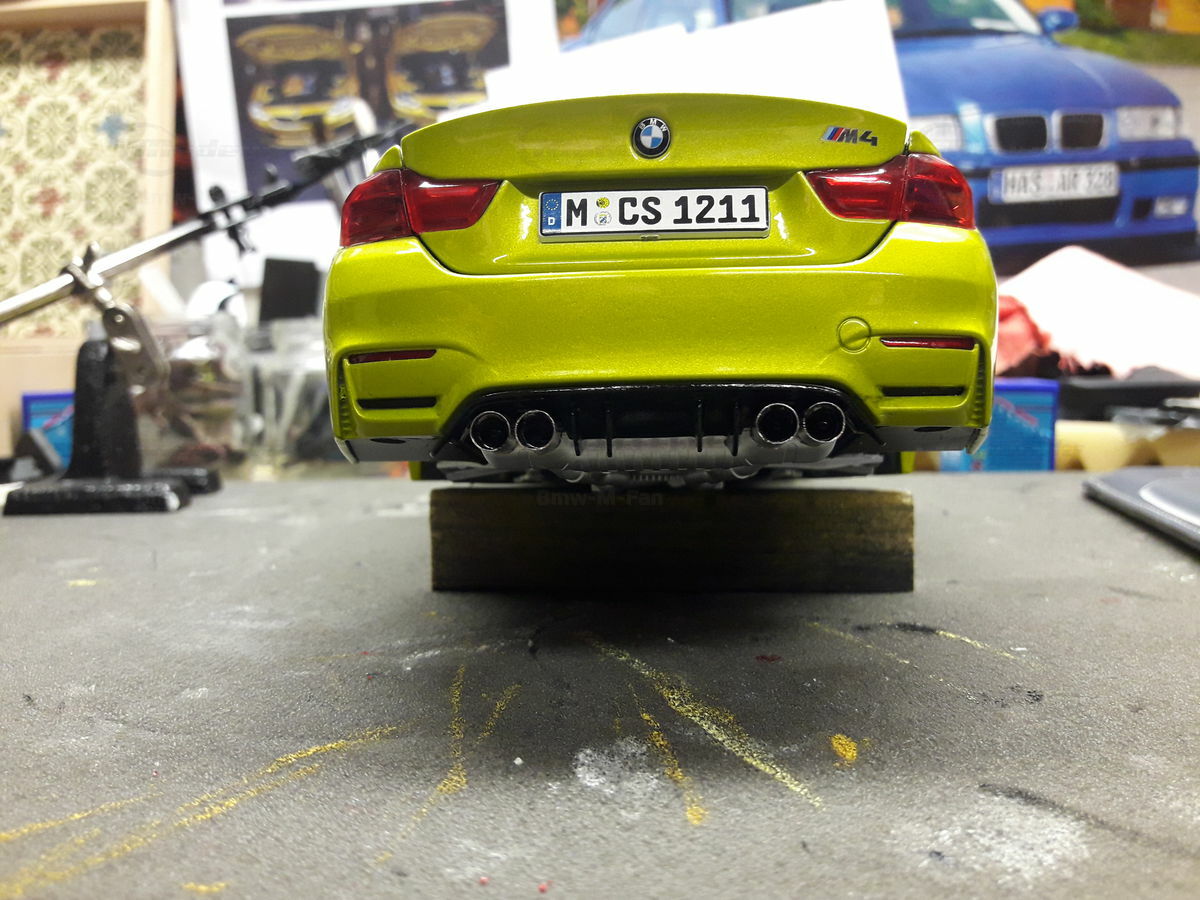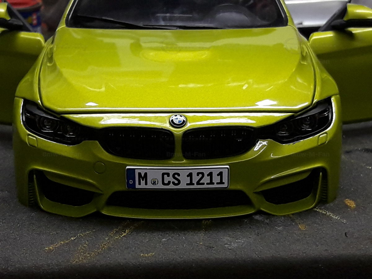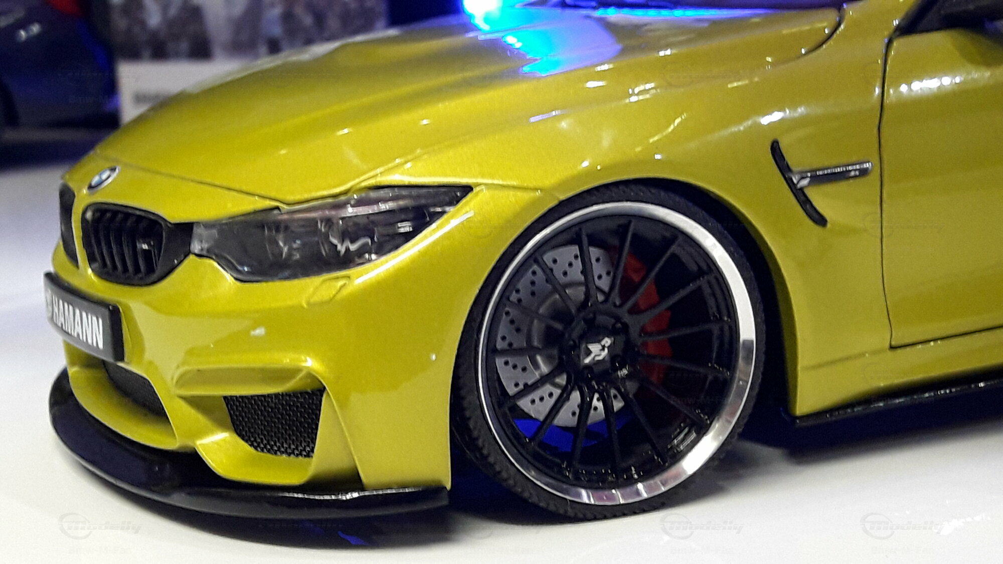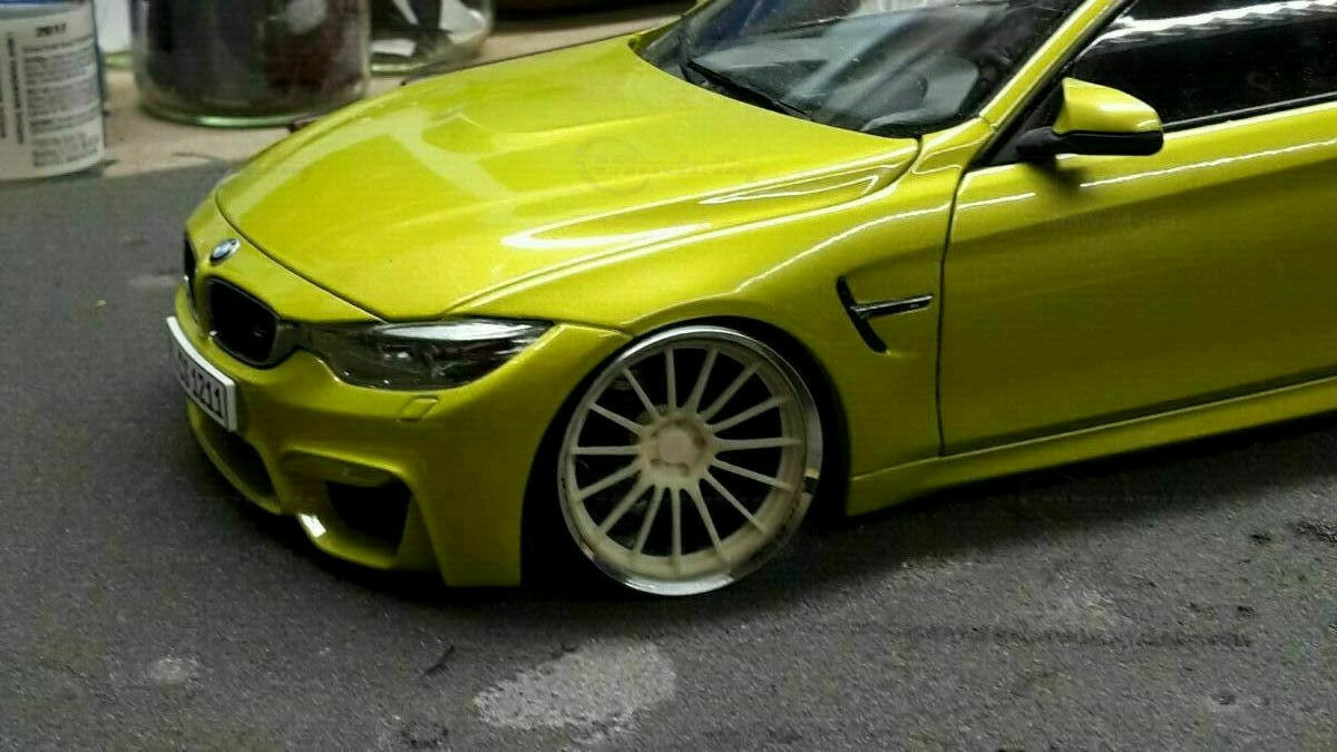 In addition to the paint job and tuning modifications, the model also features detailed and specialized components like the wheels. Unfortunately, the exact manufacturer and model of the wheels are not clearly identifiable in the pictures, but this doesn’t diminish the fascination and collector's value of the model. This Paragon Models 1/18 scale model car, crafted from high-quality Diecast material, is a unique piece for any collection and a tribute to the impressive BMW F82 M4.