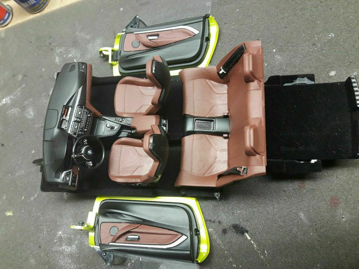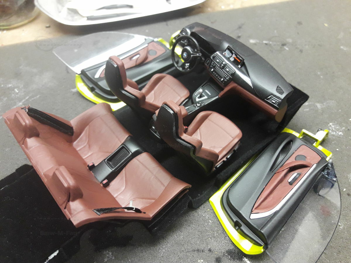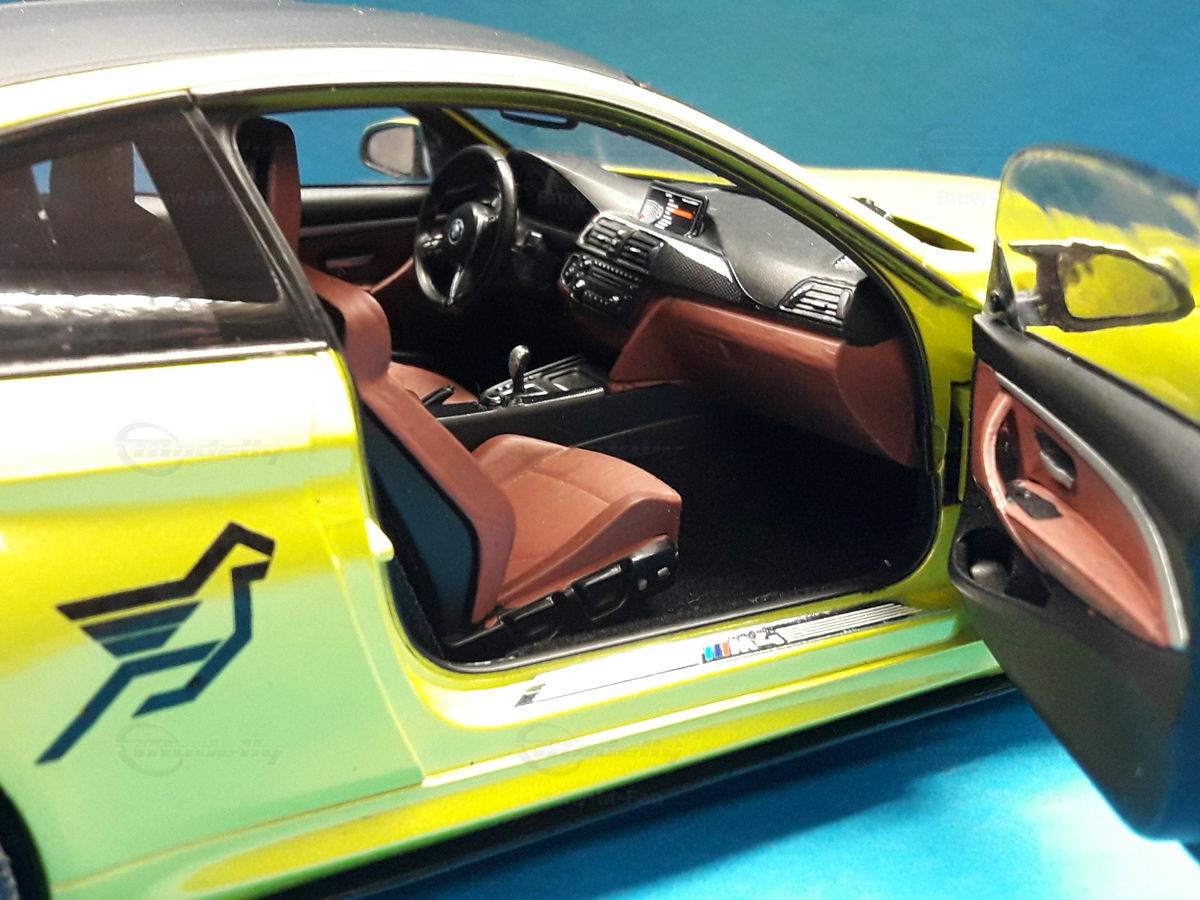 A look inside the interior of the miniature also showcases exquisite detailing. The seats are in a brown hue, adding a touch of luxury and comfort to the interior. The steering wheel, dashboard, and other significant details have been accurately replicated to provide an authentic representation of the original. Similar to the real models, the doors, hood, and trunk have movable parts, making the model a fascinating replica of the BMW F82 M4.