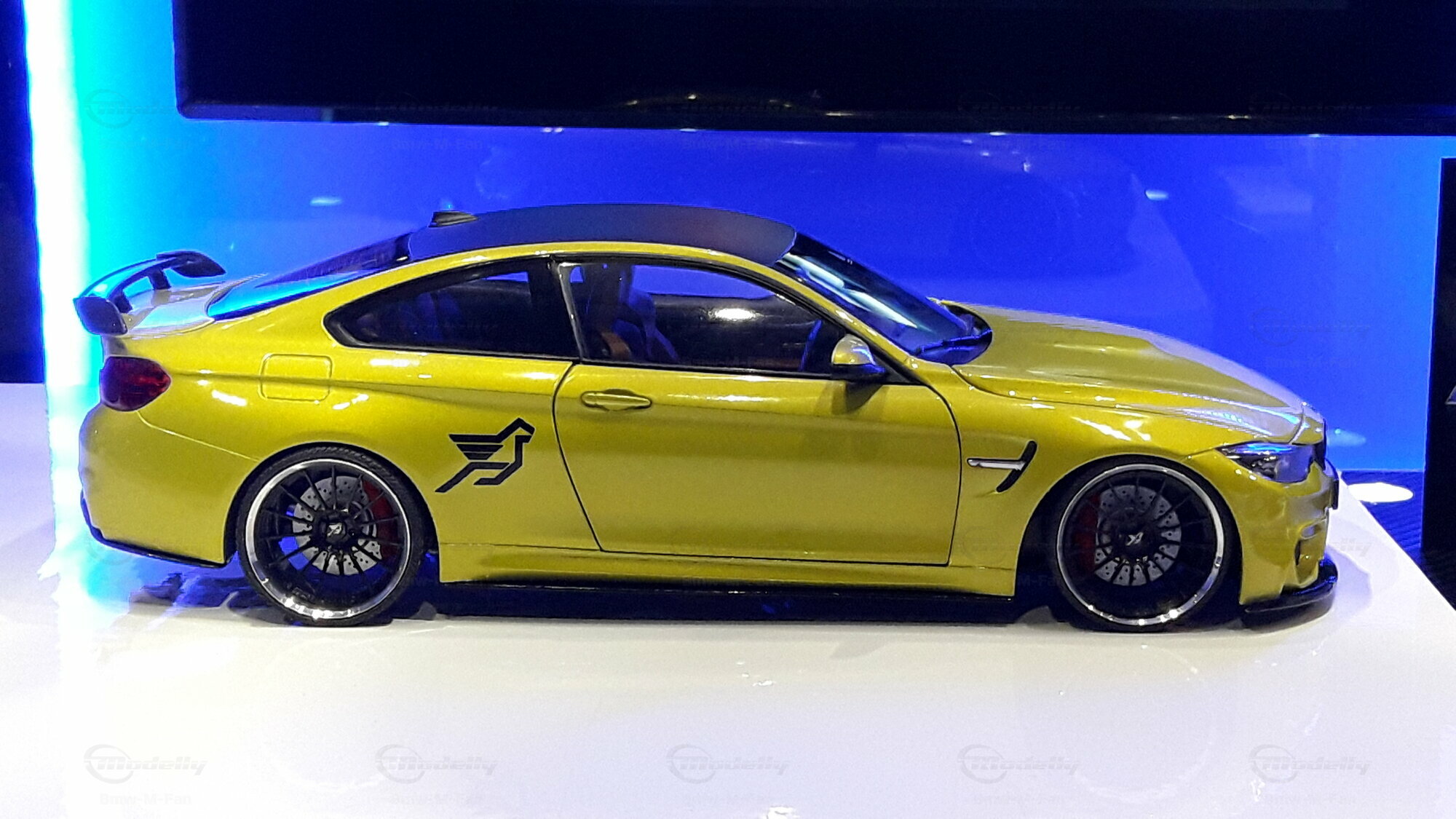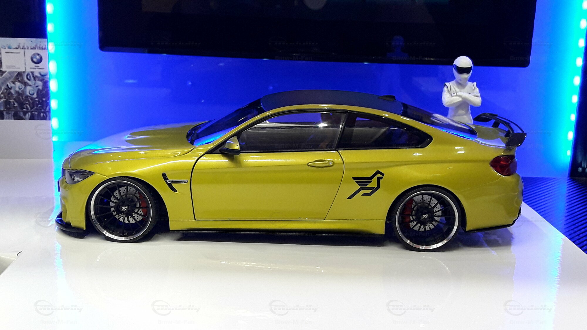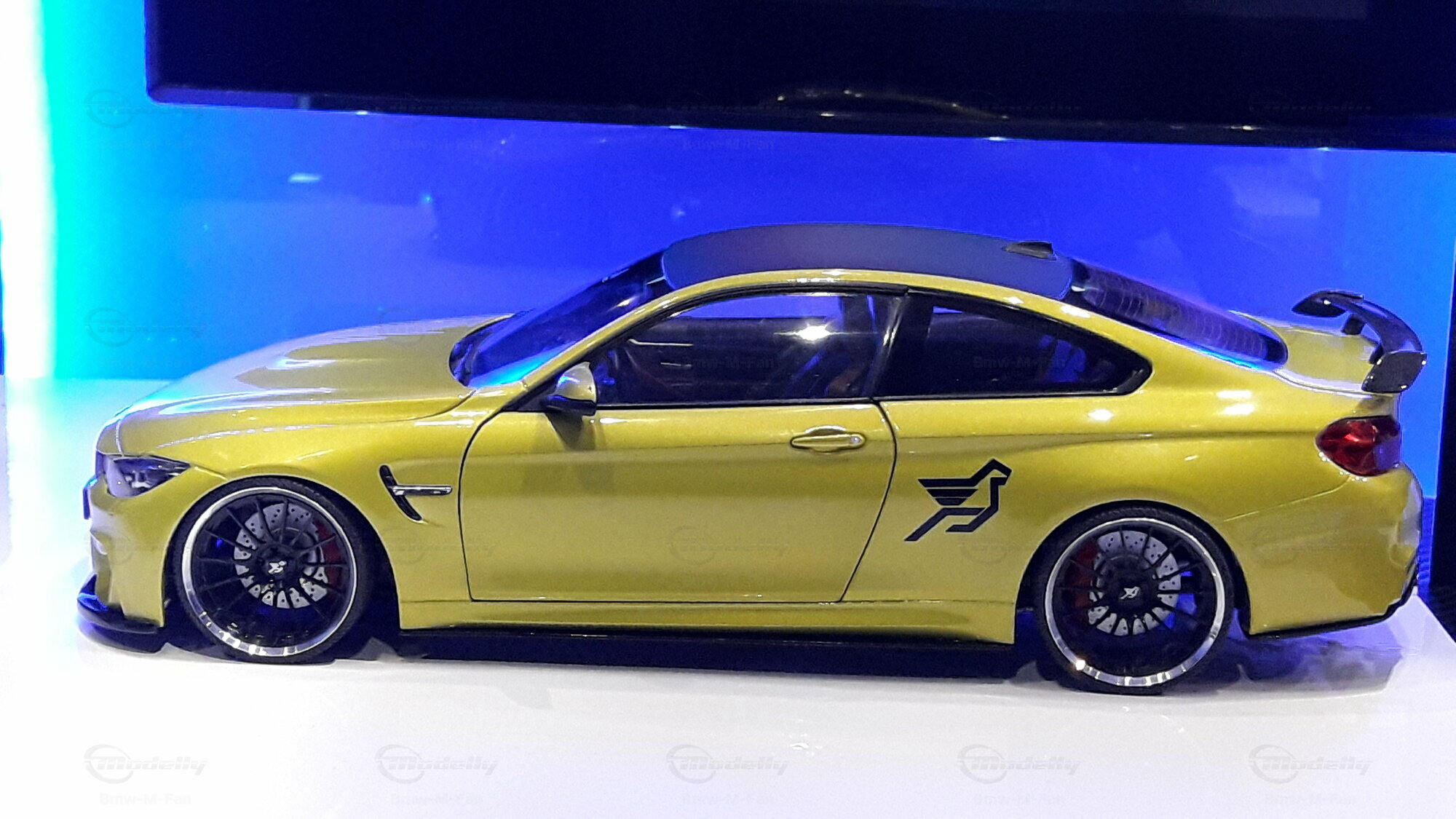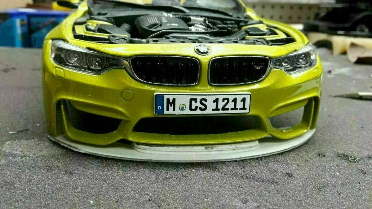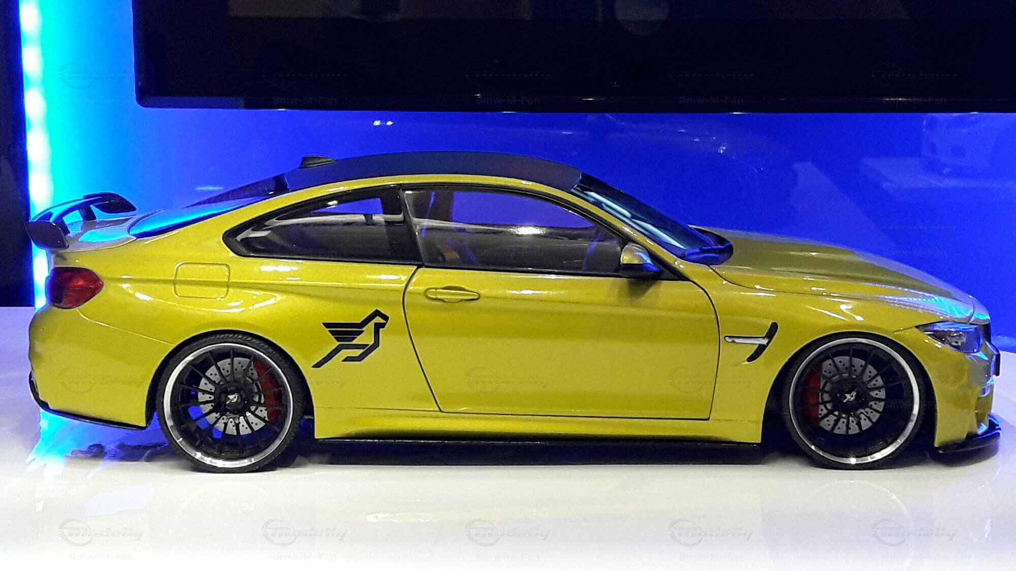 The miniature depicted is a 1/18 scale model car manufactured by Paragon Models. The miniature is based on the BMW F82 M4 and is crafted from Diecast material. These model cars are popular among collectors for their detailed replication and high-quality craftsmanship. It should be noted that this specific model has been modified post-production and no longer represents the original product from Paragon Models. For the collector, this presents a unique piece with individual customizations that make the model stand out.