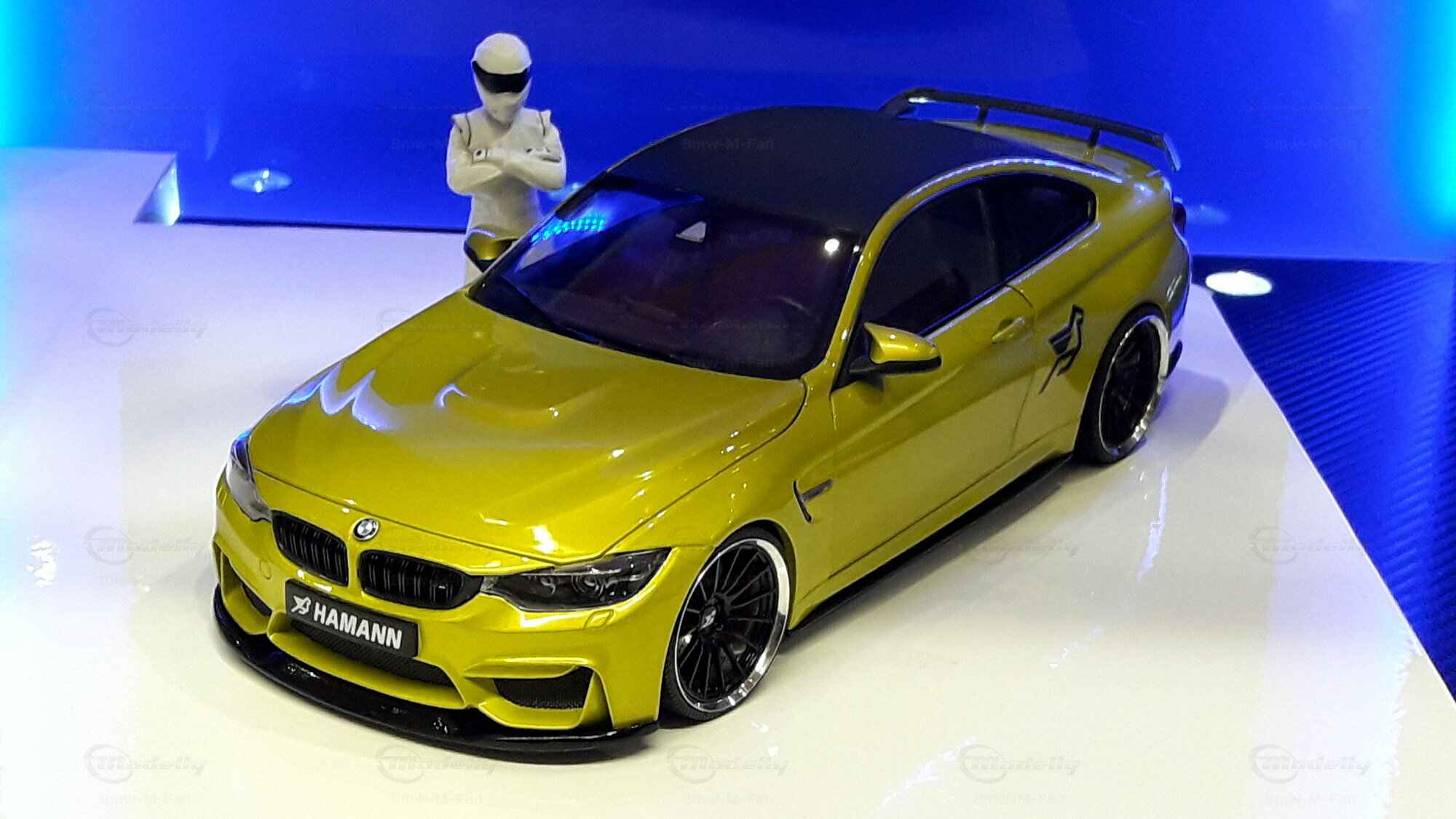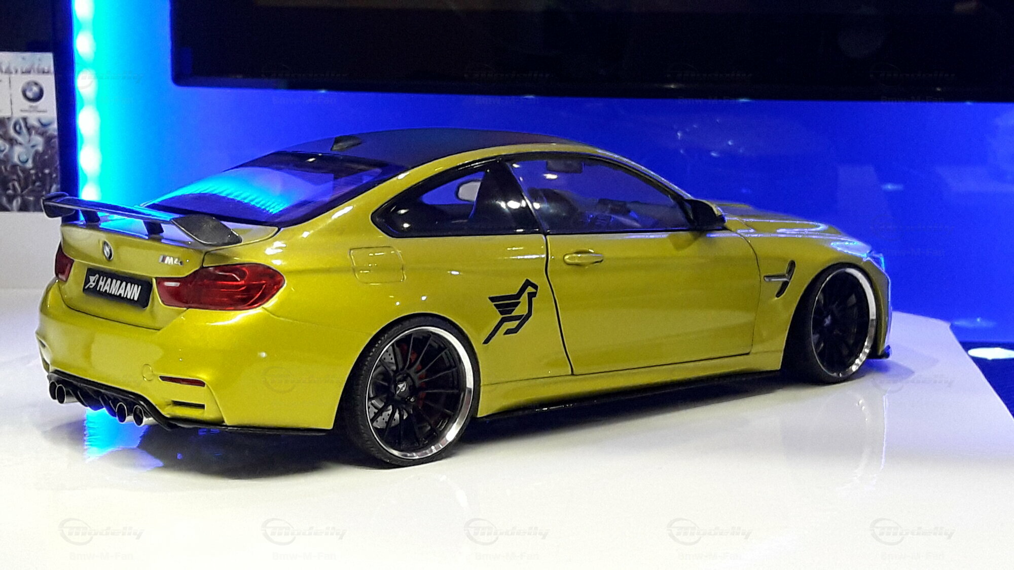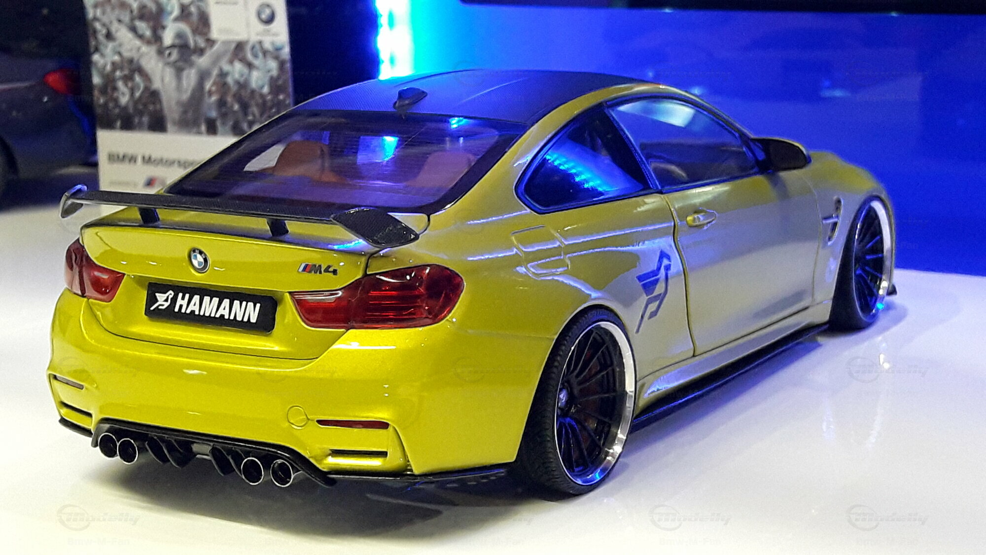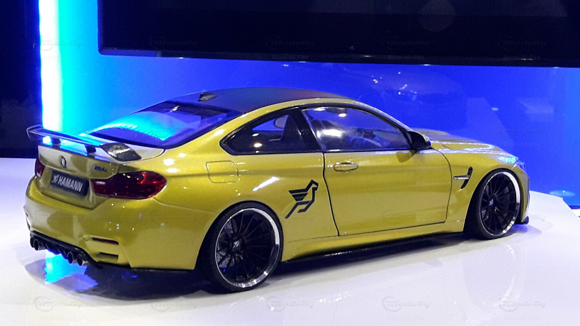 This particular model, owned by Modelly member "Bmw-M-Fan," features a variety of modifications. Noticeable is the vehicle's paint job. The car body has been painted in a special gold-yellow color that exudes a metallic sheen and striking aesthetics. Additionally, black accents have been added, providing a beautiful contrast to the primary paintwork. On the side of the vehicle, the logo of the tuning company Hamann is visible. This German company was founded in 1986 in Laupheim and is known for its exclusive vehicle enhancements. The added rear wheel spokes and lowered suspension are also distinctive modifications by Hamann.