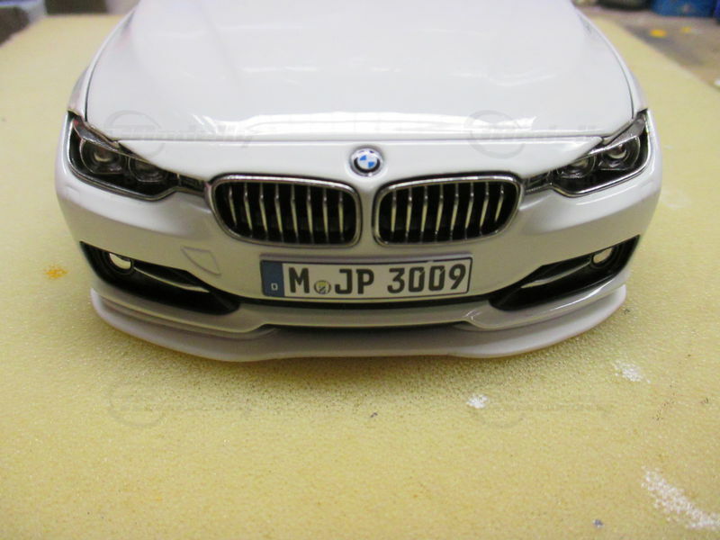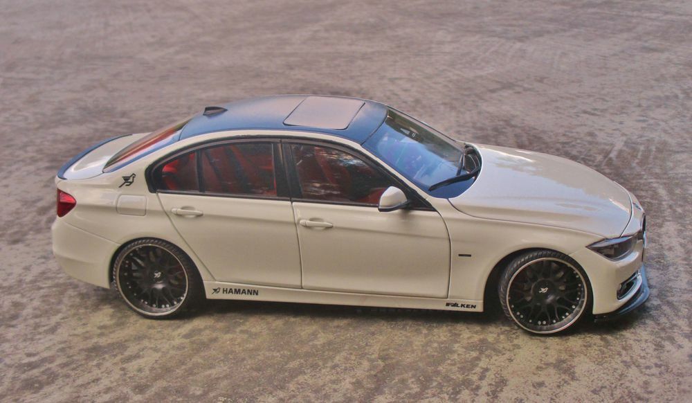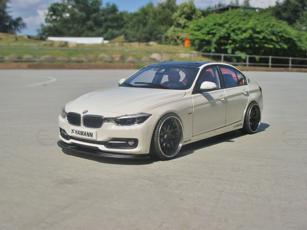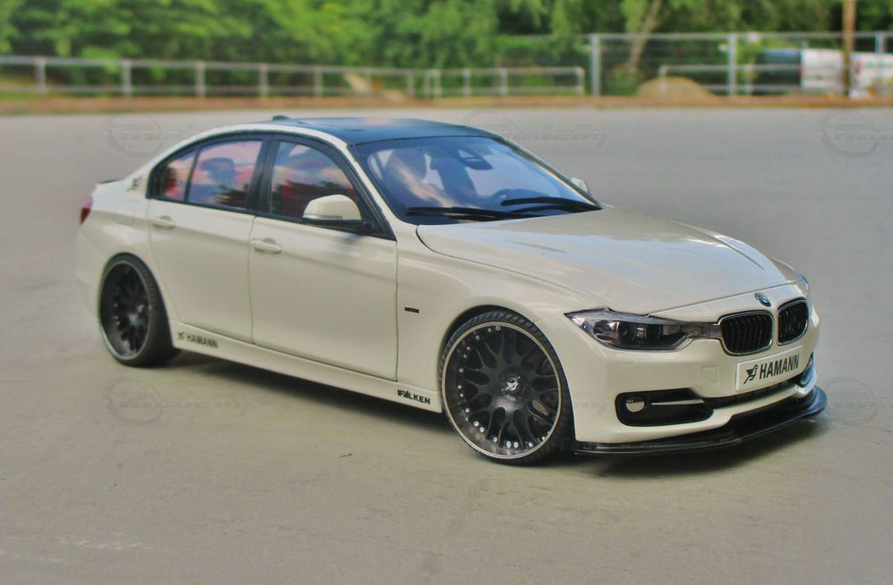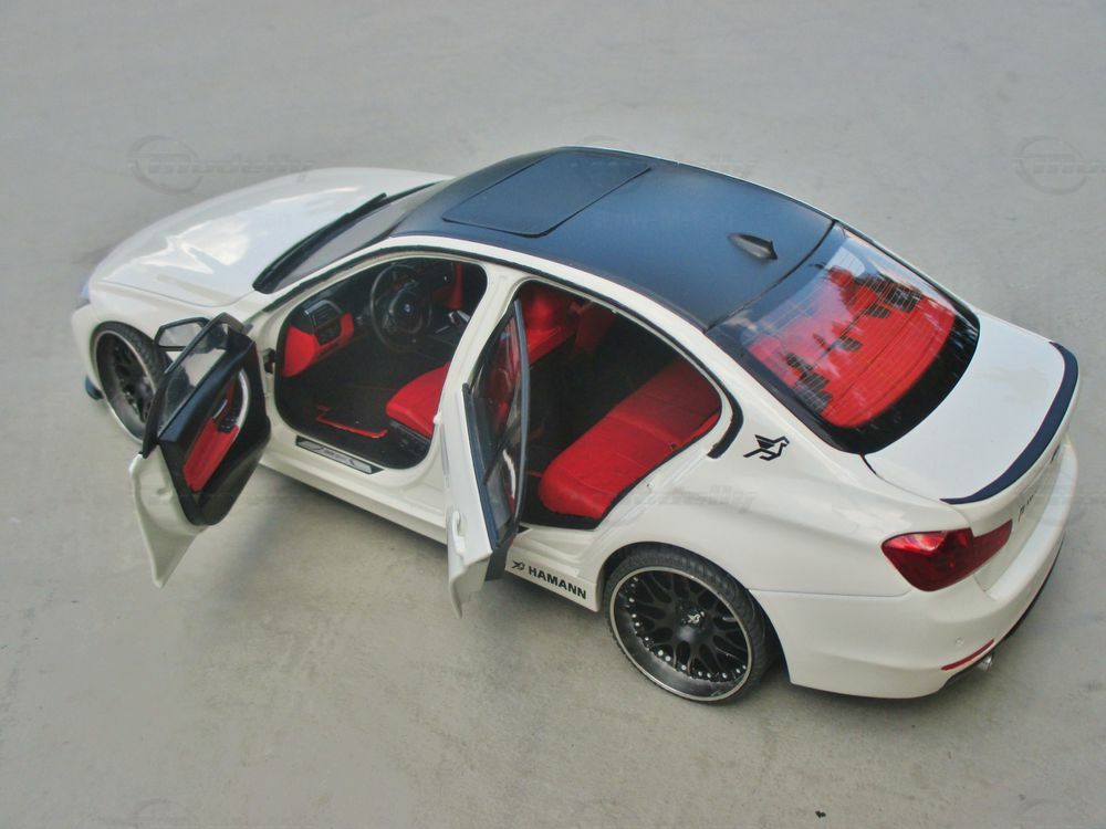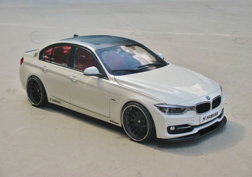 The model car depicted here in a 1/18 scale, manufactured by Paragon, represents a modified version of the BMW F30 335i. This is not the originally produced product by the manufacturer. The most noticeable modifications include the tuning kit from Hamann, which is clearly visible through the front spoiler, side skirts, and rear spoiler. These attachments give the model a sportier look and a pronounced aggressiveness. "Hamann" logos are printed on the side skirts and the front lower spoiler, indicating the customization by this specialized tuning company.