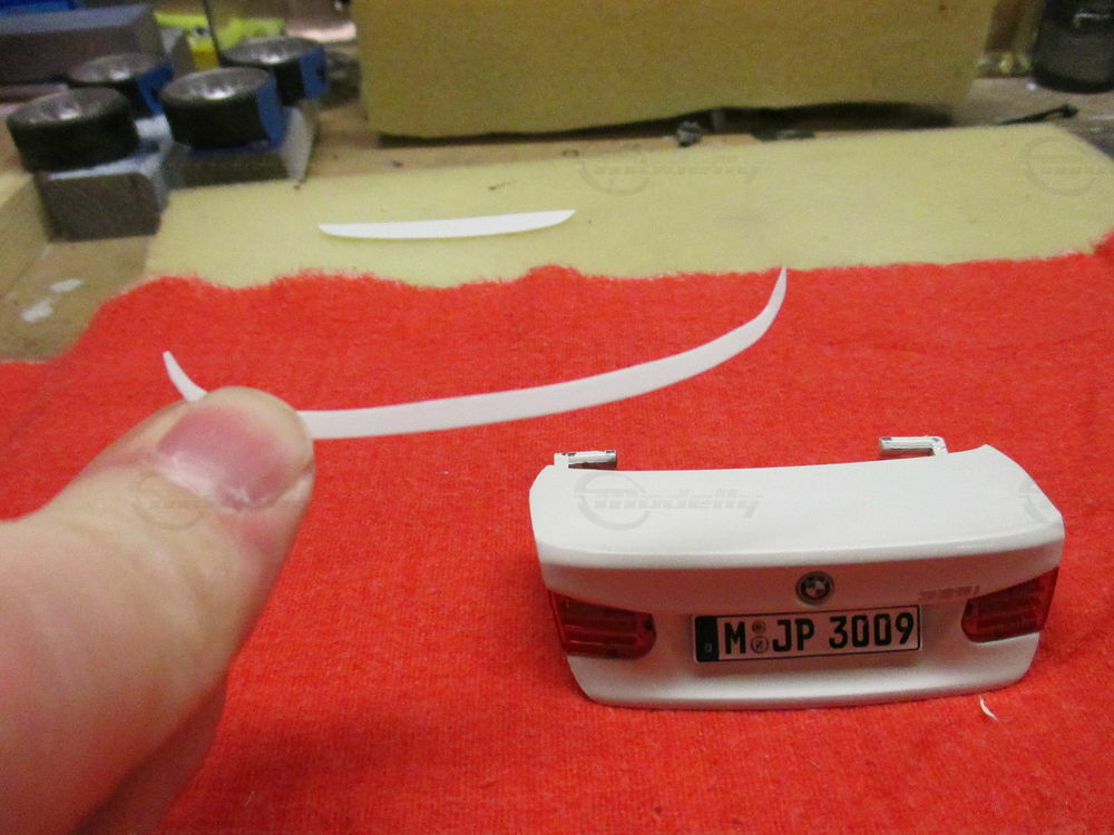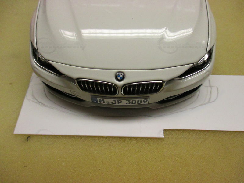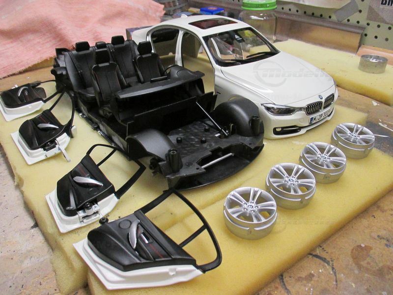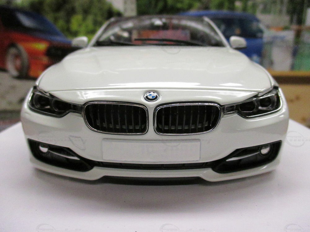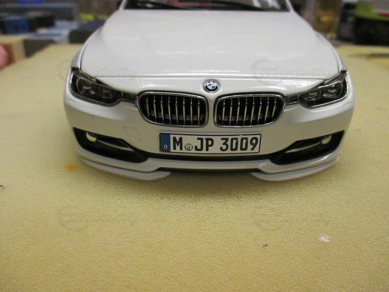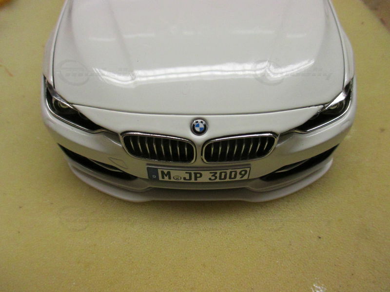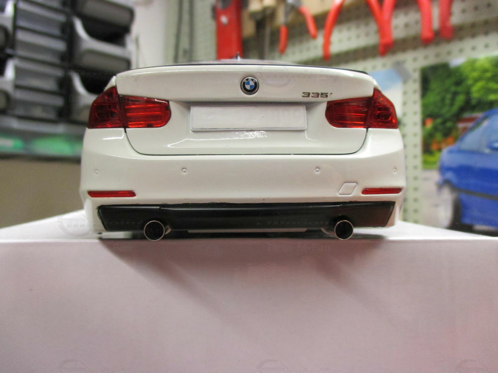 The model car depicted here in a 1/18 scale, manufactured by Paragon, represents a modified version of the BMW F30 335i. This is not the originally produced product by the manufacturer. The most noticeable modifications include the tuning kit from Hamann, which is clearly visible through the front spoiler, side skirts, and rear spoiler. These attachments give the model a sportier look and a pronounced aggressiveness. "Hamann" logos are printed on the side skirts and the front lower spoiler, indicating the customization by this specialized tuning company.