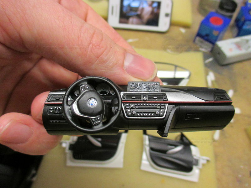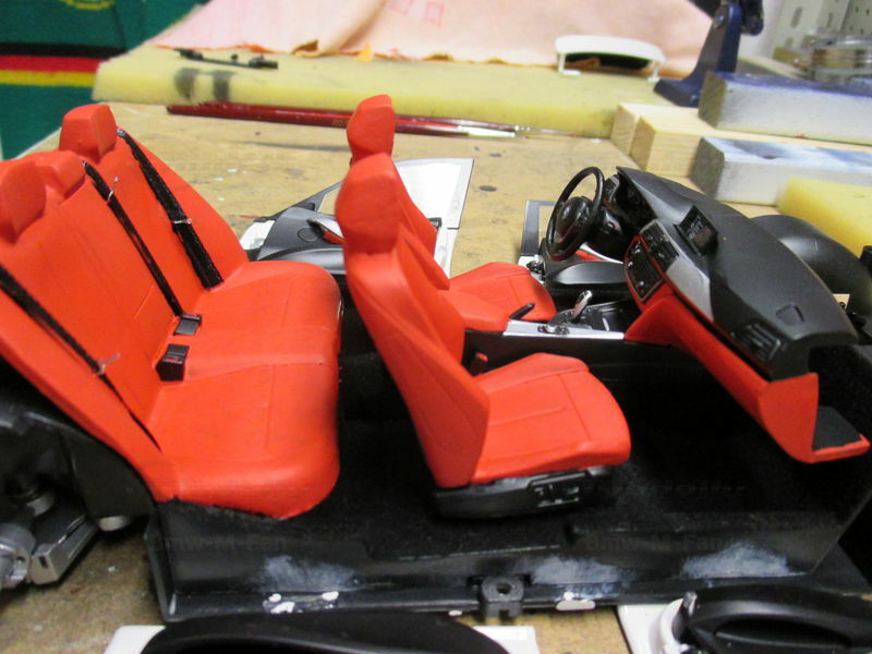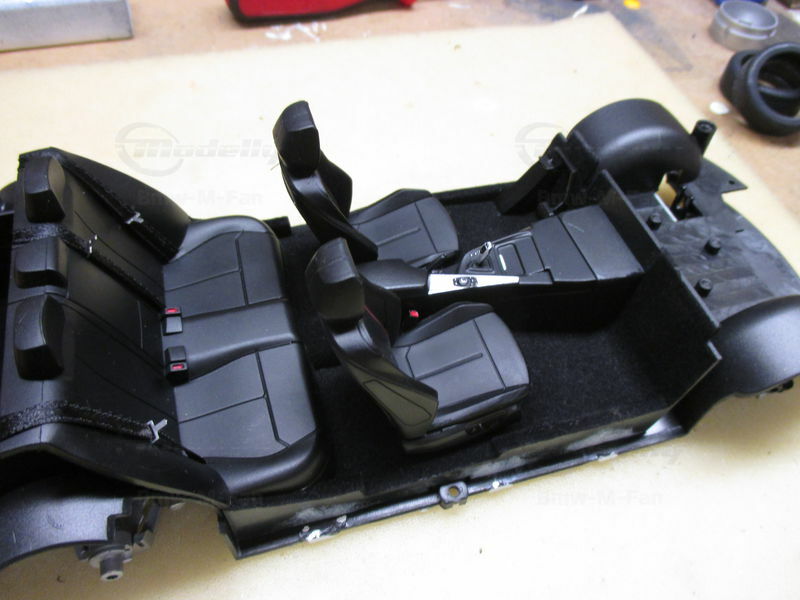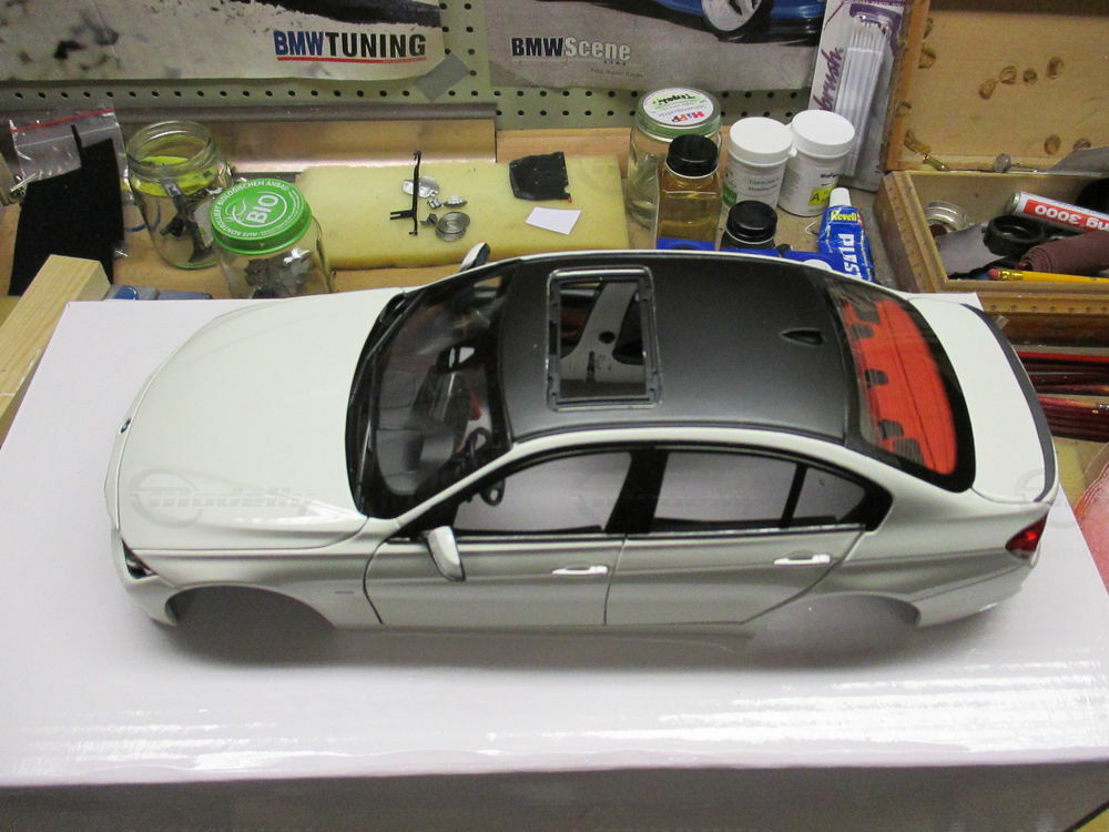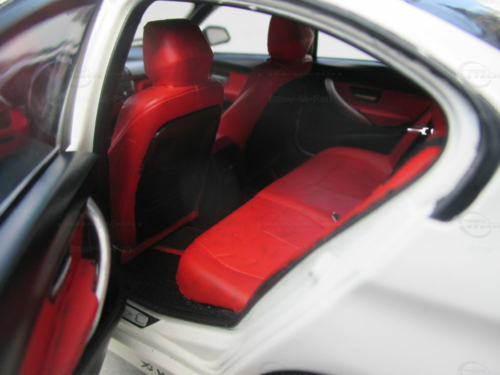 The model car features a white paint job combined with a black roof and red interior details, visible through the windows. The contrast between the white body and the black roof gives the vehicle a striking appearance. Additionally, high-quality Hamann wheels are installed, which are kept in a plain black color and complement the sporty overall look. The mirror caps and window frames in high gloss are also noticeable, harmoniously completing the exterior. These details make the model car a particularly attractive collector's item for BMW and model car enthusiasts worldwide.