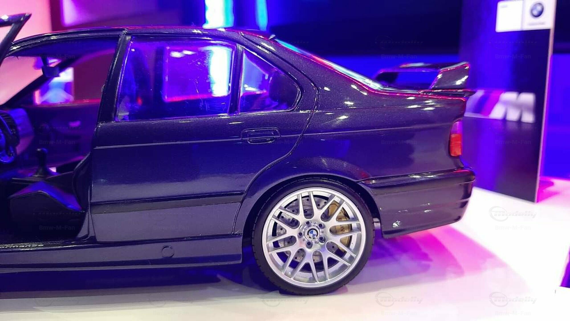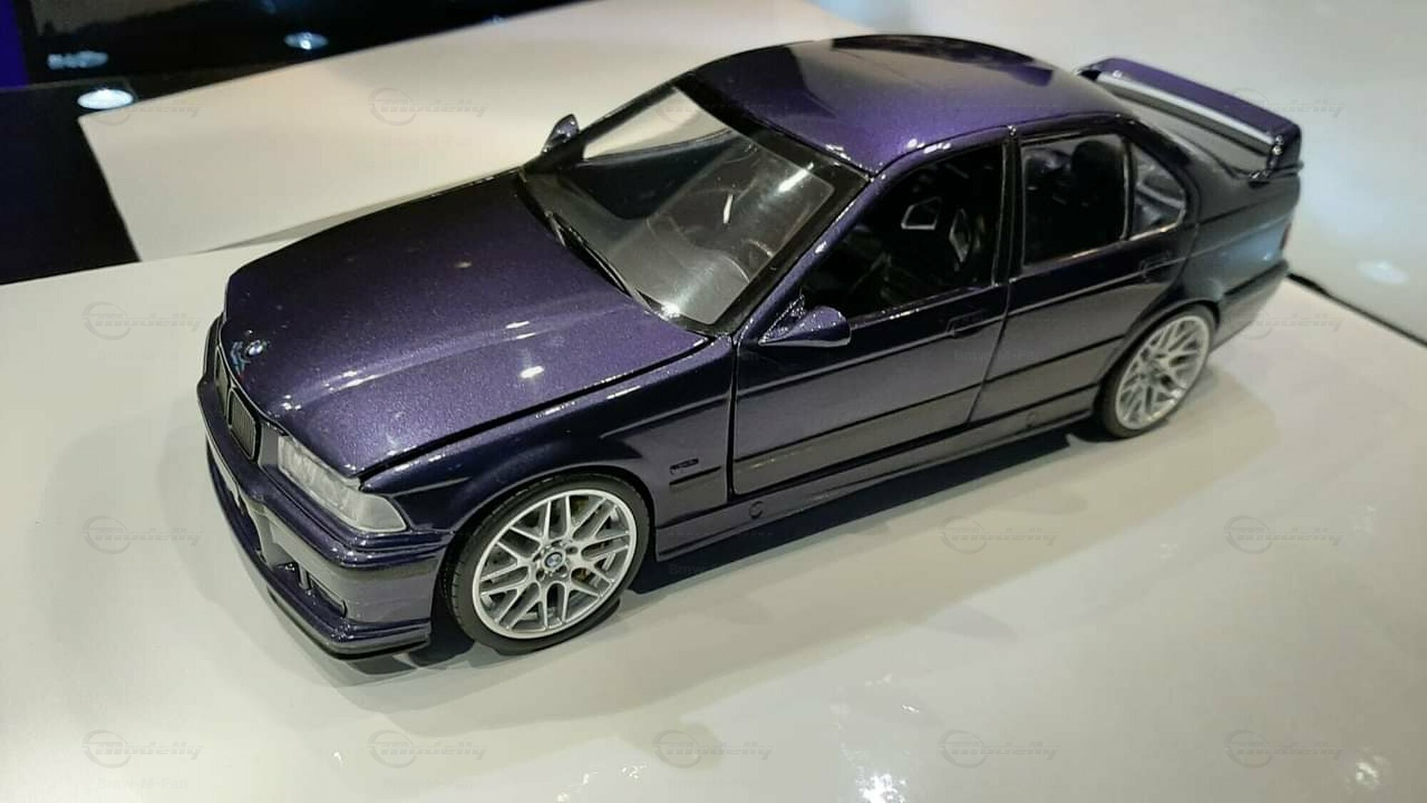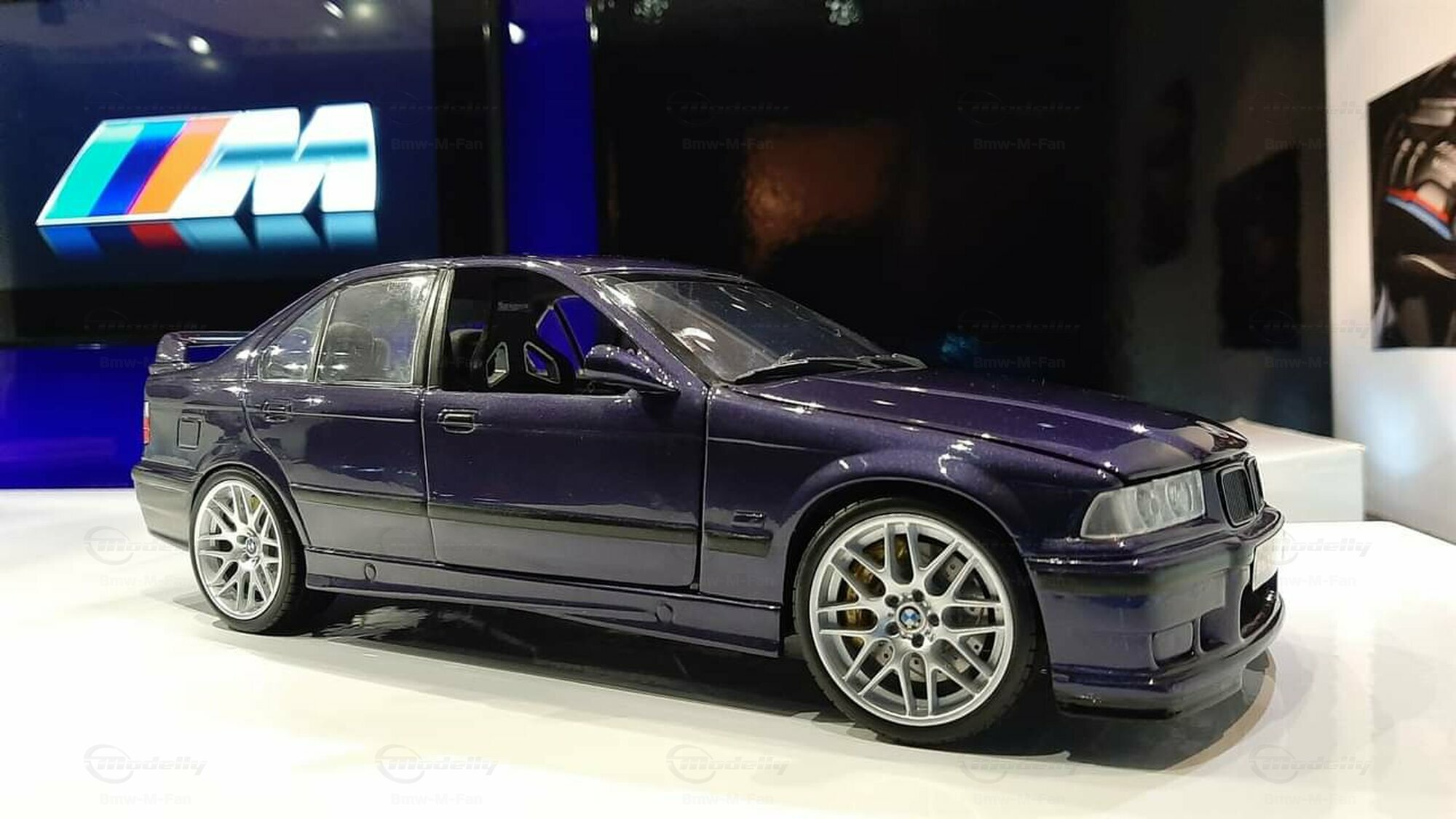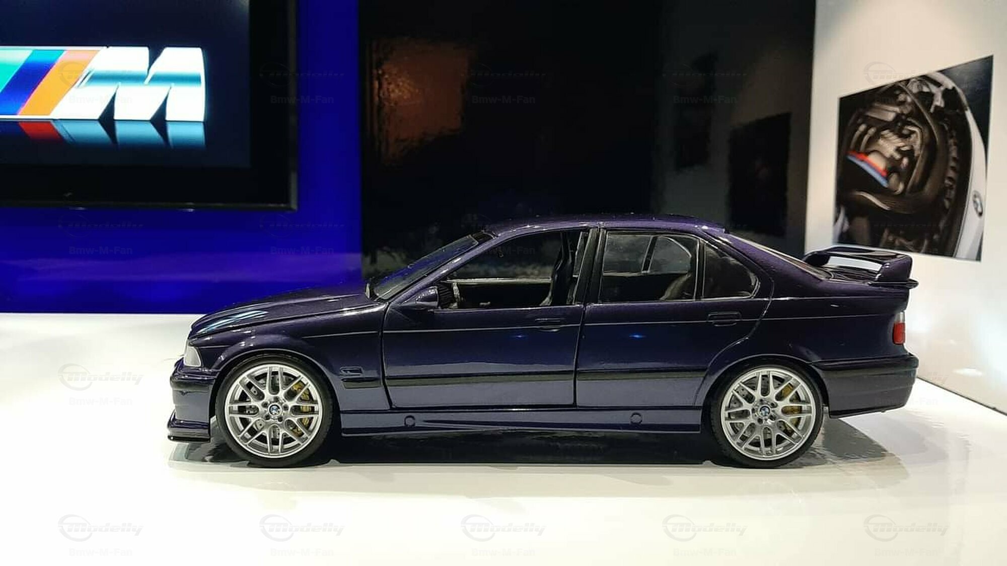 The model featured here in a 1/18 scale is a super detailed replica of the legendary BMW E36 M3 Sedan, made by UT-Models. This diecast miniature captures the elegance and precision that collectors around the globe love. Just a heads-up: the showcased model has been modified, so it doesn't represent the original product by UT-Models. Notable modifications include the snazzy BBS wheels that give the model a unique flair. The deep metallic blue paint job adds an extra touch of finesse.