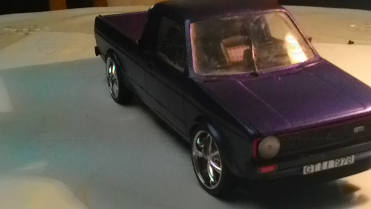 The model car shown stands out for its striking metallic blue paint job, which is sure to catch the attention of the model car collector community. The chrome rims visible in the photos could be a hint that the wheels are a product of a well-known manufacturer and possibly that the Logitech model was fitted by the company Borbet. The detailing of the model is impressive, especially concerning the faithful reproduction of the headlights and taillights that stay true to the proportions and details of the Volkswagen Caddy 1. Even the small details like the license plate inscription "GTI 1978" add authentic accents. Overall, this modified 1/18 scale resin model of a Volkswagen Caddy 1 offers a precise and lovingly crafted replica for collectors and enthusiasts of historical vehicles.