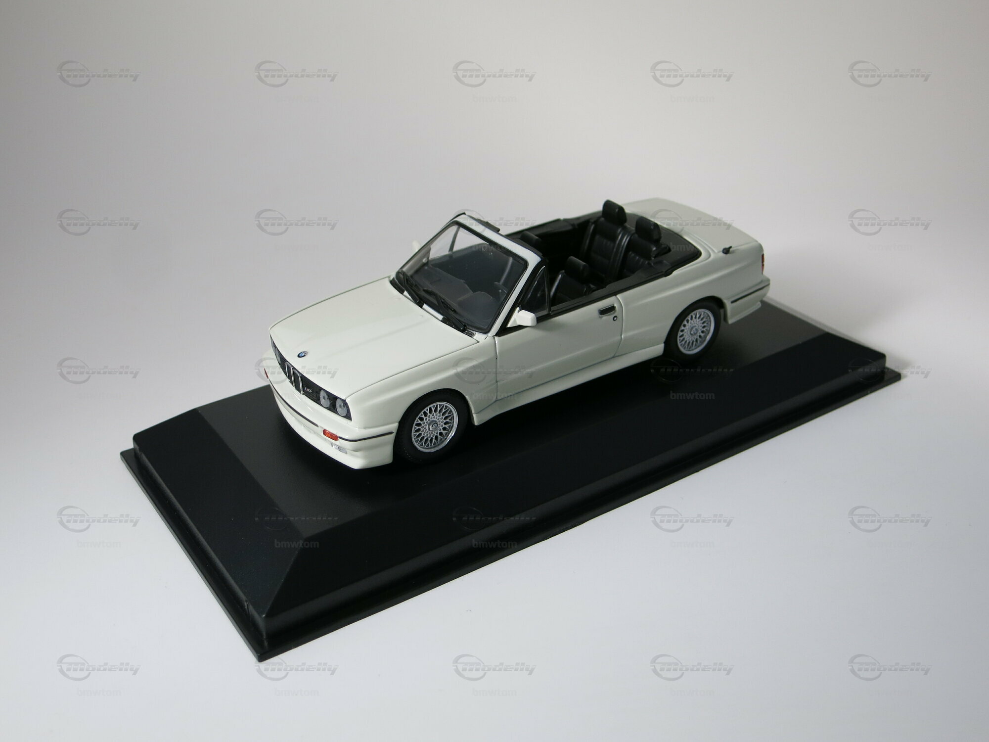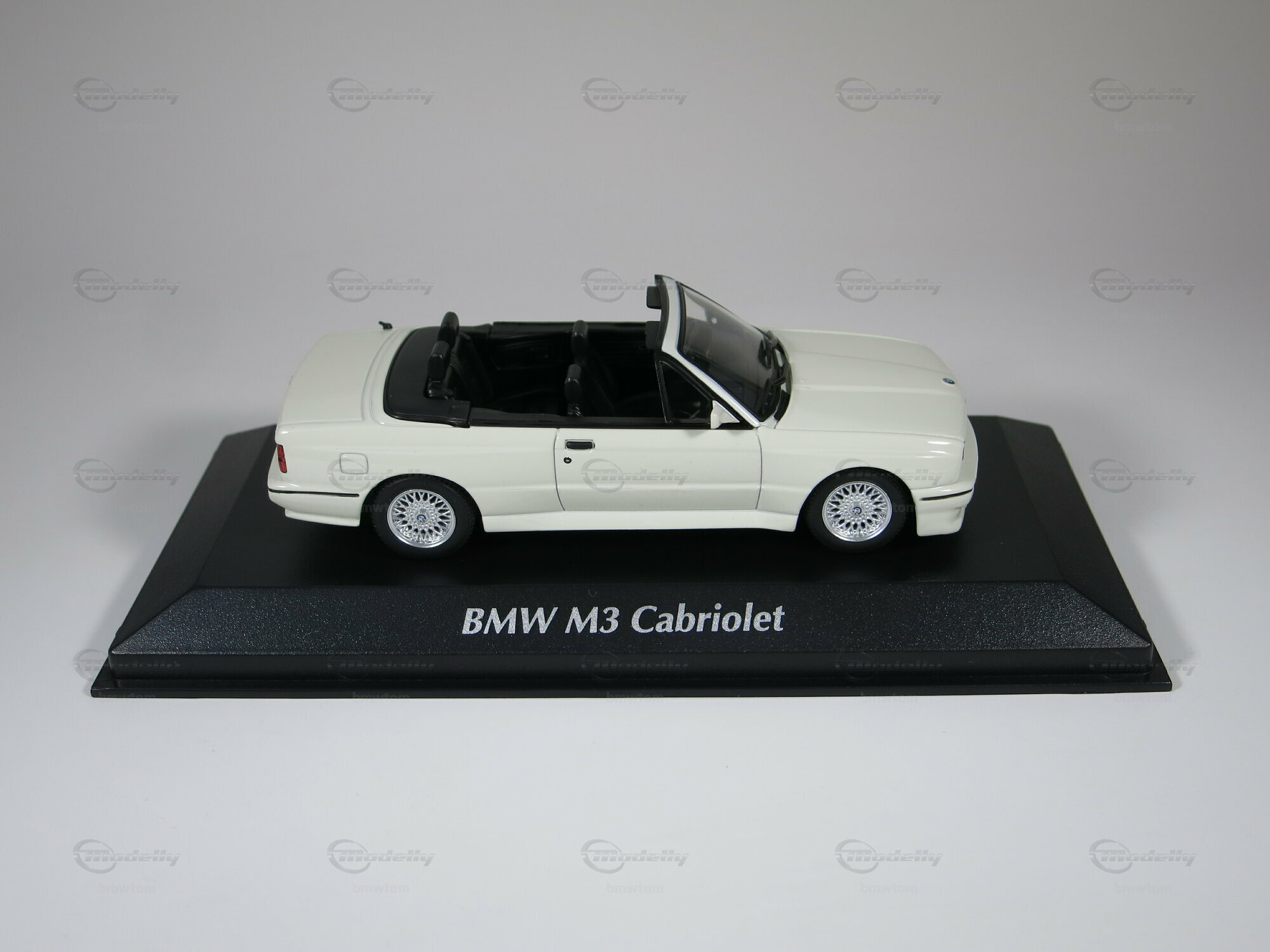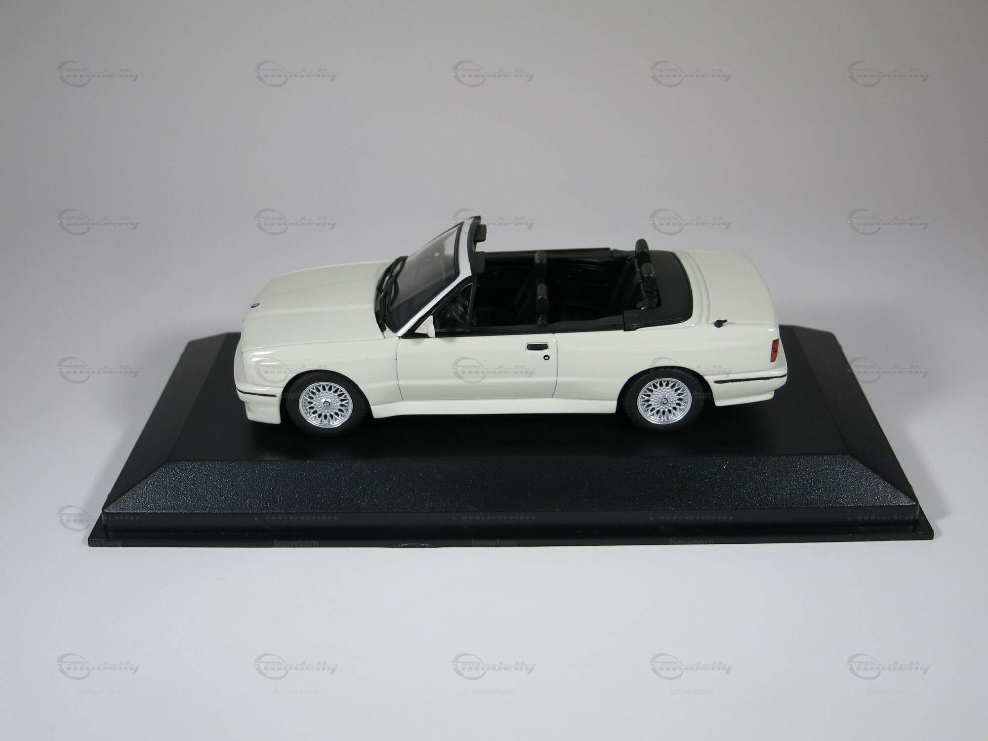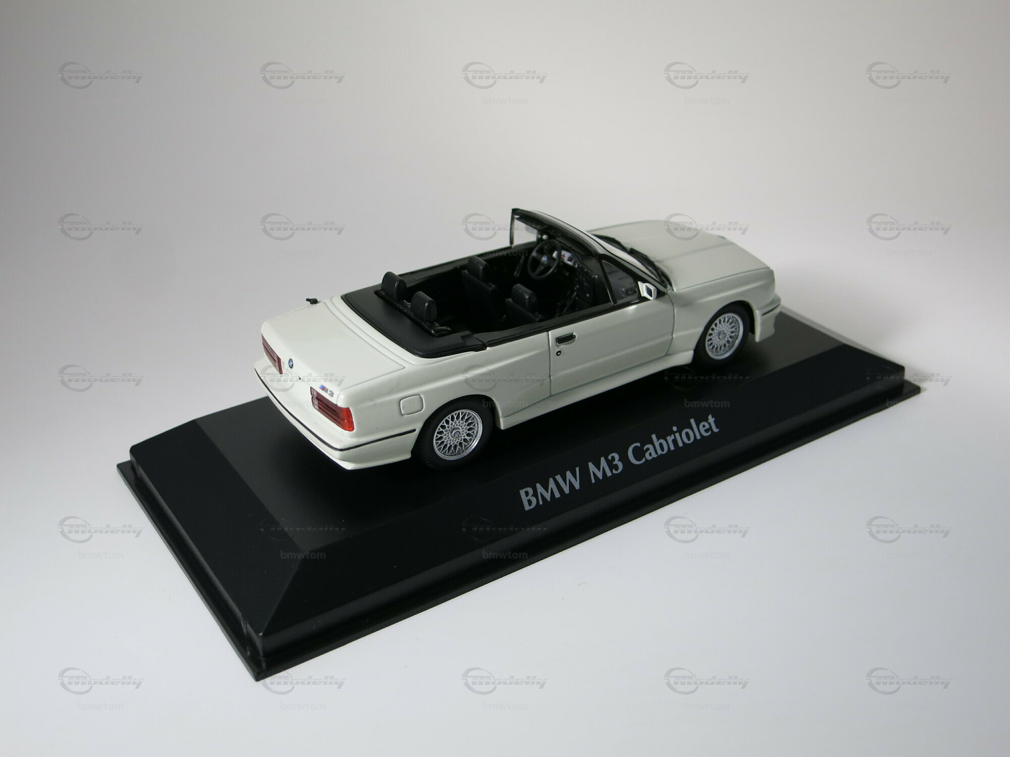 This model car by Maxichamps in 1/43 scale is mainly made of diecast, providing stability and durability. The classic white paint job is carefully applied, giving it an authentic feel. The black interior is finely detailed, including the cockpit, steering wheel, and seats. The replica wheels are eye-catching and closely resemble the original cross-spoke wheels of the BMW M3 Cabriolet. All logos and badges, including the BMW logo on the hood and the M3 logo on the trunk, are neatly executed. This model is part of the collection from Modelly member "bmwtom." If you have a thing for the E30 series, you’ll definitely enjoy this piece, as it reflects every detail of the legendary car.