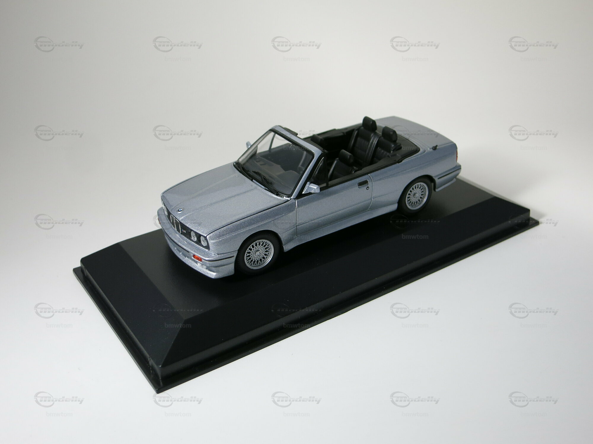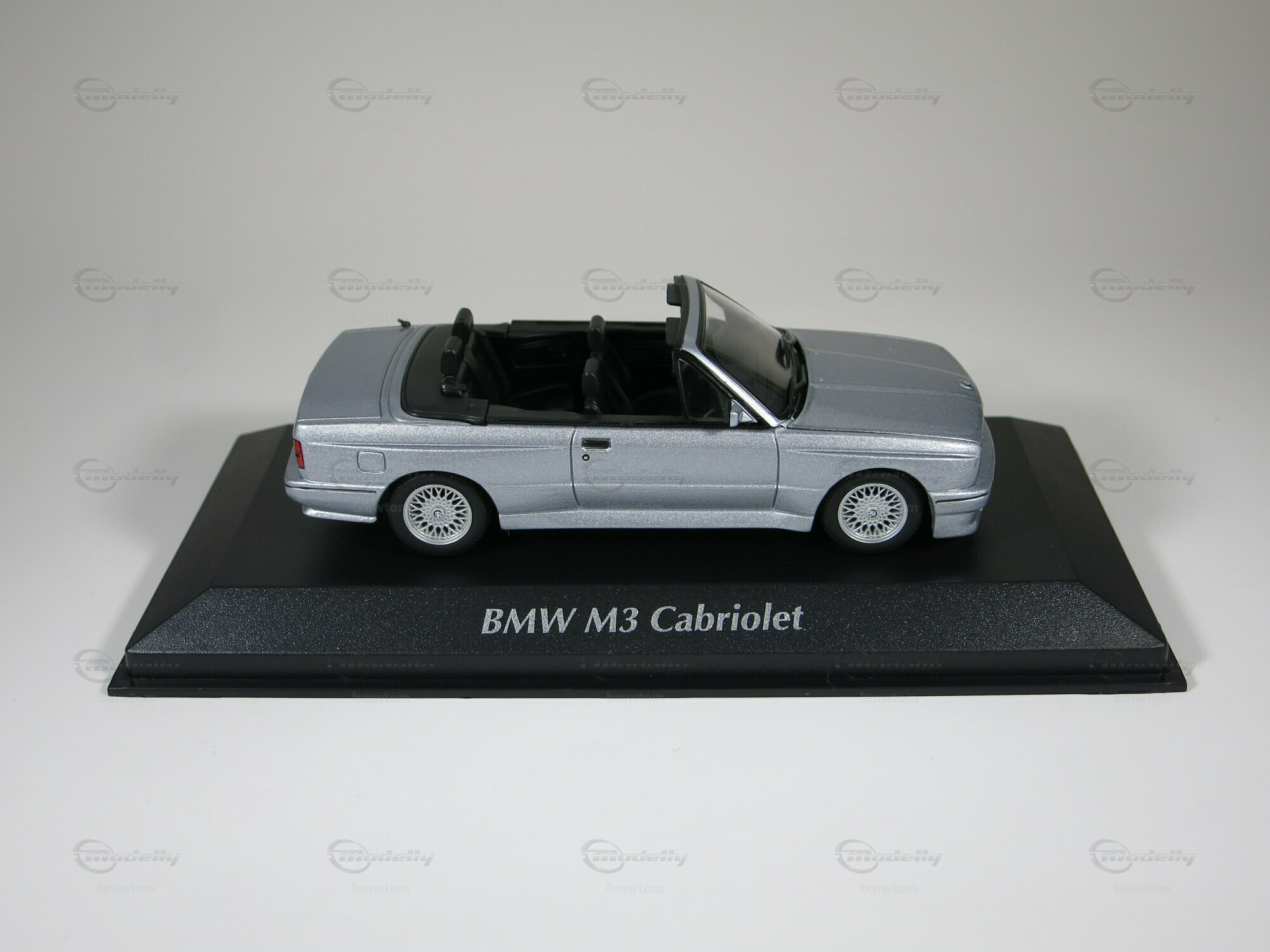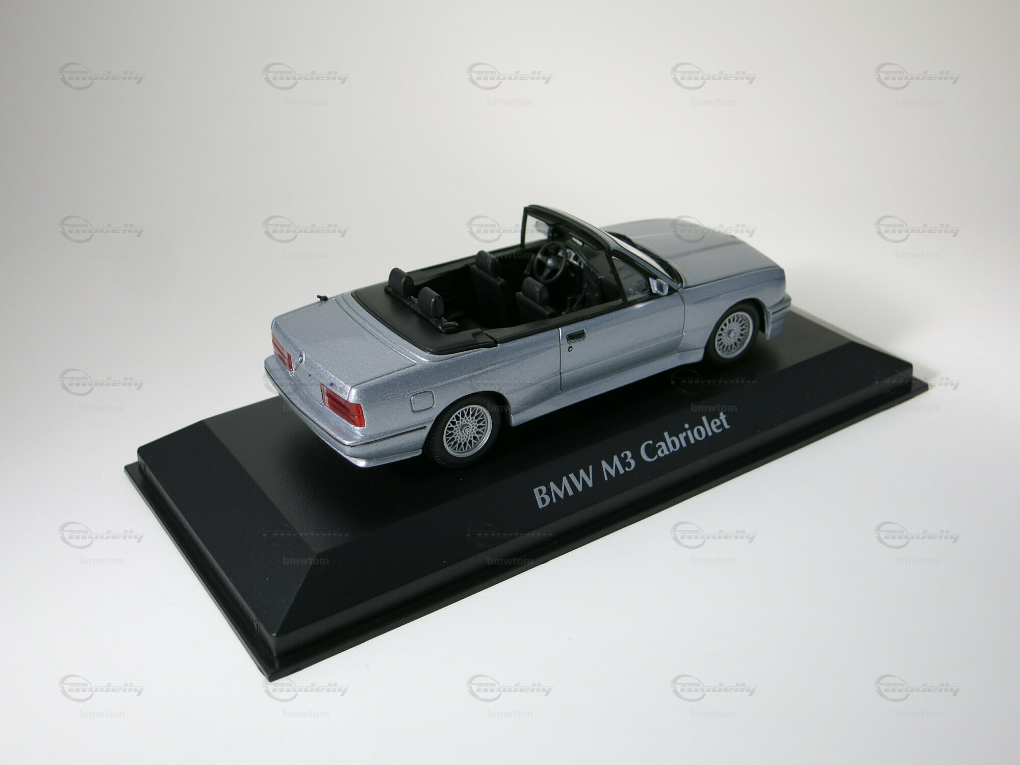 The model shown here in 1/43 scale from the collection of model fan "bmwtom" is crafted by Maxichamps from diecast material. The miniature perfectly replicates lots of details from the original. The sleek and aerodynamic body of the BMW M3 Cabriolet is painted in a silver finish that impressively highlights its elegant shape. The detailed wheels, likely meant to resemble the iconic BMW cross-spoke wheels, really stand out. The black accents in the interior are also spot-on, just like the well-defined headlights and that iconic kidney grille. The finely crafted taillights and touches on the rear end showcase the high level of precision that went into making this model.