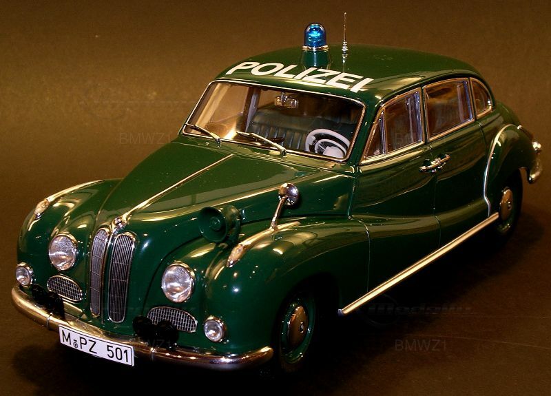 Miniature collector "BMWZ1" showcases an amazing model in 1/18 scale made by AUTOart. This spot-on replica wows with its accurate depiction of the proportions and details of the historical police car. Notably, the blue light on top and the white “POLICE” lettering on the roof emphasize its official status. The smooth, dark green paint job reflects the car's classic design, and the precise chrome details give the model that extra touch of authenticity. The detailed reproduction of the bumpers and the iconic BMW kidney grille showcases the high-tech level of this model.