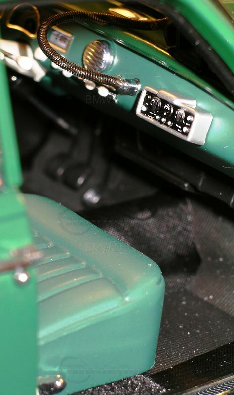 The interior of the original BMW 501 was luxurious and spacious for its time. It boasted plush upholstery and a high-quality dashboard, which the 1/18 scale model from AUTOart faithfully recreates. Every button and instrument is represented with impressive accuracy. The white steering wheel and detailed gauges reflect the 1950s vibe perfectly. This miniature model pays special attention to the technical features and charm of the original, showcasing the luxurious aspects without any over-the-top flair.