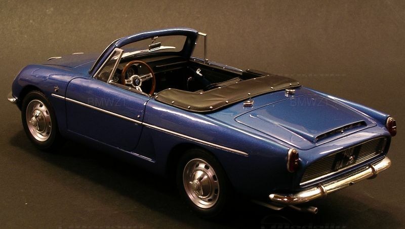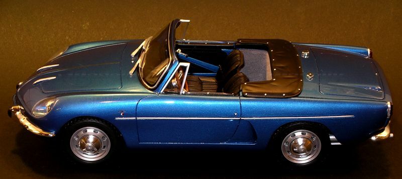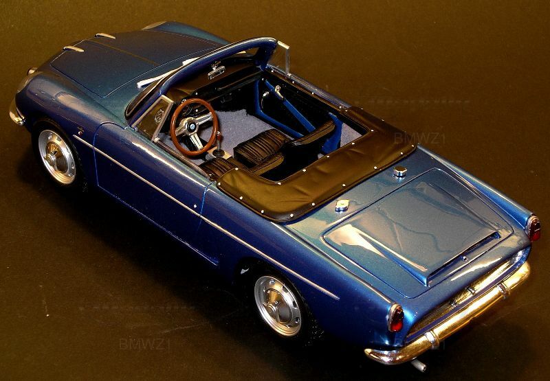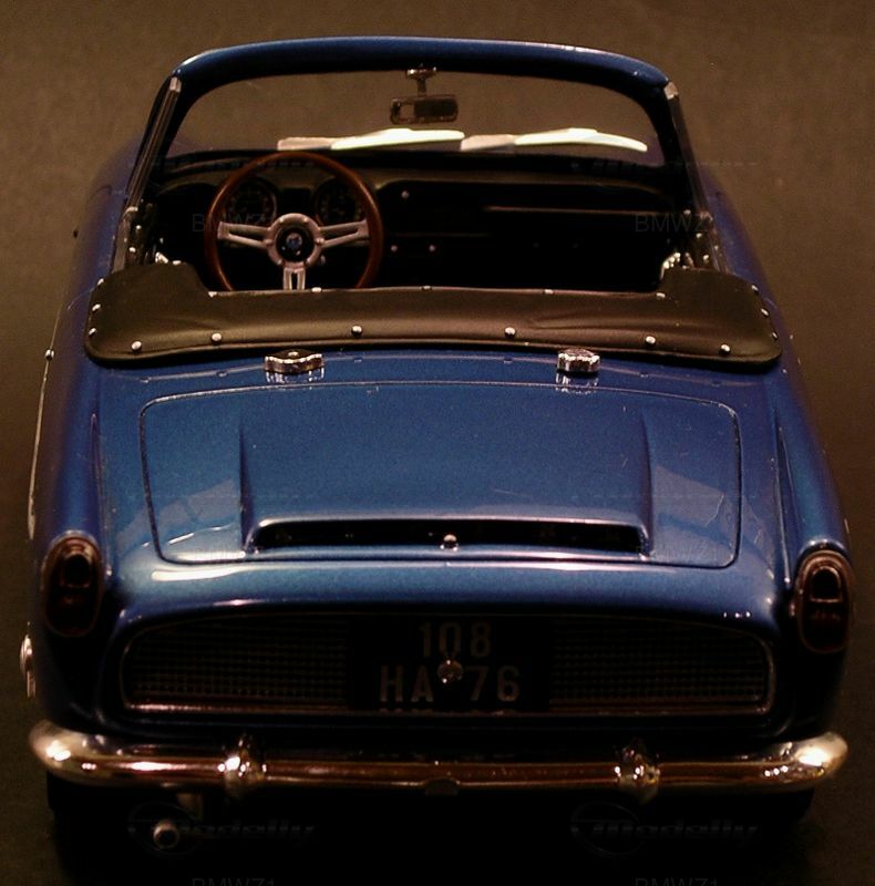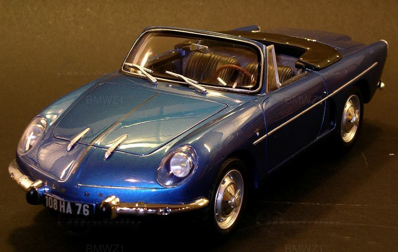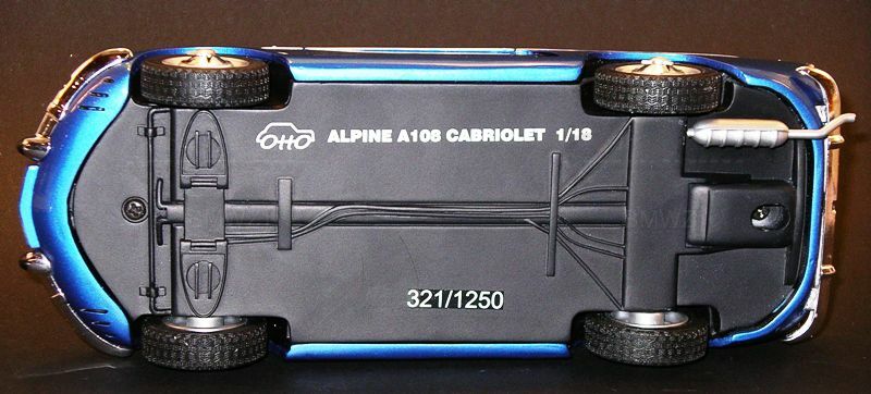 The miniature of the Alpine A108 Cabriolet shown here is a detailed model in 1/18 scale, manufactured by Otto Models. The 1/18 scale ensures that the proportions and details exactly match the original dimensions. This model stands out for its precise replication of the body shapes, lines, and curves. The cotton blue paintwork reminiscent of the classic 1960s color palette is masterfully applied to the model. The applied emblems and logos, such as the Alpine logo at the front, are clearly visible and blend harmoniously into the overall look. Cat-eye lamps and chrome bumpers complete the authentic appearance of this miniature.