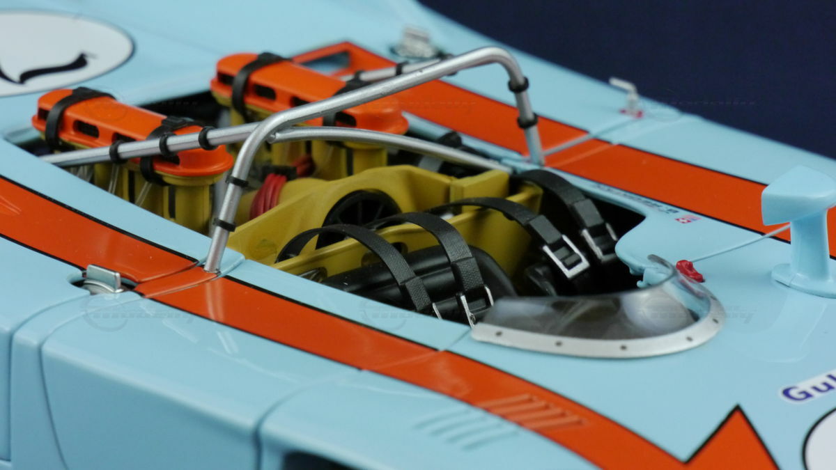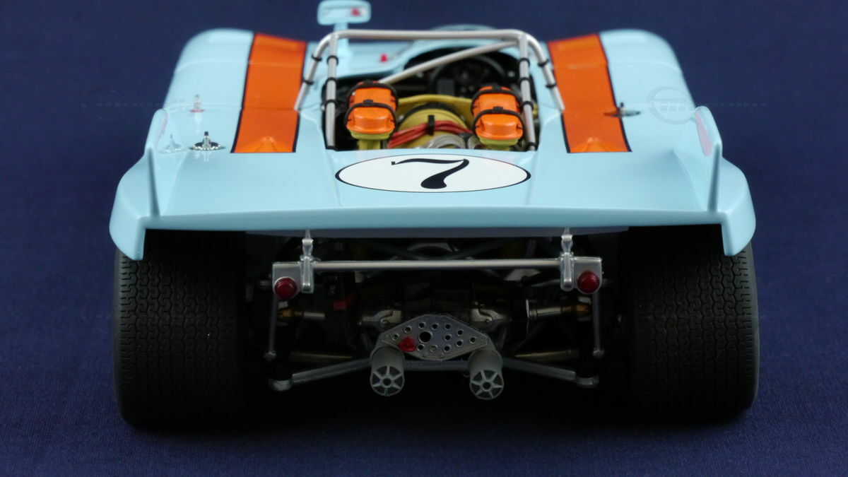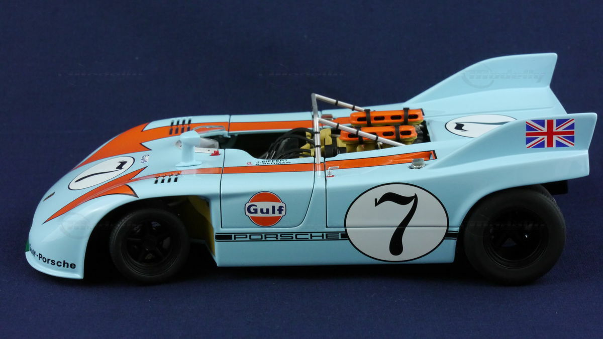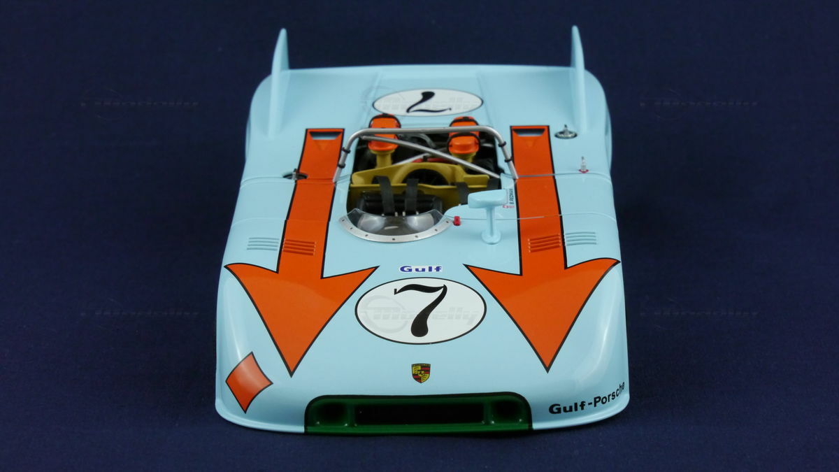 The striking design of the Porsche 908/3 in the Gulf livery is unmistakable. The model's body features a light blue base color with prominent orange stripes. This livery was the hallmark of Gulf racing cars and is detailed accurately on the model car. Additionally, sponsors like Gulf and BP are prominently displayed on the body, reflecting the original design authentically. The large white round number panels with the number 7 enhance the sporty look of the model.