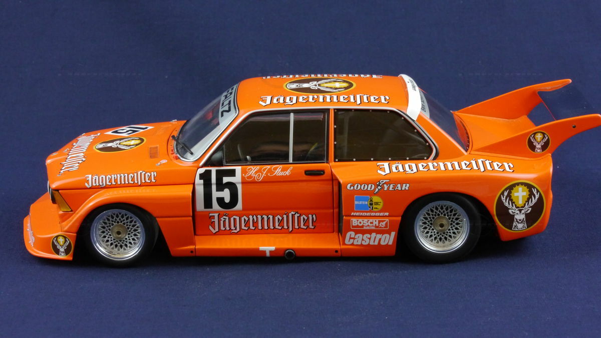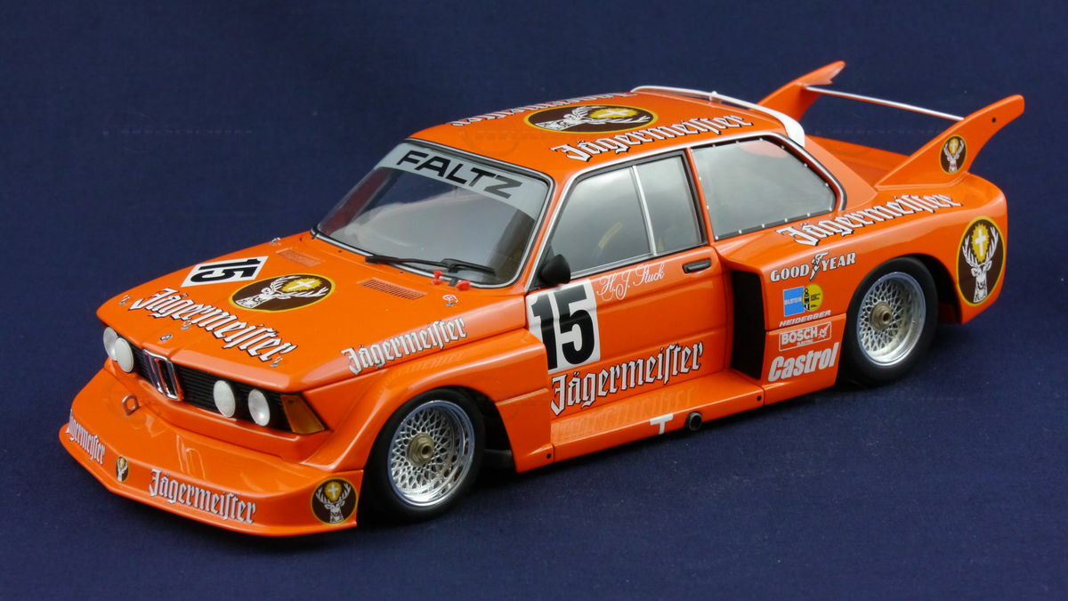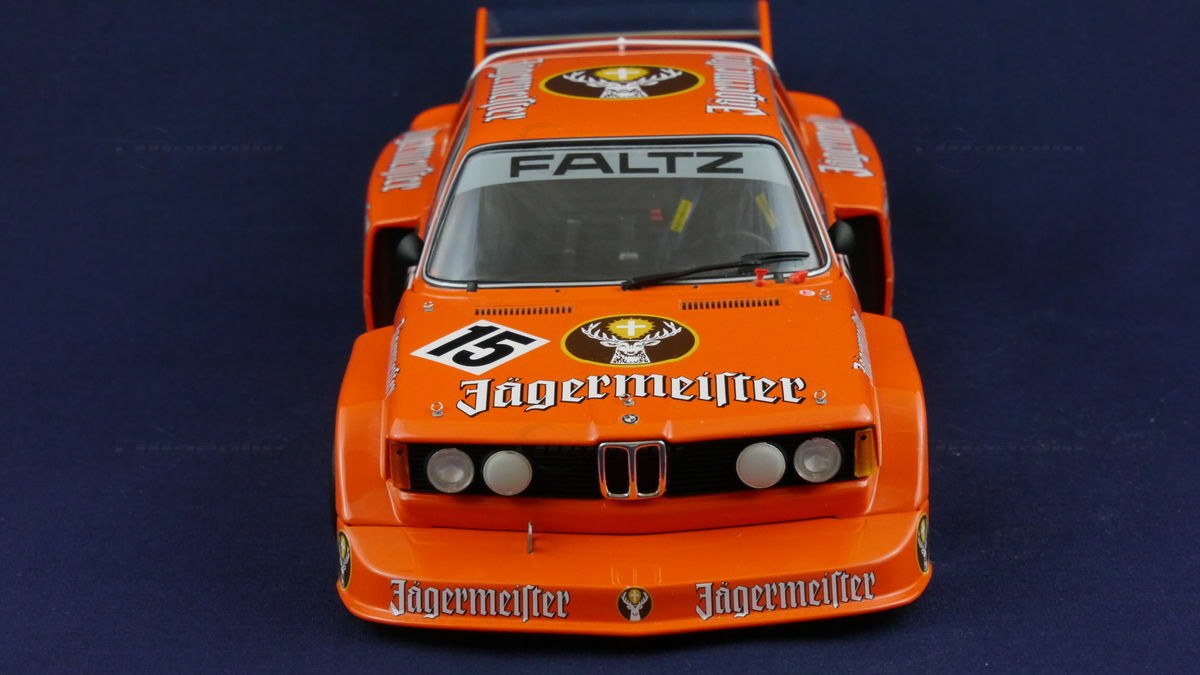 The model car presented here in a 1/18 scale was produced by Minichamps and represents the famous BMW 320i (E21) #15 with impressive attention to detail. Made of die-cast material, it impresses with its sturdy construction and accurate replica of the original vehicle. The model is painted in a striking orange color, just like the real racing car. The primary sponsor's branding of Jägermeister is prominently displayed, as are the additional sponsor logos of Castrol and Goodyear. The model showcases a detailed replication of the interior, including race seat and safety belts.