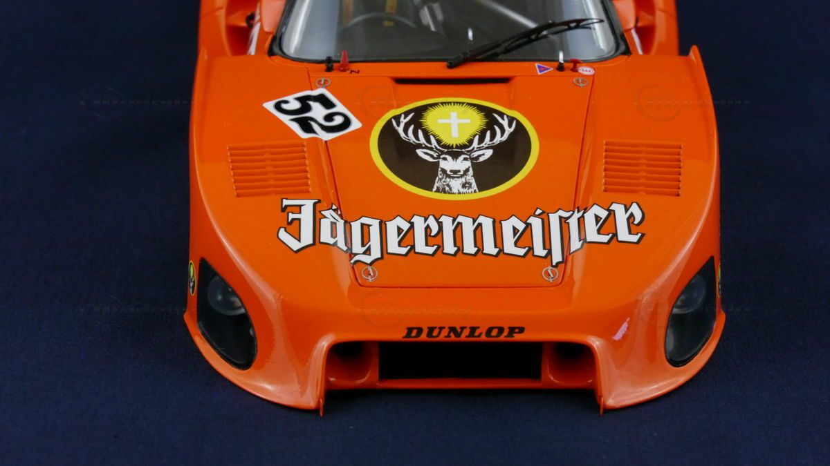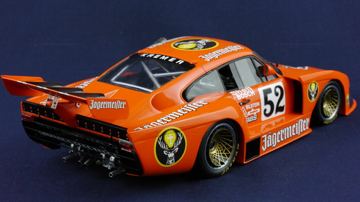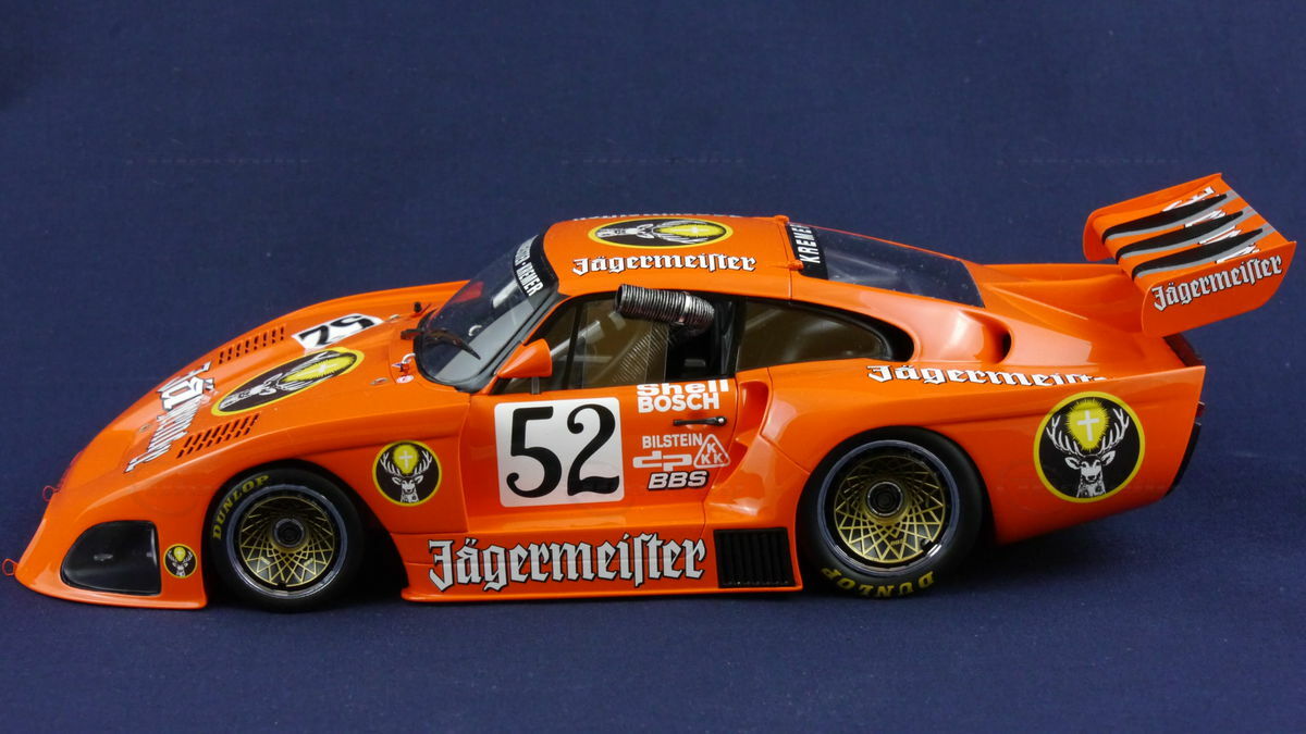 The striking orange paint of the Porsche 935 K4 Group 5 DRM 1981 and the numerous sponsor decals make this model unique. The hood features the large Jägermeister logo prominently placed, flanked by two air intakes. The side of the vehicle bears the number 52 as well as logos of Shell, Bilstein, and BBS. The rear spoiler also sports the Jägermeister branding. These design elements not only give the model an authentic look but also make it a standout piece in any collection.