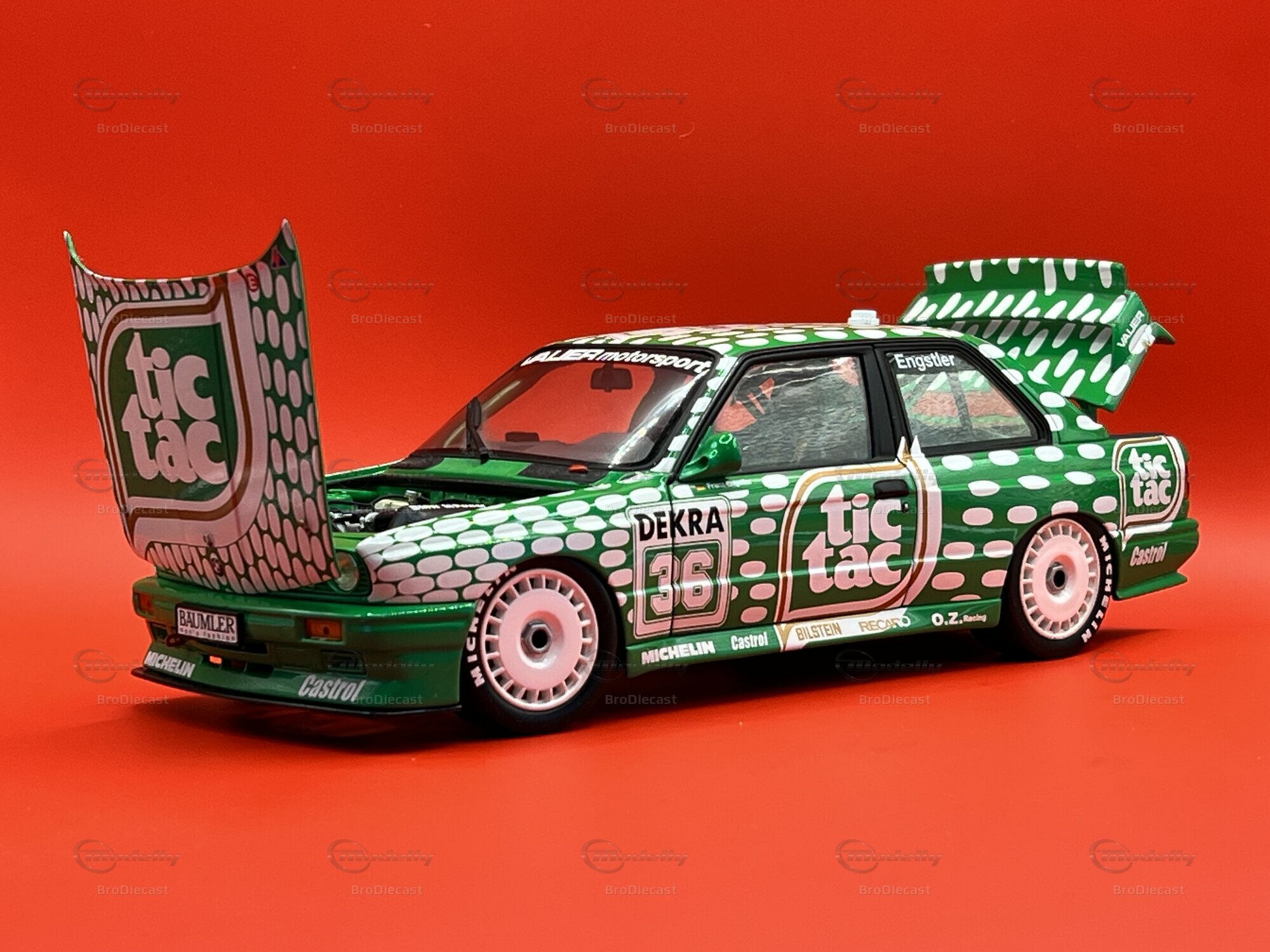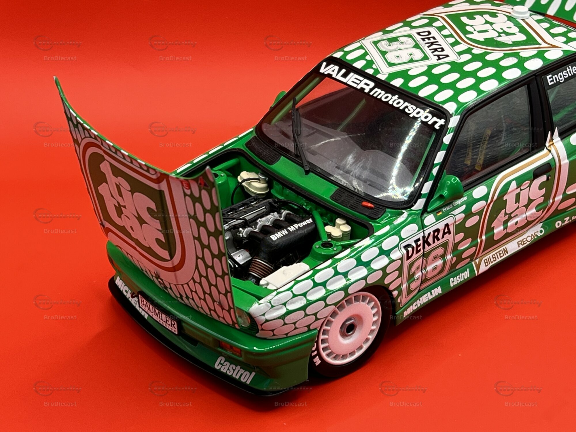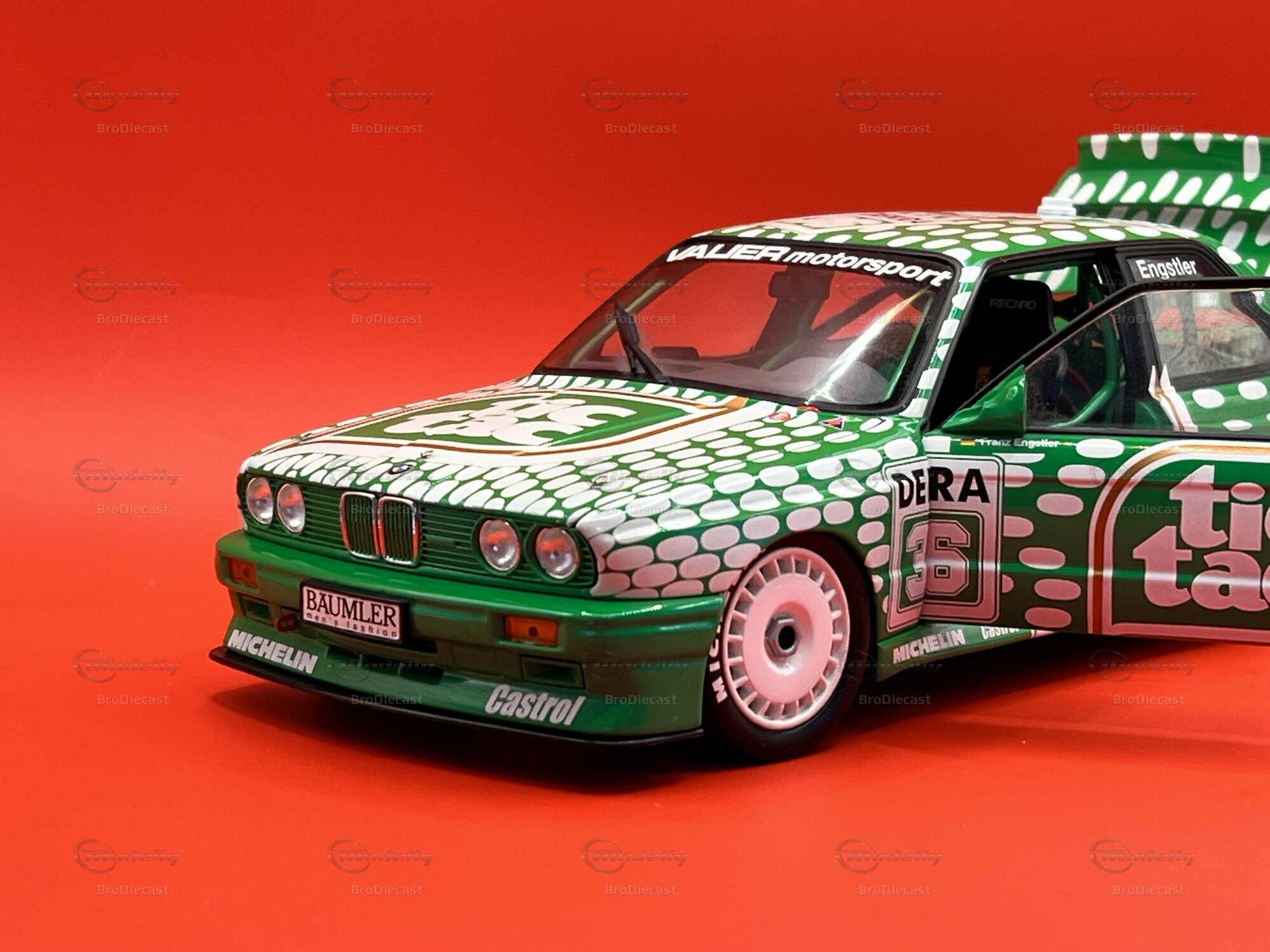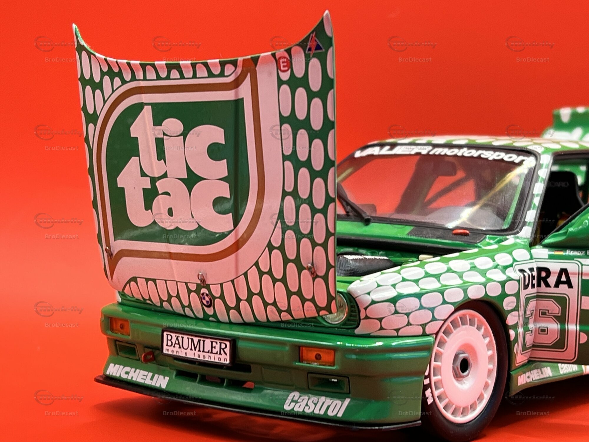 The model car of the BMW E30 M3 produced by Minichamps in 1/18 scale stands out with its striking green livery adorned with white dots. This special color scheme pays homage to the Tic Tac sponsorship connection, visible on the hood, sides, and rear of the car. Other sponsors like Michelin and Castrol are also displayed on the body, emphasizing the racing history of the model. The finely replicated wheels and the racing interior are clearly visible in the photos as well. These details add authenticity to the model car, making it a coveted collector's item.