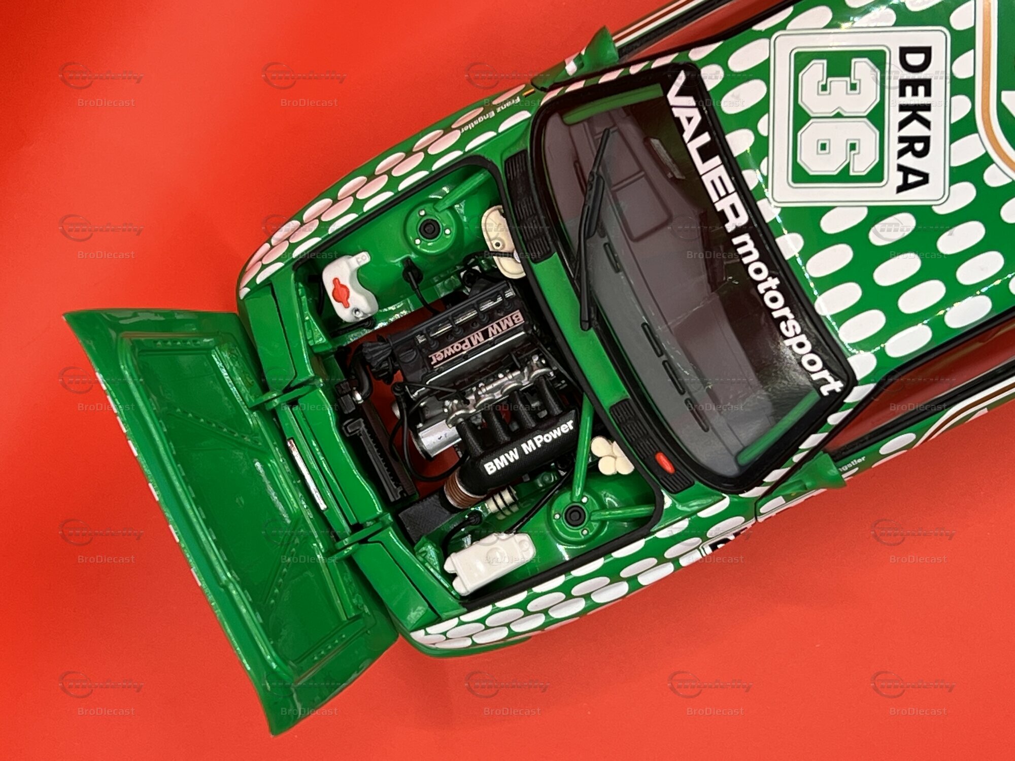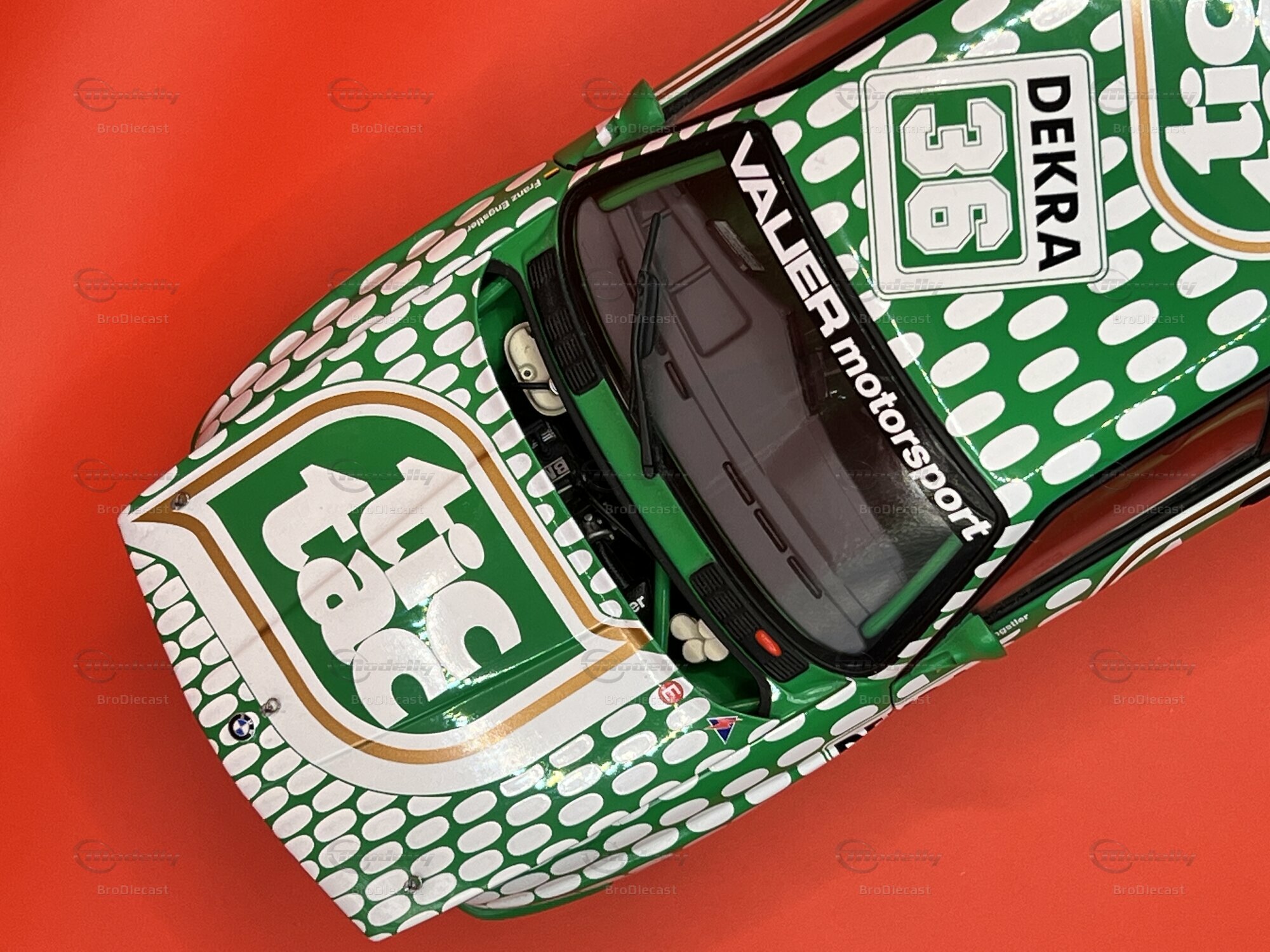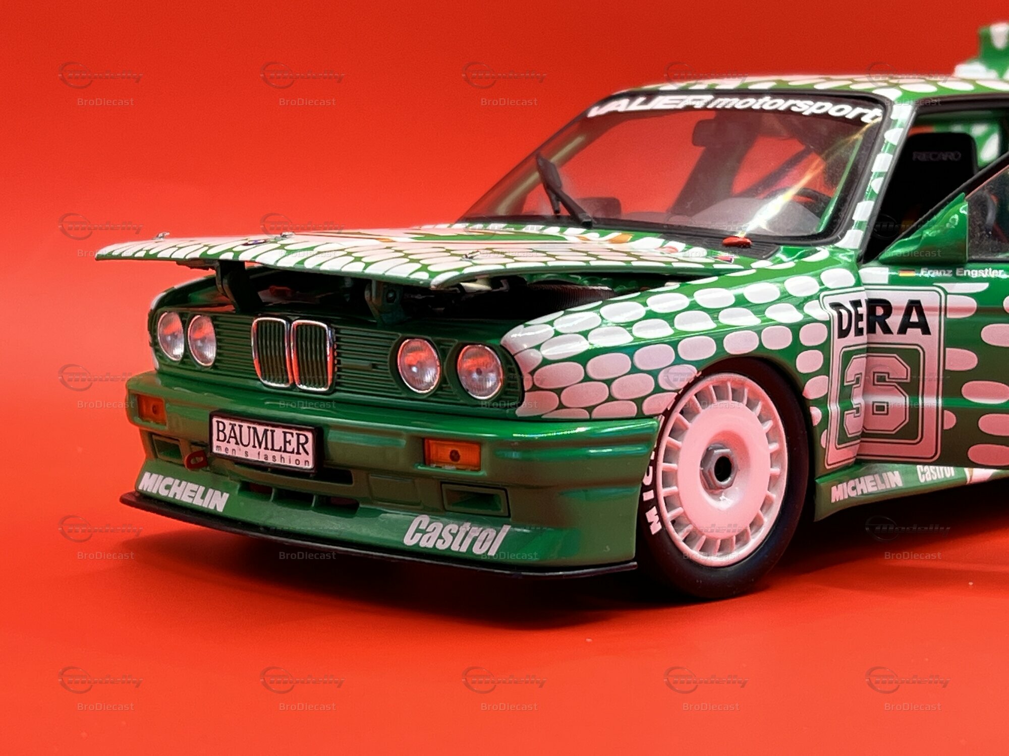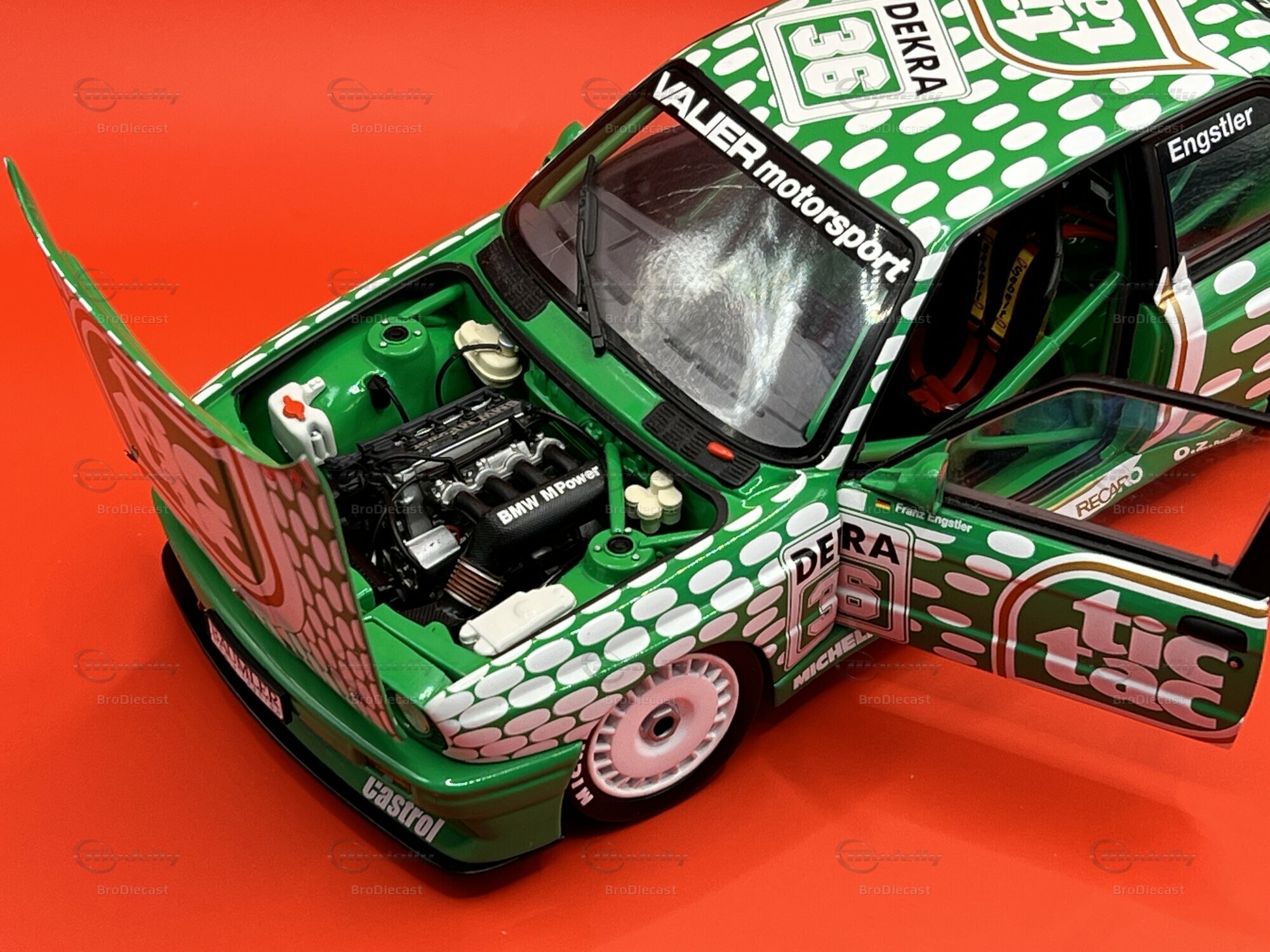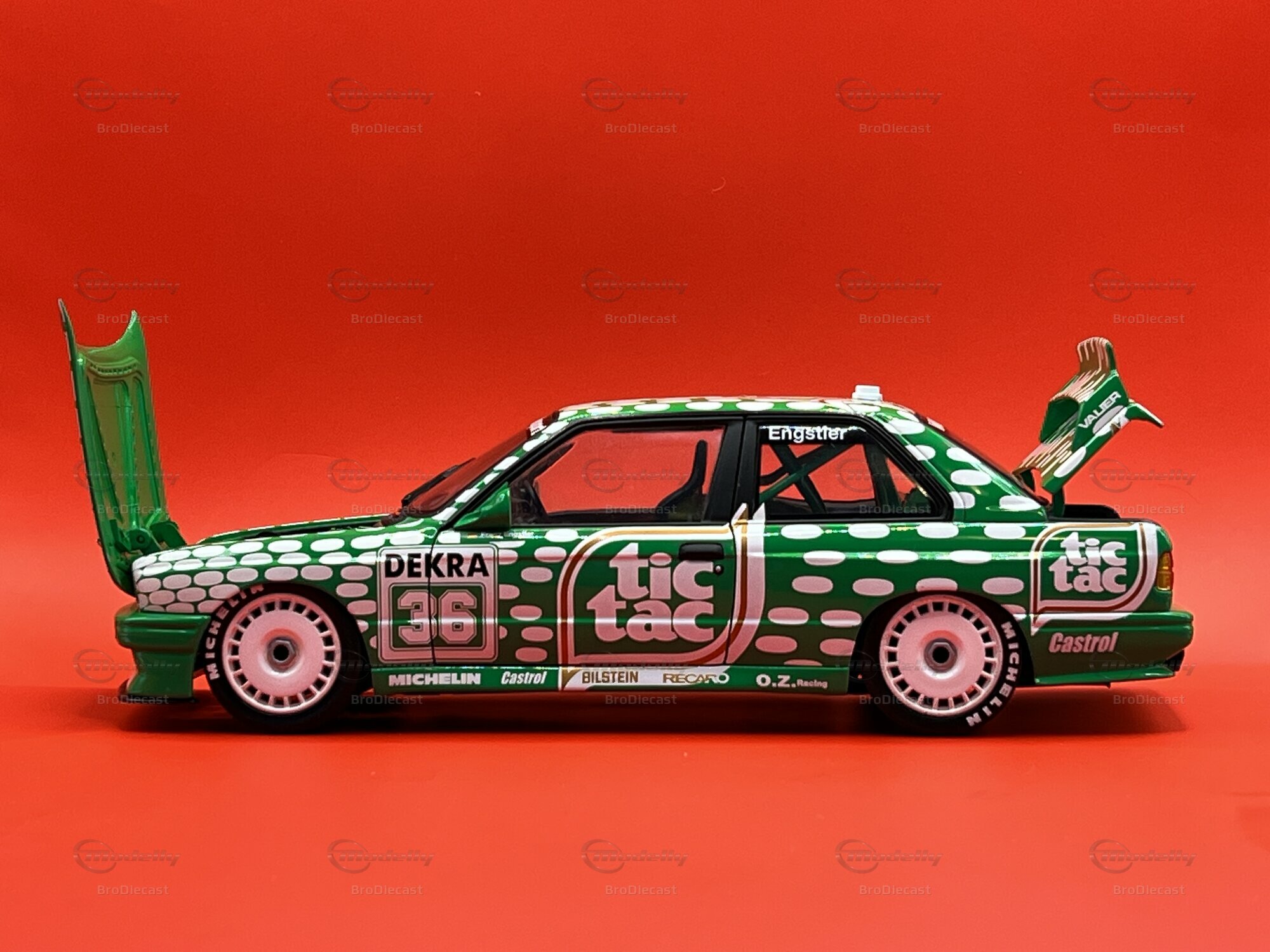 The model car of the BMW E30 M3 produced by Minichamps in 1/18 scale stands out with its striking green livery adorned with white dots. This special color scheme pays homage to the Tic Tac sponsorship connection, visible on the hood, sides, and rear of the car. Other sponsors like Michelin and Castrol are also displayed on the body, emphasizing the racing history of the model. The finely replicated wheels and the racing interior are clearly visible in the photos as well. These details add authenticity to the model car, making it a coveted collector's item.