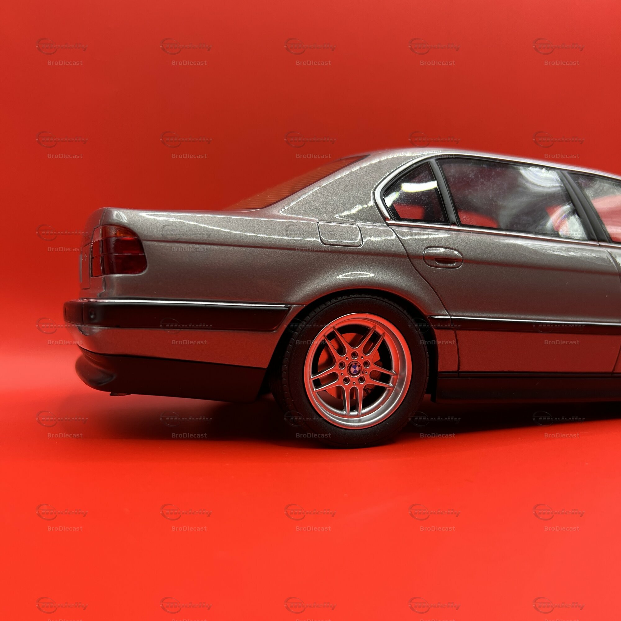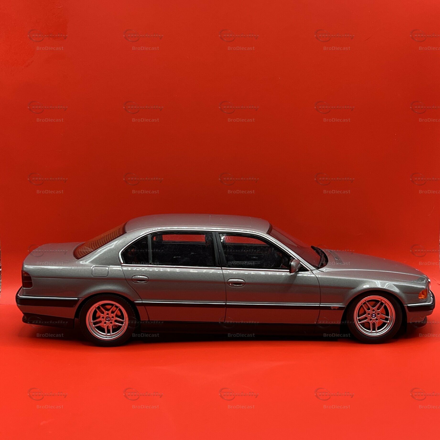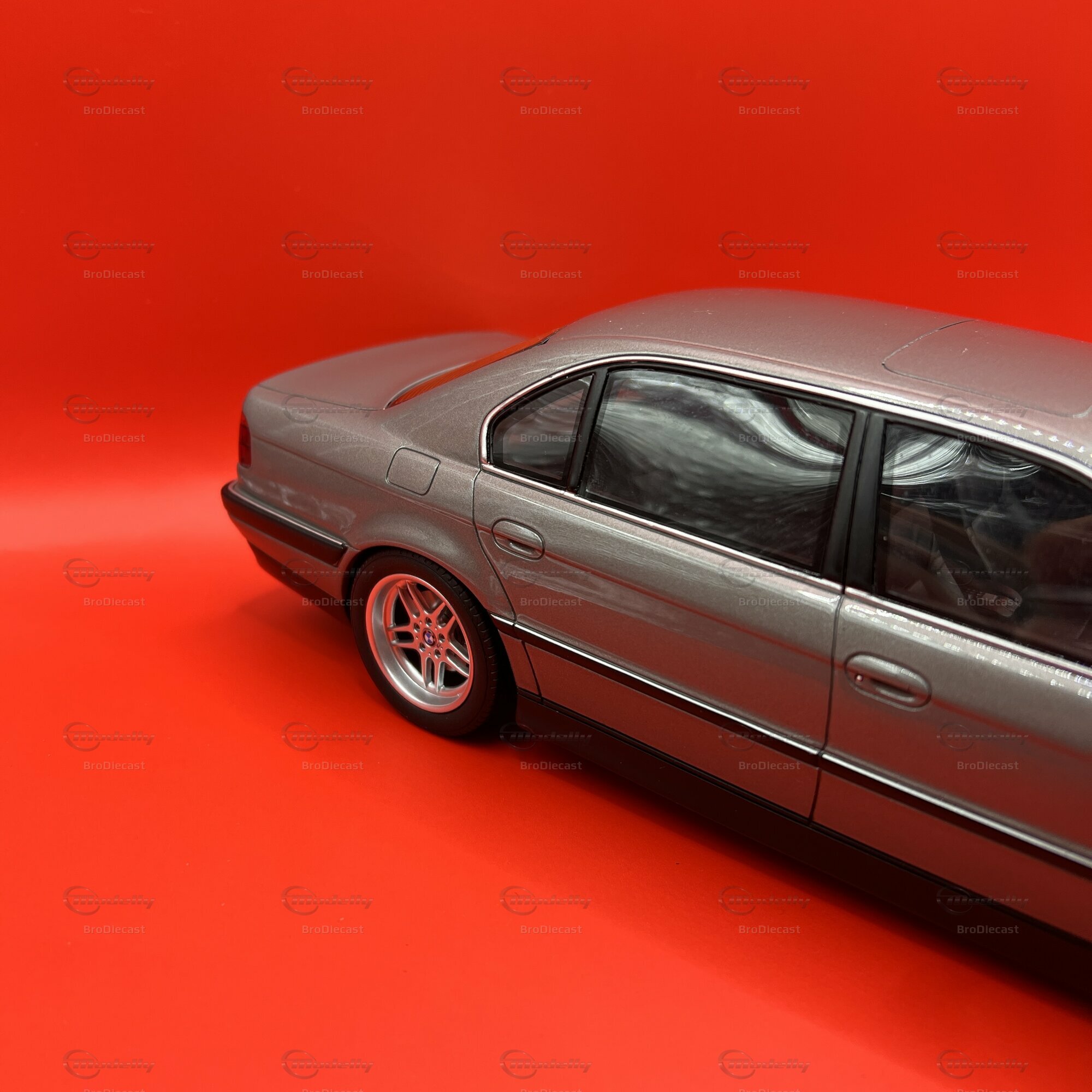 The model owned by Modelly member "BroDiecast" showcases the BMW 750iL (E38) with remarkable attention to detail. The car model is finished in a shiny silver paint, enhancing its elegant appearance. The detailed wheels stand out, perfectly complementing the vehicle's look. The wheels appear to be from a renowned manufacturer in the photo; their precise craftsmanship significantly contributes to the miniature's authenticity. Crafted from resin, it offers high detail accuracy and durability. The faithful reproduction of the original BMW grille and unique body lines reflects the beauty of the real E38 and the high quality of Otto Models replicas.