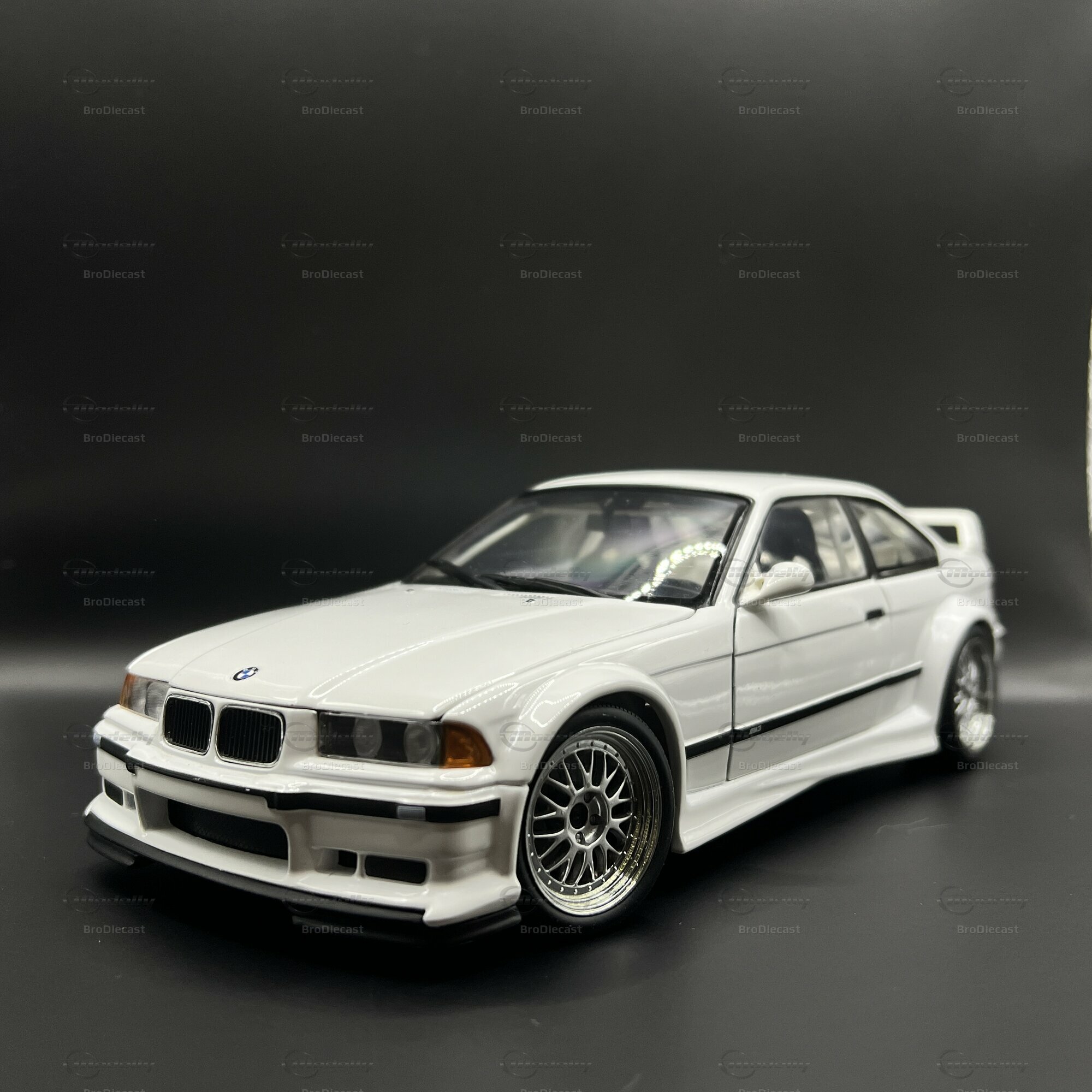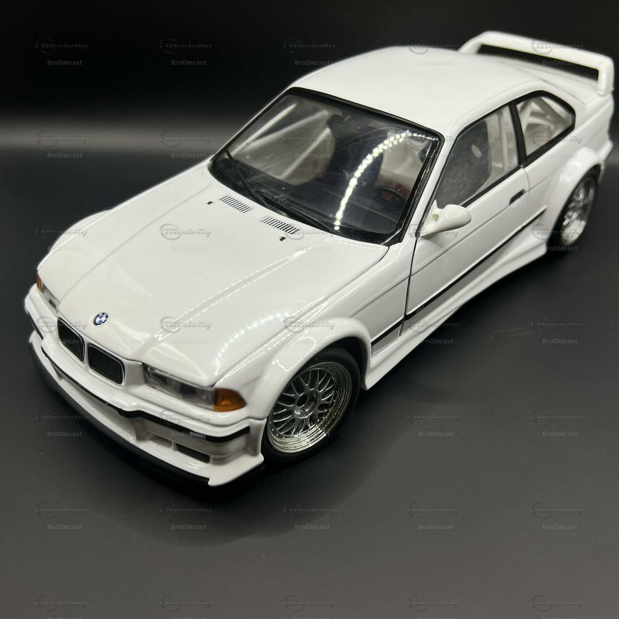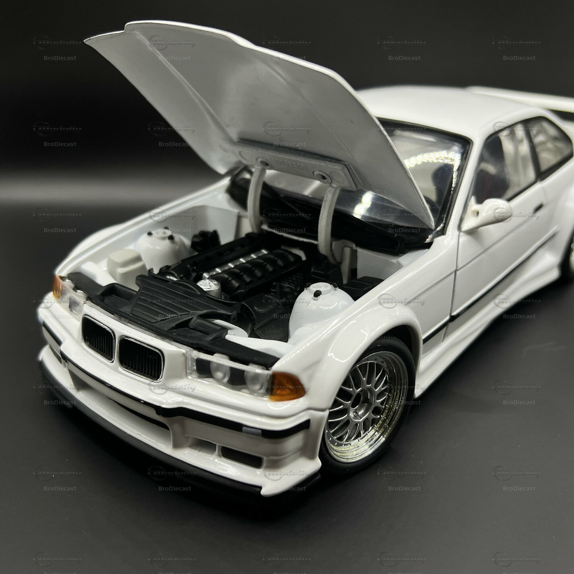 The model presented here from the collection of Modelly member "BroDiecast" features the BMW E36 M3 GTR in a slick white paint job. The striking white color combined with black accents along the body lines emphasizes the car's functional and racing-oriented design. The cooling vents on the hood, the angular bumpers, and the large rear wing give the car an aggressive look.