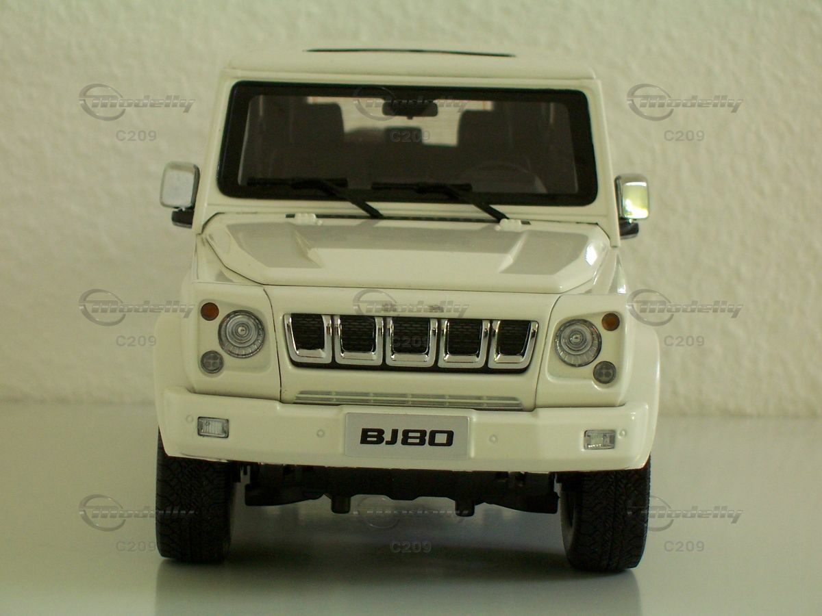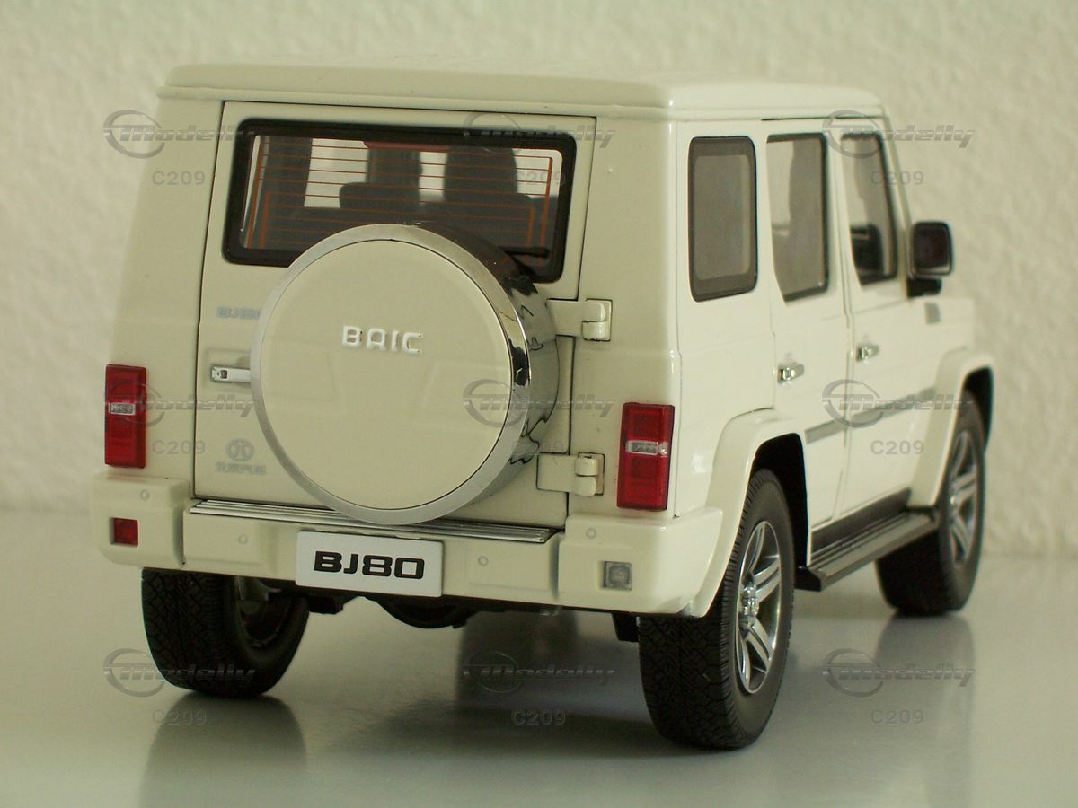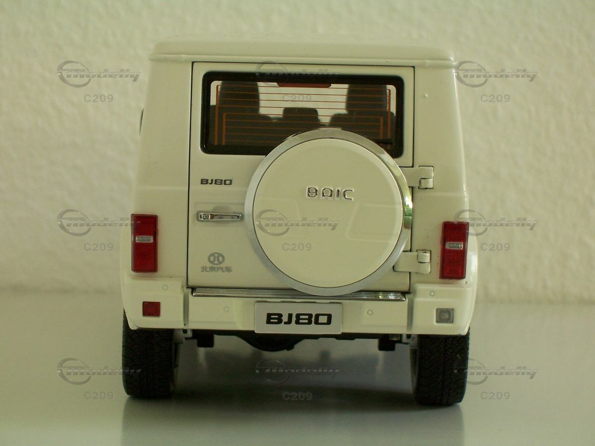 The scale model presented here in a scale of 1/18, manufactured by China Models, is an accurate miniature of the BAIC BJ80. It is made of high-quality diecast material and stands out for its detailed reproduction of the various components. The paint finish of the miniature mirrors that of the original and is in a neutral white color with a glossy finish, enhancing the lines and contours of the vehicle. The authentic wheels, window frames, and even the BAIC logos on the front and rear are carefully replicated. A notable feature of this model is the high level of detail in the headlights and taillights, which are clearly visible even in the miniature form.