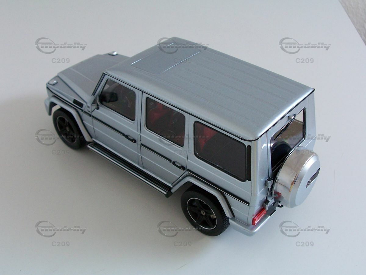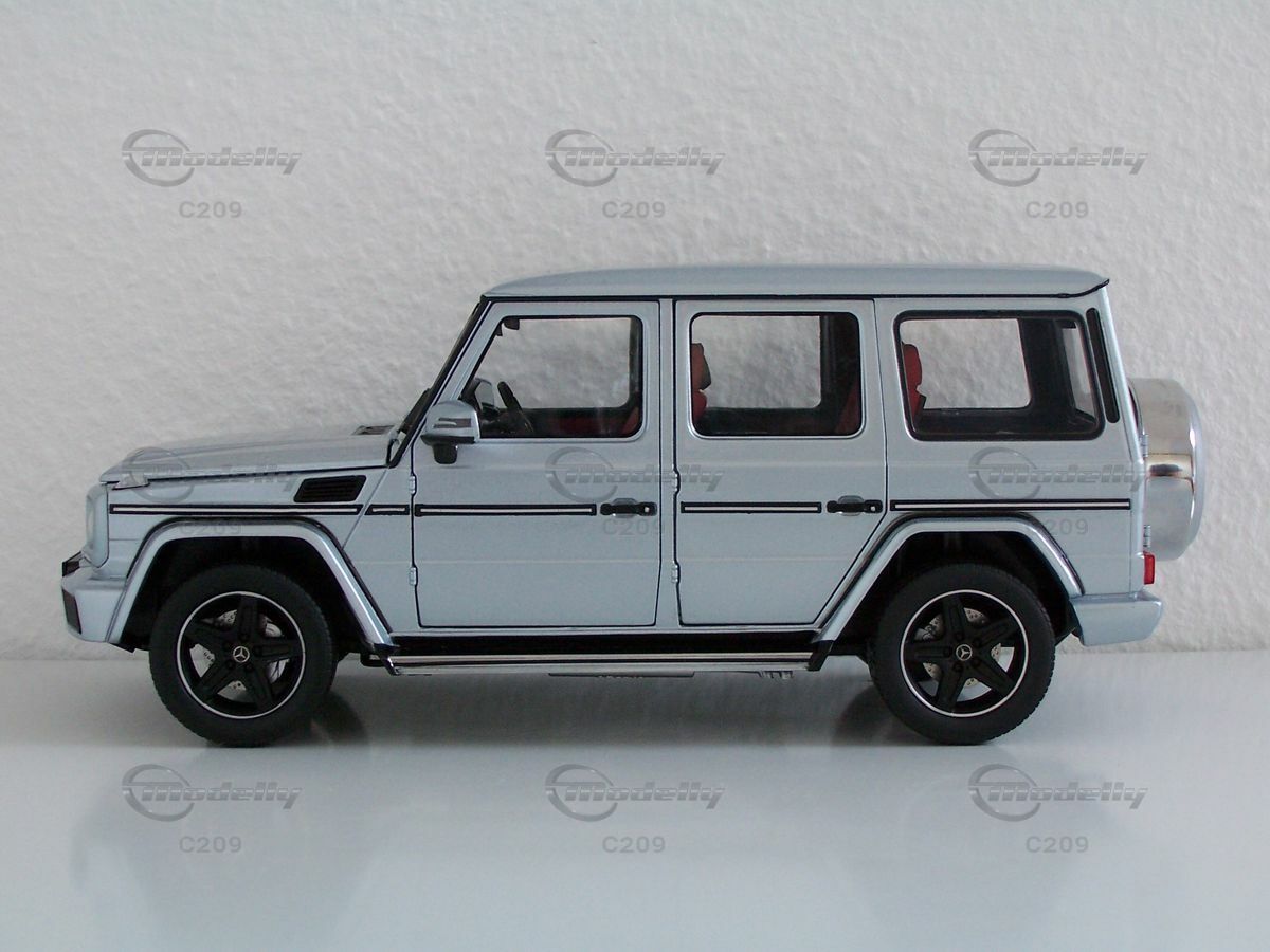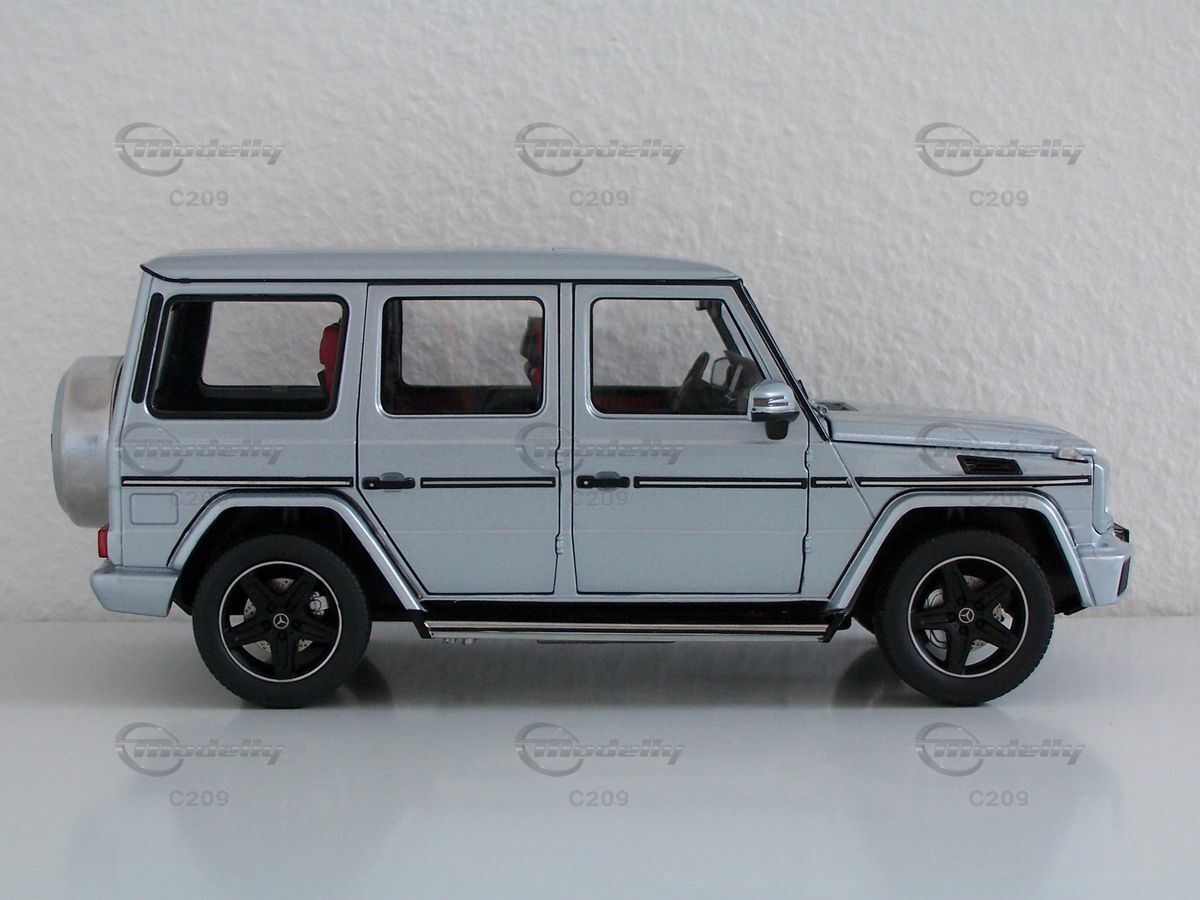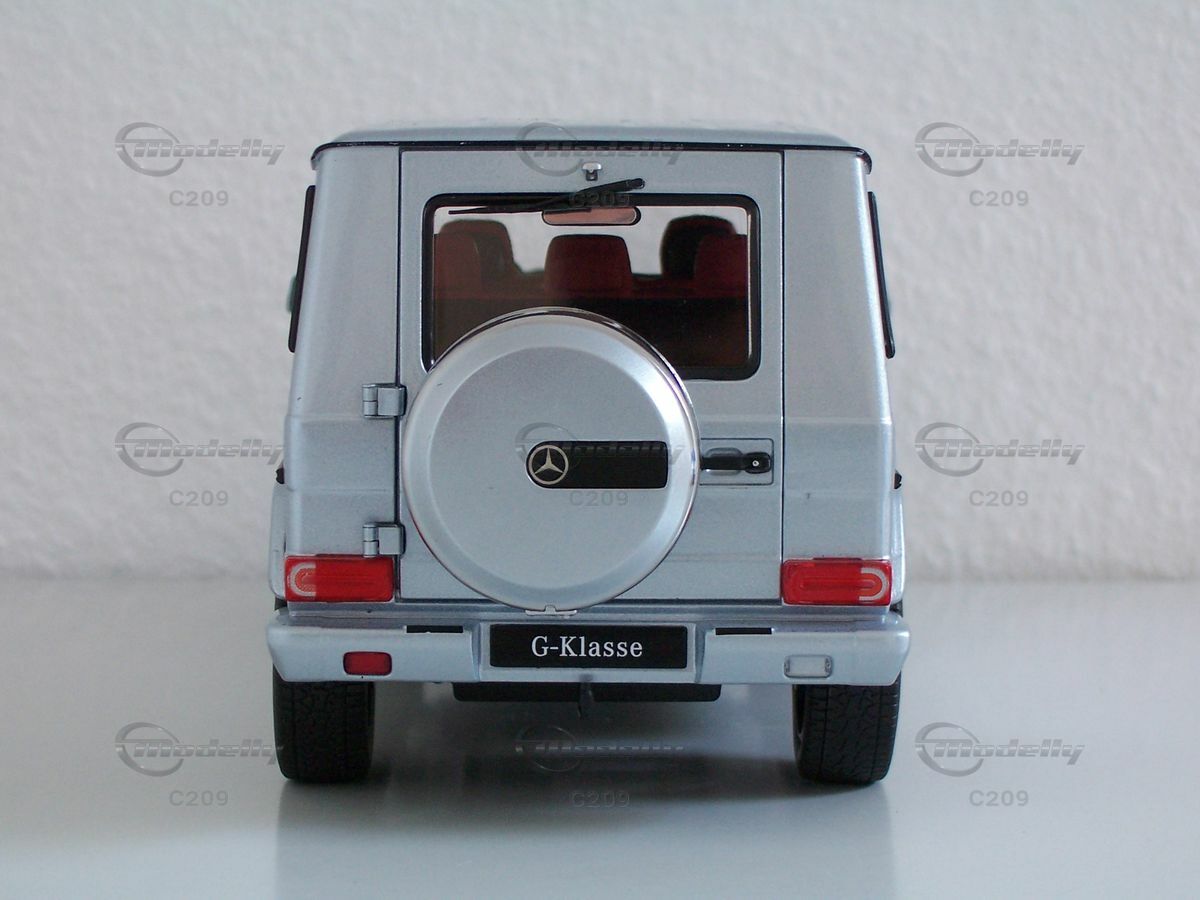 This iScale model car in 1/18 scale is part of the collection of Modelly member "C209" and stands out for its authentic paintwork and detailed interior. The silver finish of the model perfectly reproduces the original metallic shade of the G-Class. Noticeable are the authentic details like the spare wheel cover with the Mercedes emblem on the back and the accurately reproduced taillights. The red interior is visible through the windows, and the fine details such as the dashboard and seat design showcase the high level of detailing in this model. These aspects make the model car an impressive collector's item for any model car enthusiast and Mercedes-Benz G-Class fans.