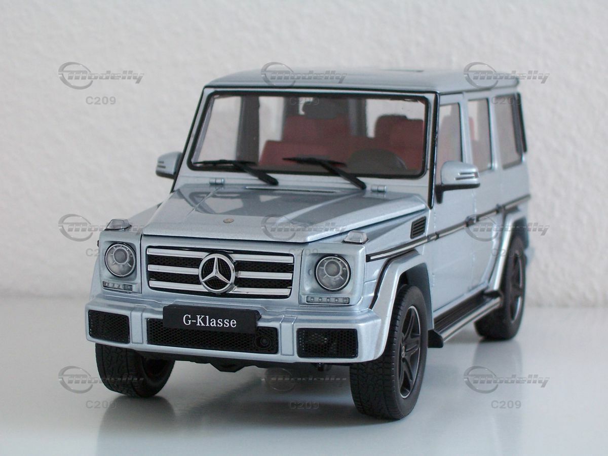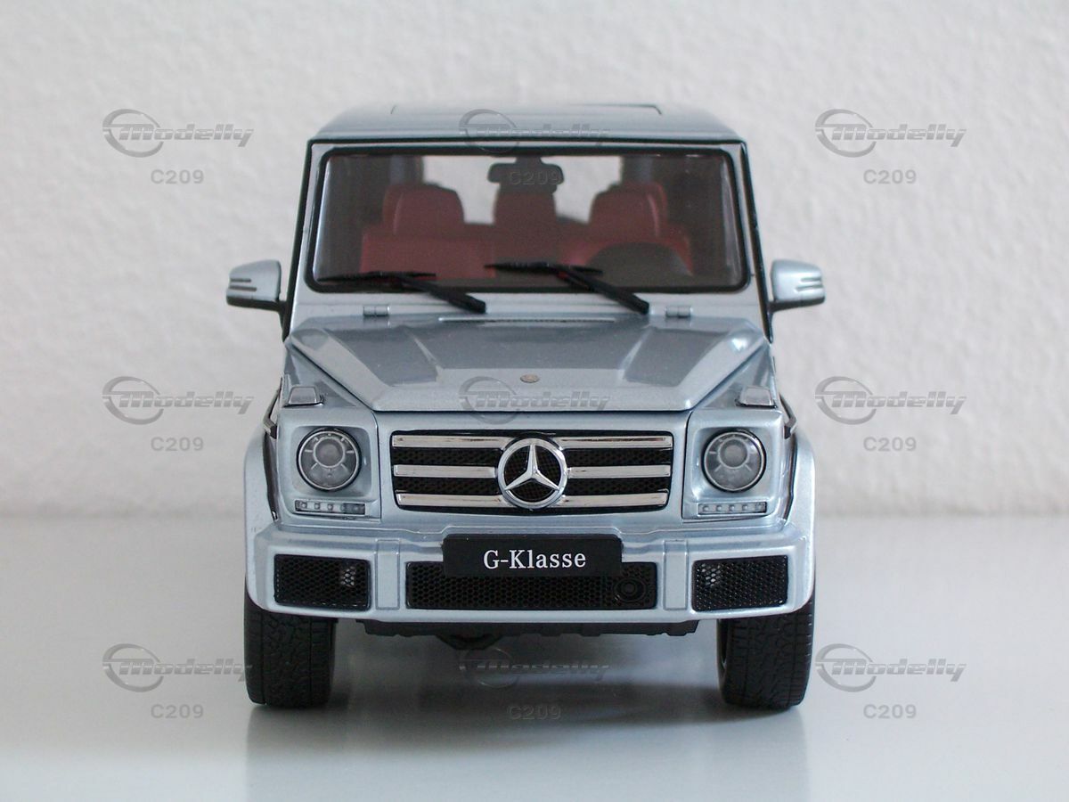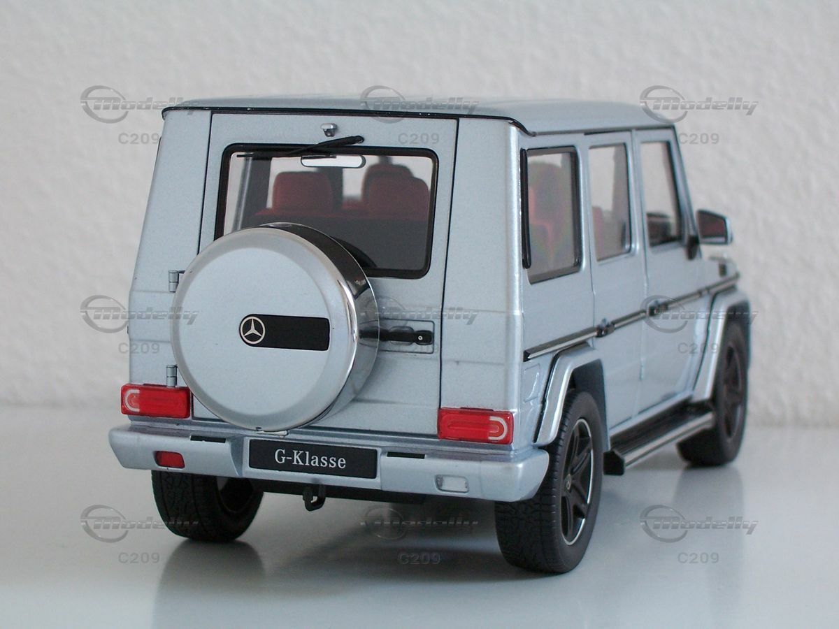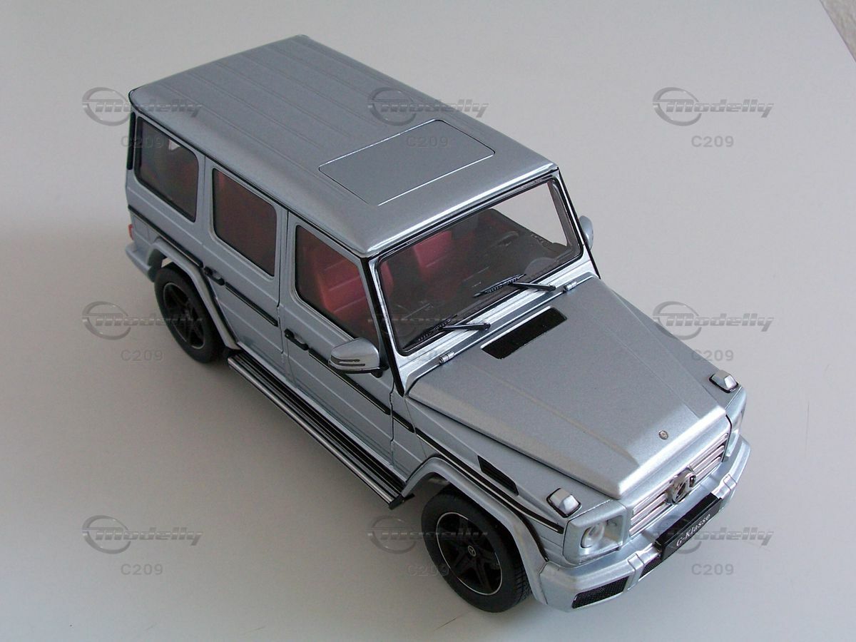 This iScale model car in 1/18 scale is part of the collection of Modelly member "C209" and stands out for its authentic paintwork and detailed interior. The silver finish of the model perfectly reproduces the original metallic shade of the G-Class. Noticeable are the authentic details like the spare wheel cover with the Mercedes emblem on the back and the accurately reproduced taillights. The red interior is visible through the windows, and the fine details such as the dashboard and seat design showcase the high level of detailing in this model. These aspects make the model car an impressive collector's item for any model car enthusiast and Mercedes-Benz G-Class fans.