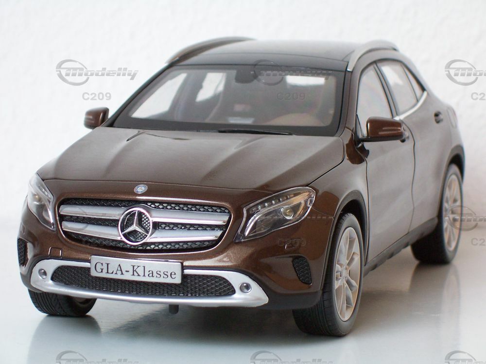 This detailed 1/18 scale model of the Mercedes GLA-Class (X156), manufactured by Norev, showcases numerous visible features that will excite collectors. Part of the extensive collection of Modelly member "C209," this model boasts an exact replica of the original's body and distinctive grille design. The metallic brown finish of the vehicle accentuates its elegant yet rugged appearance. The black and silver accents on the bumpers, along with the finely crafted headlights and taillights, add an additional level of realism to the model. The interior of the model is also intricately detailed, offering a realistic reproduction of the seats, dashboard, and instrument panel. This attention to detail makes the model especially appealing to model car collectors and enthusiasts.