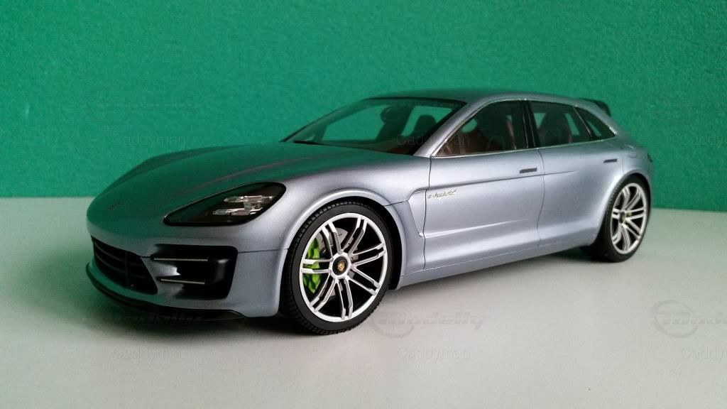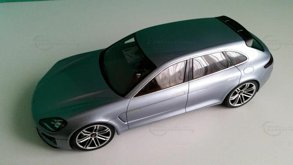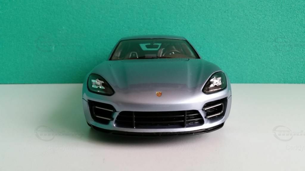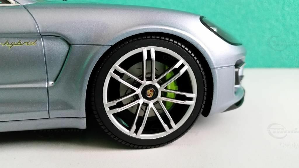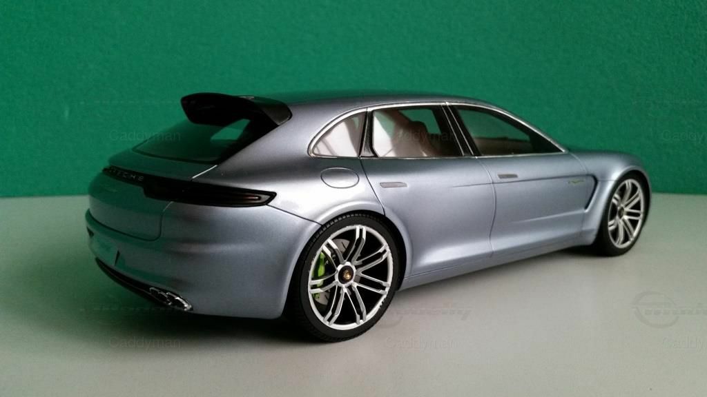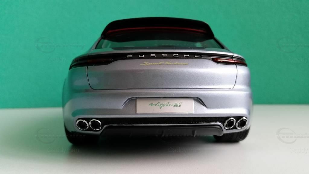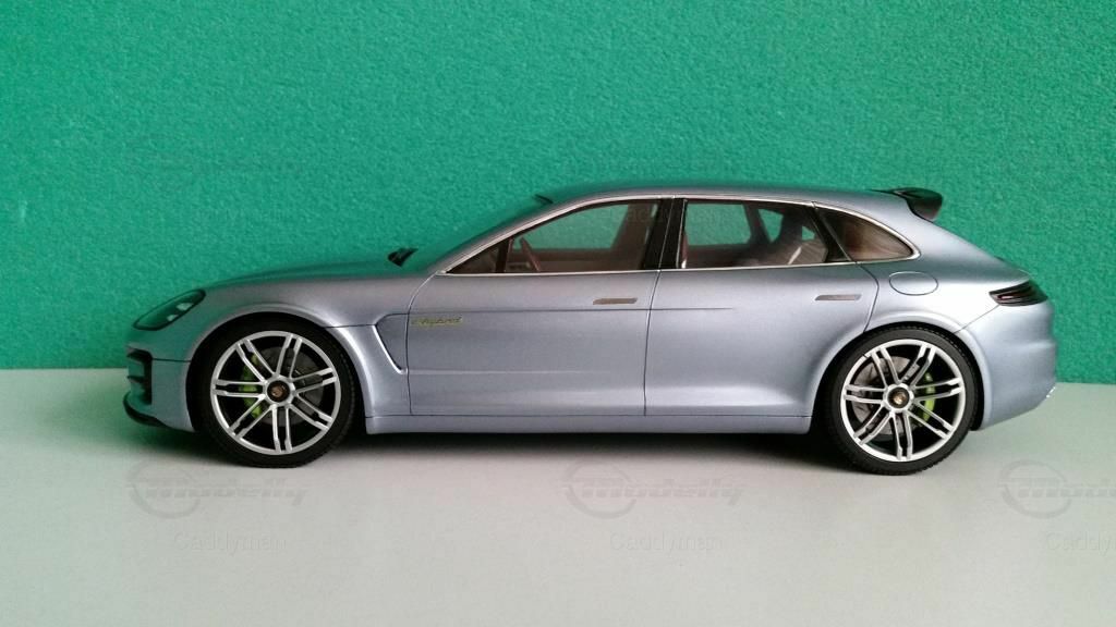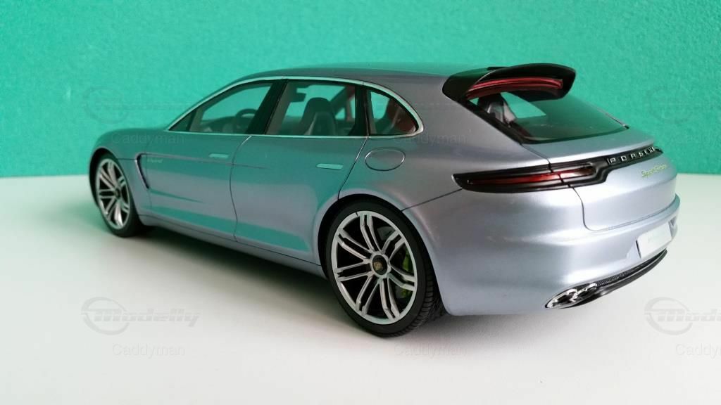 The 1/18 scale model car, manufactured by SPARK, is part of "Caddyman's" miniature collection. This model car provides an accurate representation of the original and showcases the carefully crafted lines and shapes of the Porsche Panamera Sport Turismo. The paintwork of this model is in a special metallic blue shade that accentuates the elegance of the vehicle. Recognizable details include the precise door handles, the exterior mirrors, and the distinctive shape of the headlights. The model car has a detailed interior visible through the windows, with the seats and dashboard accurately reproduced.