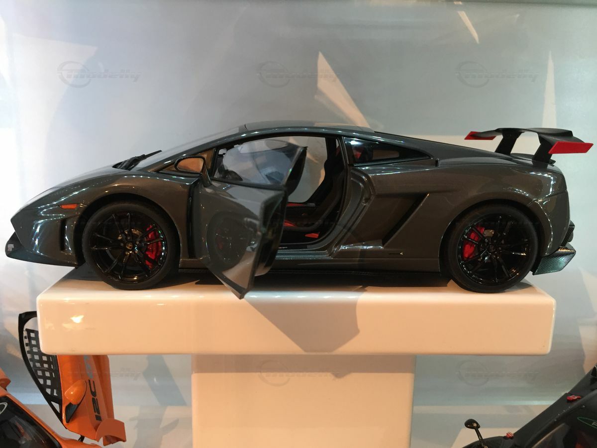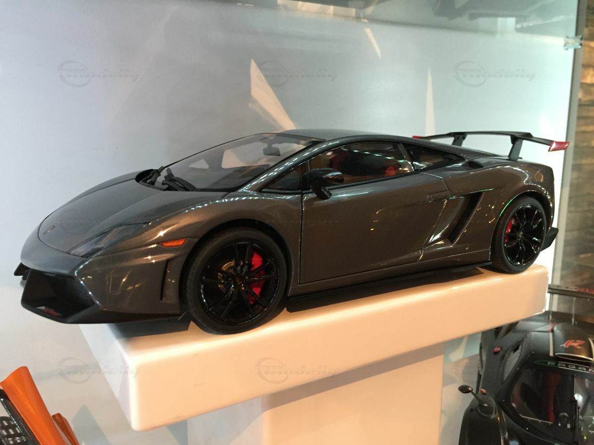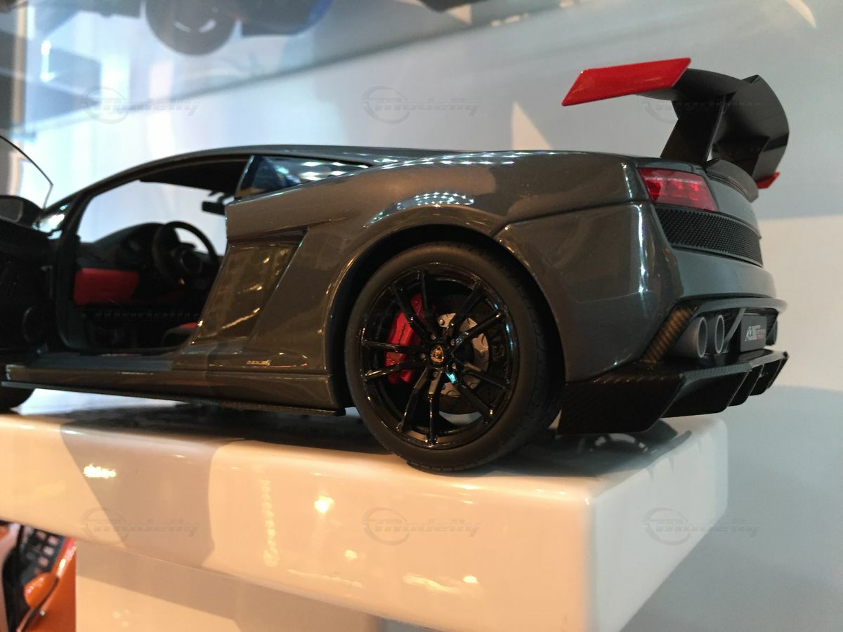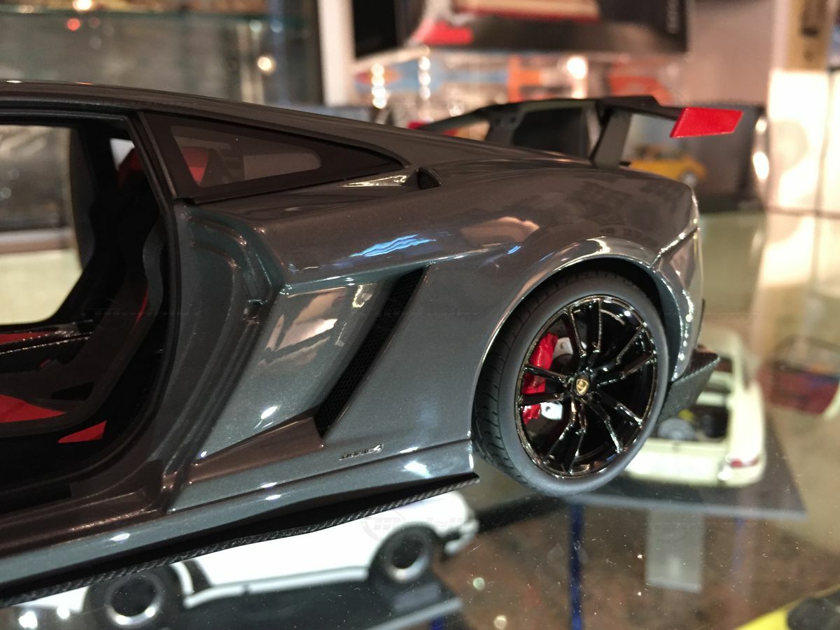 The displayed 1/18 scale model car by AUTOart Millennium is an exquisite collector's piece that perfectly captures the essence of the original. It has been crafted with great attention to detail and using diecast materials, enhancing its realistic appearance. The model depicts the Lamborghini Gallardo LP570 Super Trofeo accurately, including the distinctive front end with the large air intake and sharp headlights. The model is painted in a striking gray tone that reflects the car's sporty and elegant character. The wheels are kept black with red brake calipers, emphasizing the racing character of the model. These fine details make the model car a valuable collectible for model car enthusiasts and Carjunkys members alike.