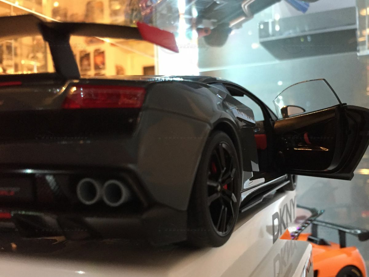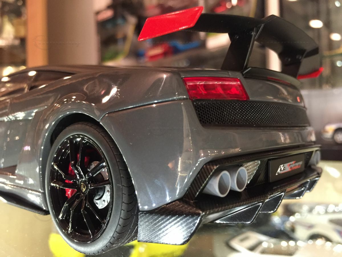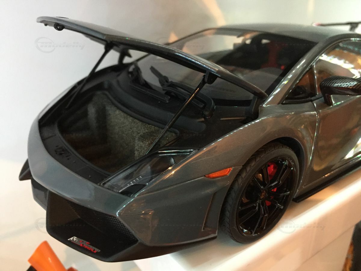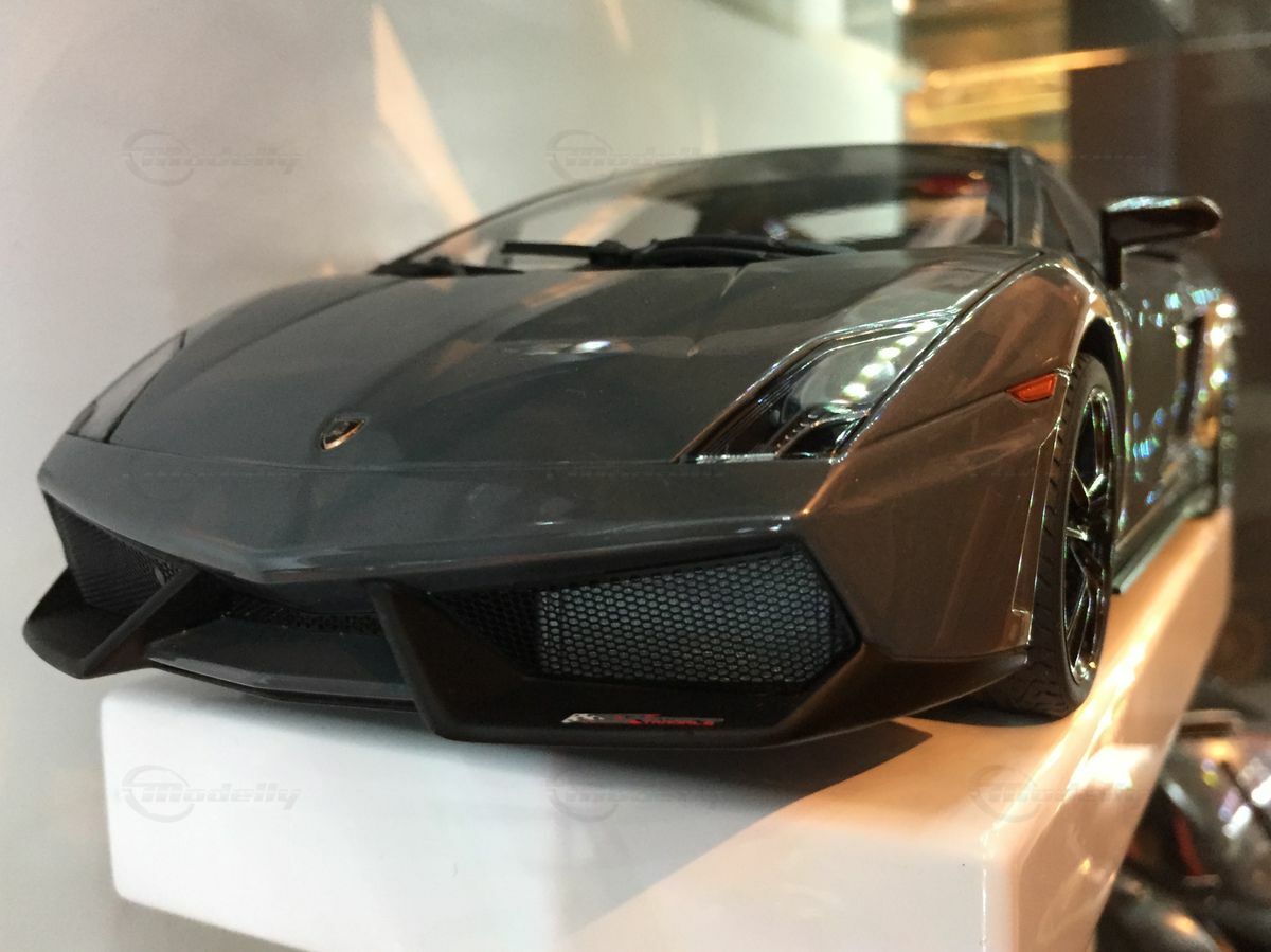 The displayed 1/18 scale model car by AUTOart Millennium is an exquisite collector's piece that perfectly captures the essence of the original. It has been crafted with great attention to detail and using diecast materials, enhancing its realistic appearance. The model depicts the Lamborghini Gallardo LP570 Super Trofeo accurately, including the distinctive front end with the large air intake and sharp headlights. The model is painted in a striking gray tone that reflects the car's sporty and elegant character. The wheels are kept black with red brake calipers, emphasizing the racing character of the model. These fine details make the model car a valuable collectible for model car enthusiasts and Carjunkys members alike.