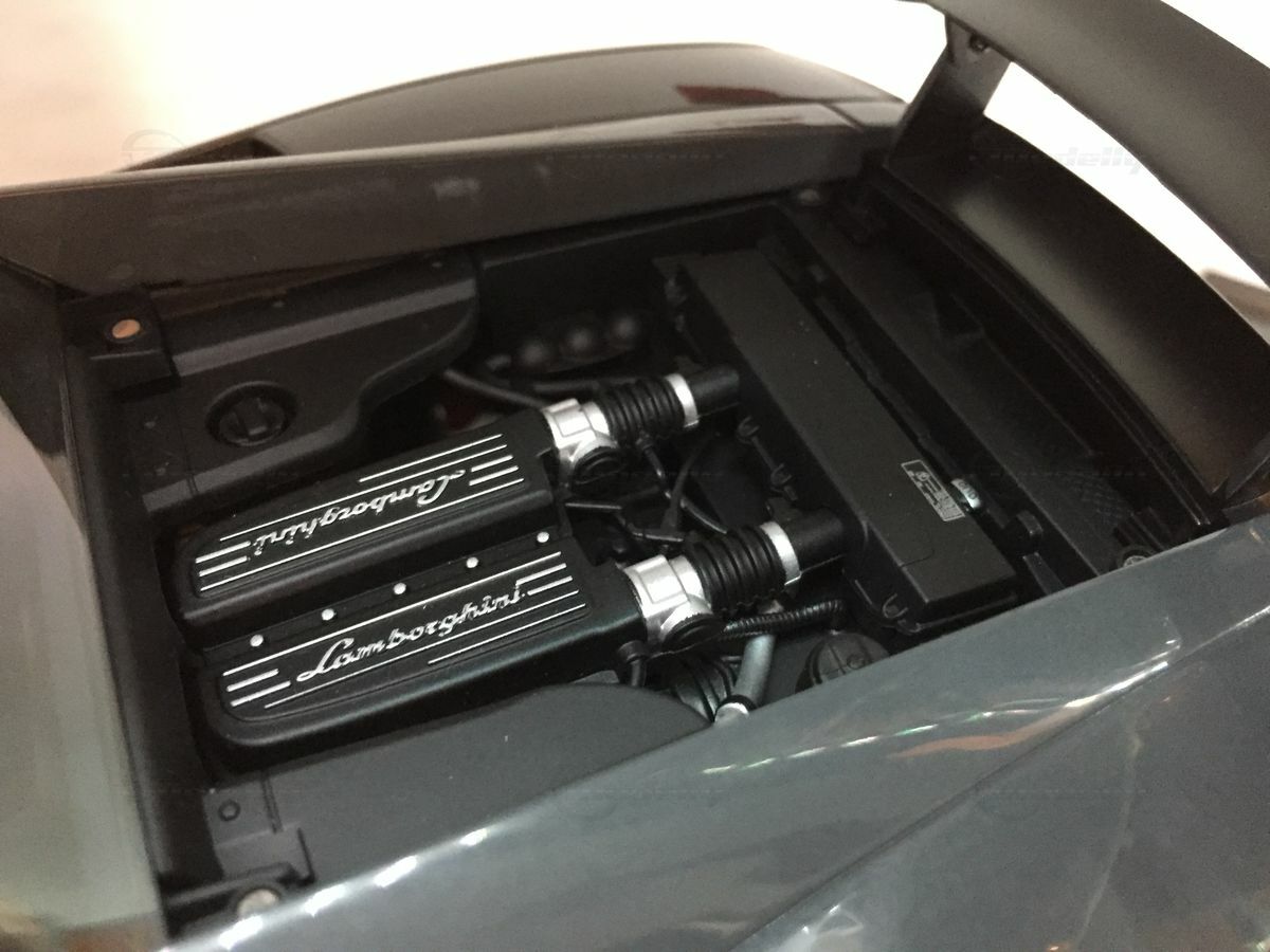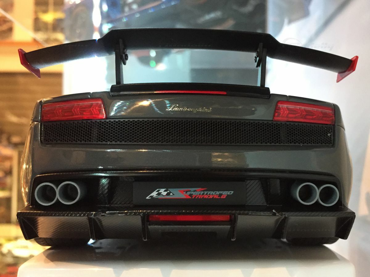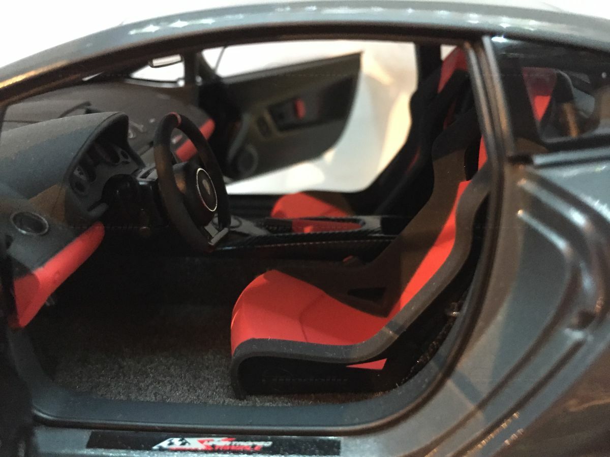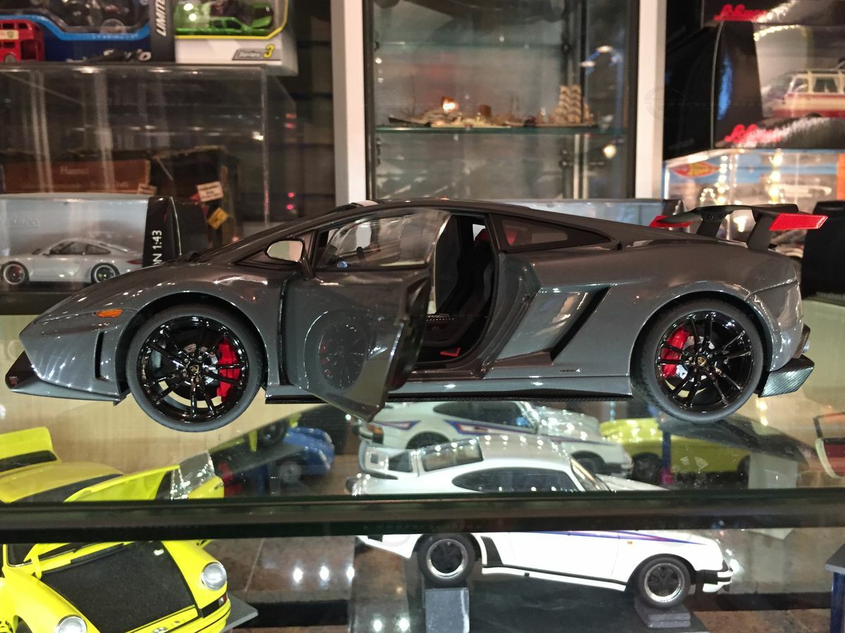 The displayed 1/18 scale model car by AUTOart Millennium is an exquisite collector's piece that perfectly captures the essence of the original. It has been crafted with great attention to detail and using diecast materials, enhancing its realistic appearance. The model depicts the Lamborghini Gallardo LP570 Super Trofeo accurately, including the distinctive front end with the large air intake and sharp headlights. The model is painted in a striking gray tone that reflects the car's sporty and elegant character. The wheels are kept black with red brake calipers, emphasizing the racing character of the model. These fine details make the model car a valuable collectible for model car enthusiasts and Carjunkys members alike.