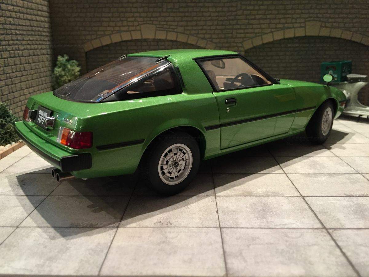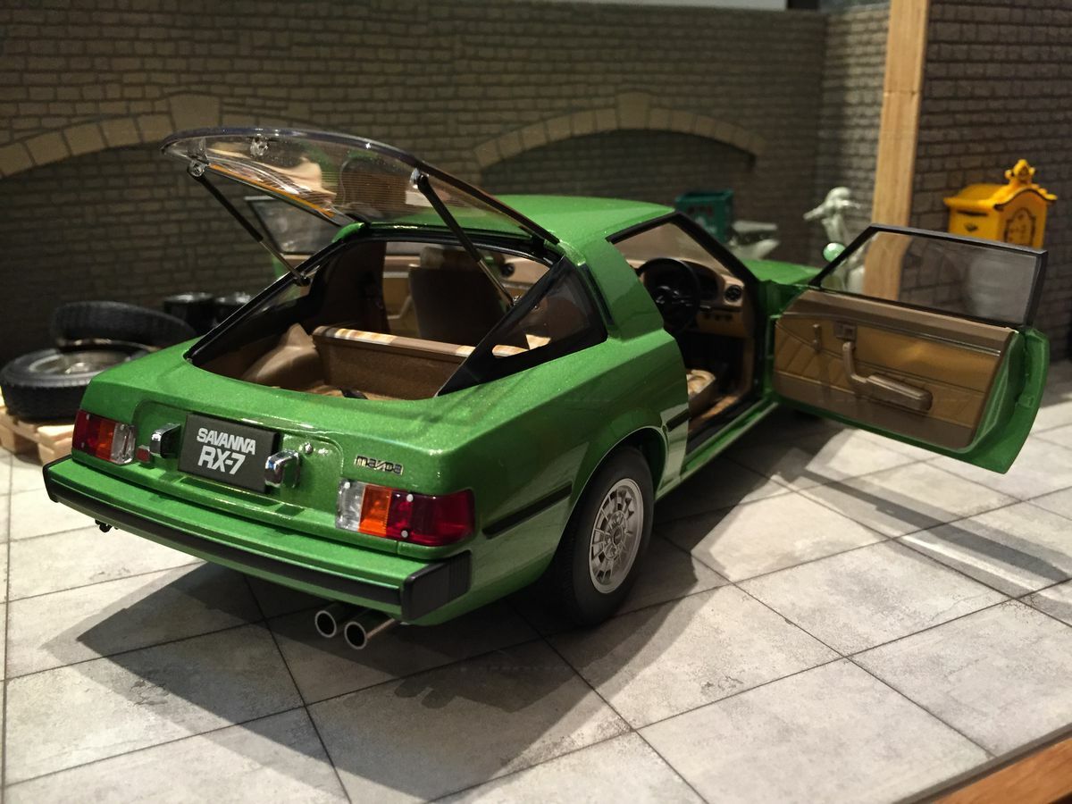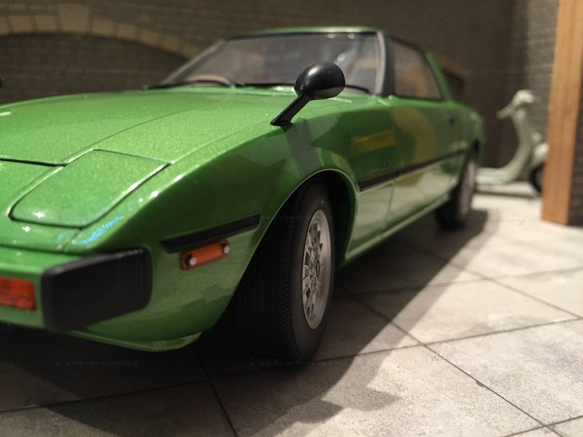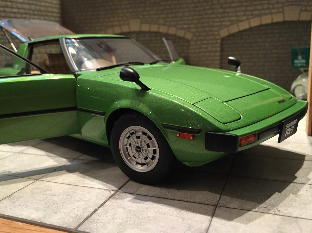 The model car in the collection of Modelly member "Carjunky" is a 1/18 scale model of the Mazda Savanna RX-7 (SA) produced by AUTOart Millennium. This diecast material model stands out for its high level of detail. Particularly notable are the functional pop-up headlights and accurately replicated side mirrors. The model's green metallic paint perfectly reflects the contemporary color scheme of the original. Additionally, the model is equipped with faithfully recreated interior and dashboard details that will fascinate enthusiasts. The wheels are also a faithful reproduction of the original first-generation rims, with the RX-7 emblem on the front of the model standing out perfectly.