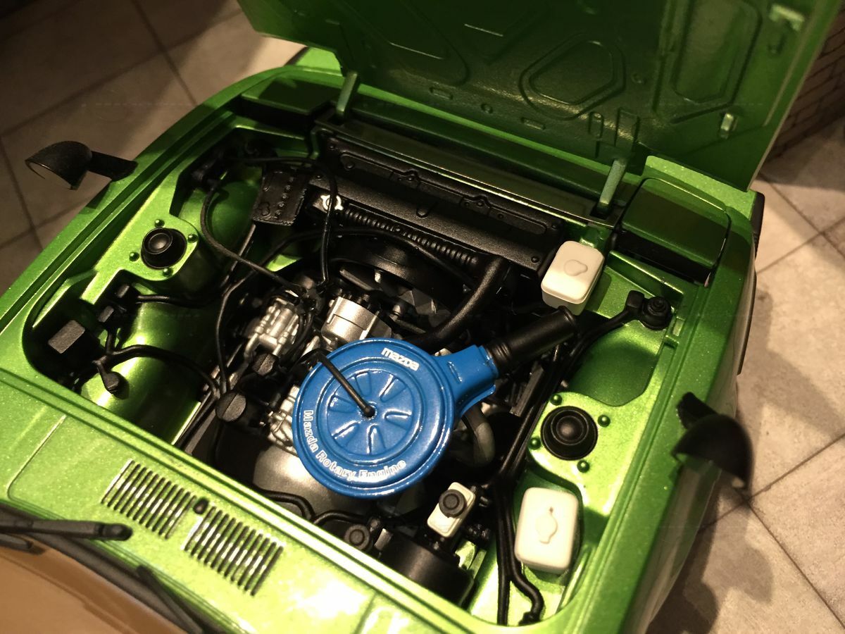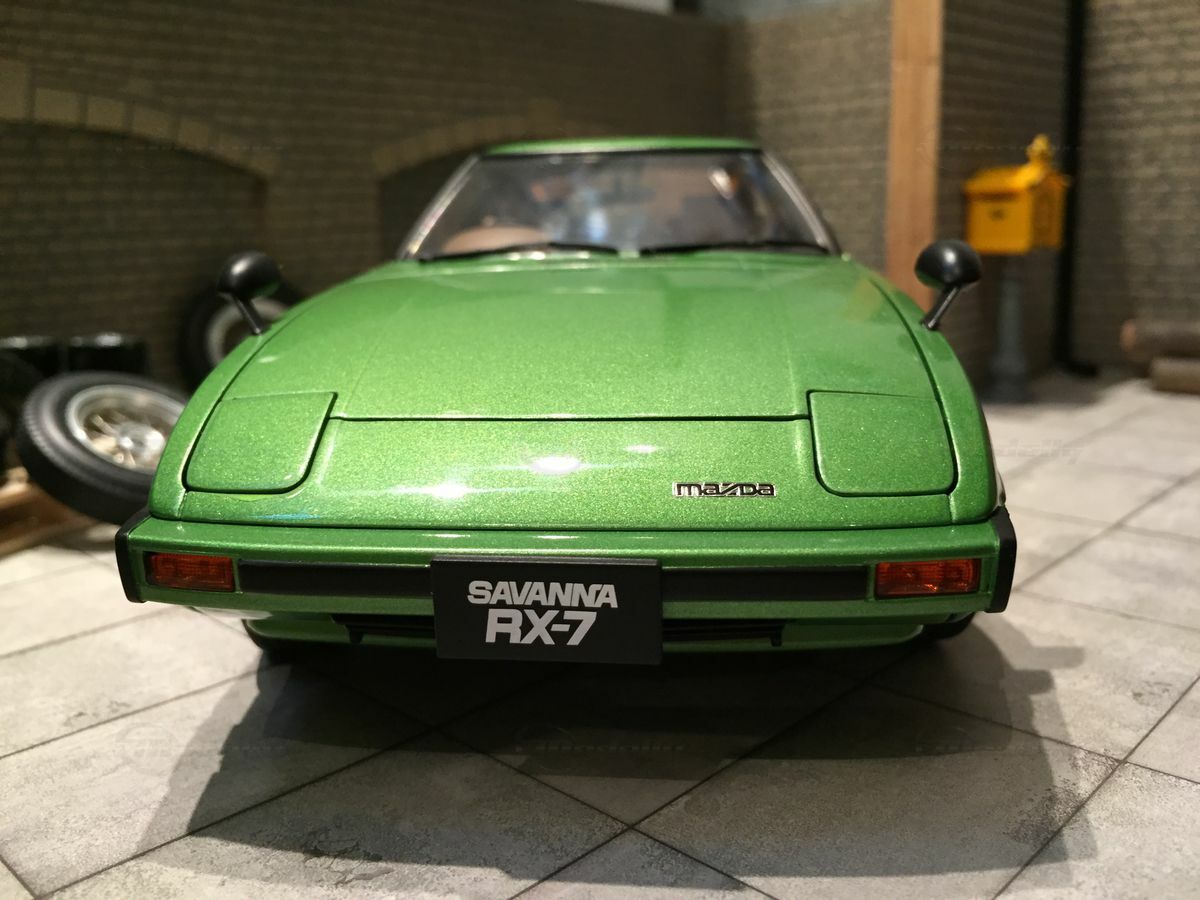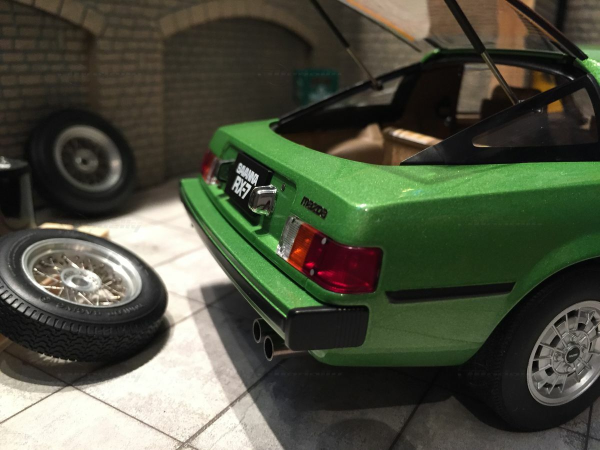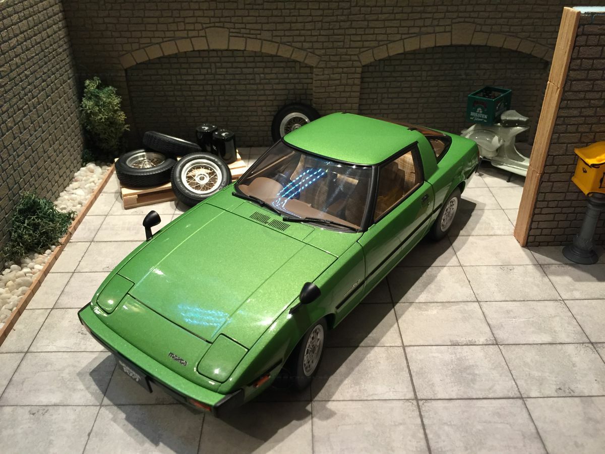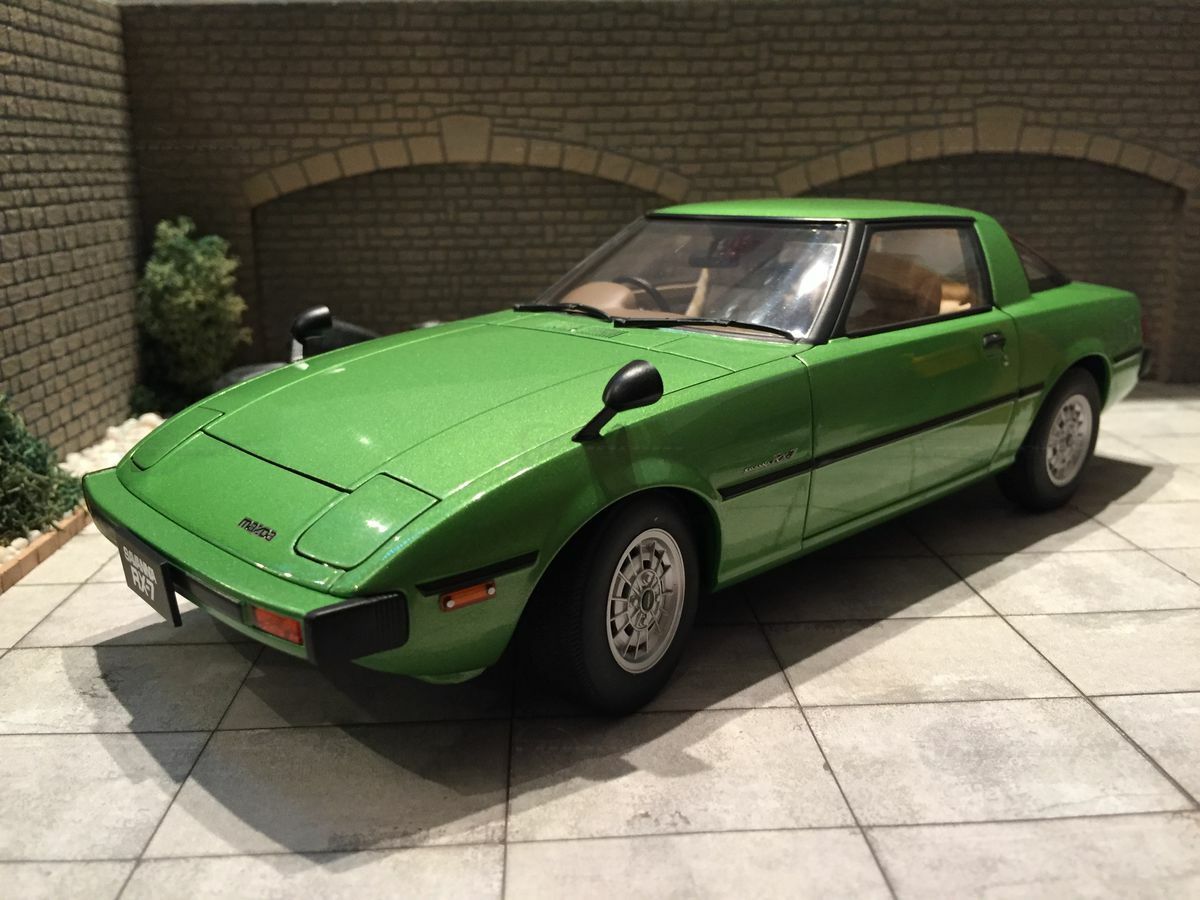 The model car in the collection of Modelly member "Carjunky" is a 1/18 scale model of the Mazda Savanna RX-7 (SA) produced by AUTOart Millennium. This diecast material model stands out for its high level of detail. Particularly notable are the functional pop-up headlights and accurately replicated side mirrors. The model's green metallic paint perfectly reflects the contemporary color scheme of the original. Additionally, the model is equipped with faithfully recreated interior and dashboard details that will fascinate enthusiasts. The wheels are also a faithful reproduction of the original first-generation rims, with the RX-7 emblem on the front of the model standing out perfectly.