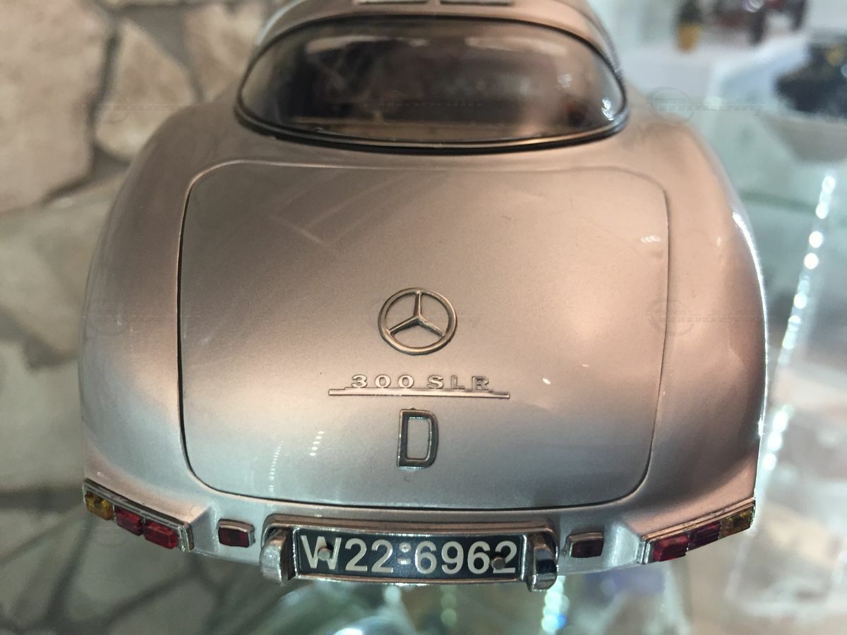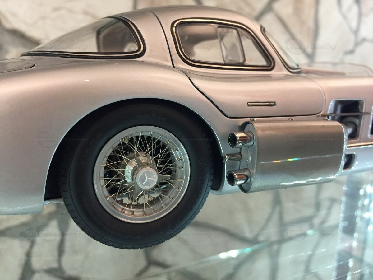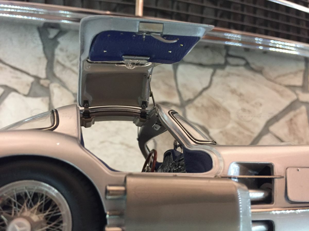 The model shown is a 1/18 scale reproduction of the Mercedes-Benz 300 SLR Uhlenhaut Coupé, manufactured by CMC. The attention to detail and precision with which this model was crafted are impressive. It is made of high-quality die-cast material and features many true-to-life elements such as the detailed rims and authentic badges. Particularly striking are the delicate yet sturdy spoke wheels that perfectly capture the classic-sporty design. The paintwork is in an elegant silver color, replicating the original high-quality aluminum look of the prototype. Additionally, the famous gull-wing doors inspired by the original are a remarkable feature of this model. These details make the Carjunky model from the Modelly collection a real standout in any model car collection.