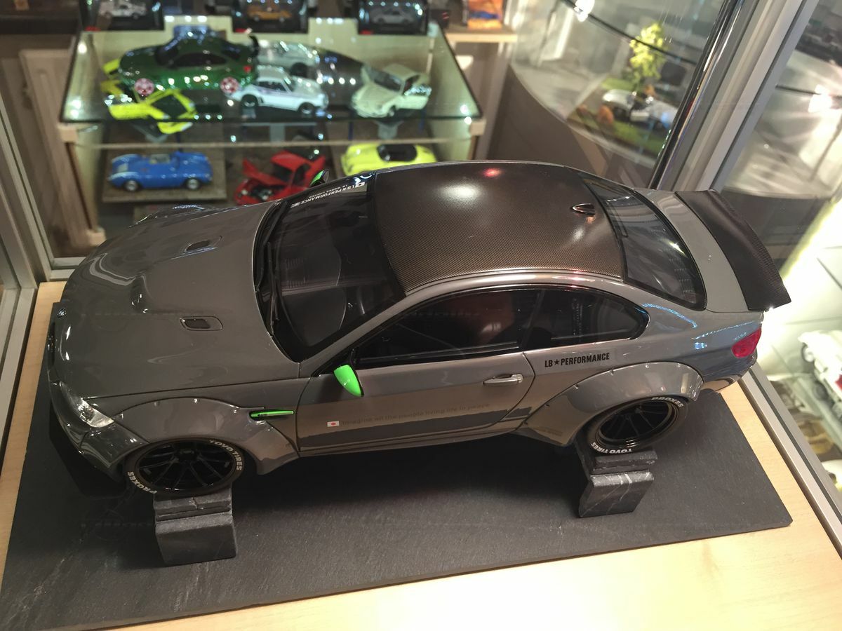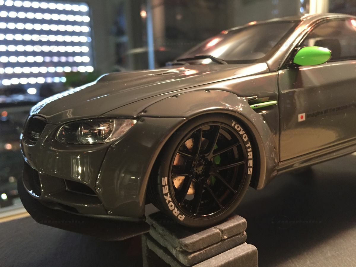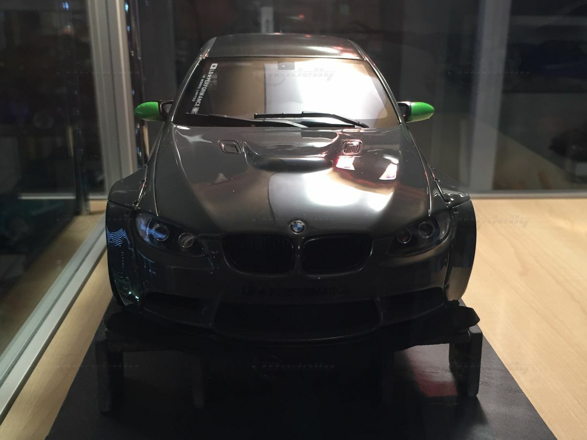 The model car you see here, in 1/18 scale, produced by GT Spirit, is a detailed replica of the BMW M3 E92. Made from resin, this model boasts precise body details and clean craftsmanship. The paint job is eye-catching too. The glossy gray finishes highlight the sporty curves, while the carbon pattern on the roof replicates authentic details. The neon green accents on the side mirrors and air intakes really crank up the aggressive design. The widened wheel arches and bold LB-Performance logos hint at customization from the well-known Japanese tuning company Liberty Walk, based in Nagoya, Japan, famous for radical reworks since it was founded in 1993.