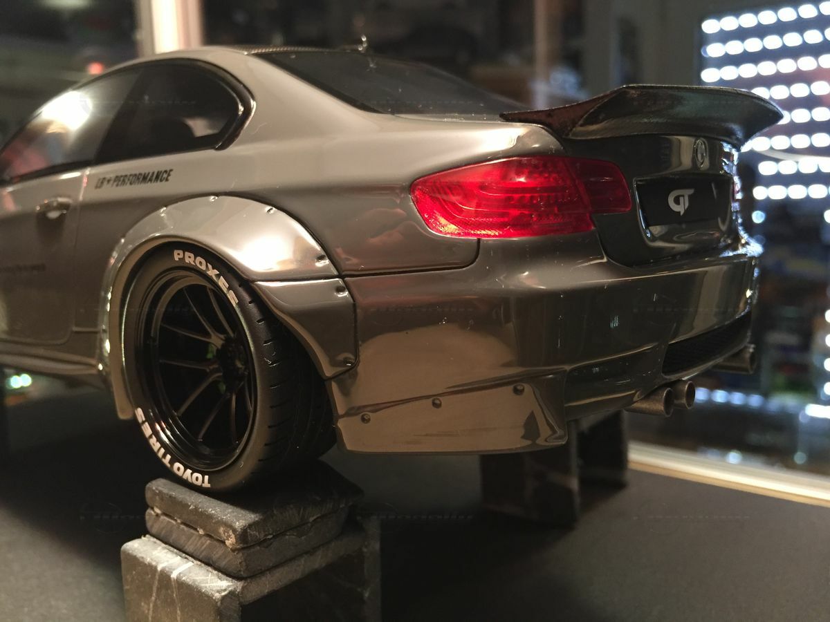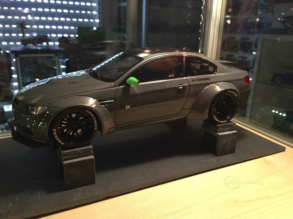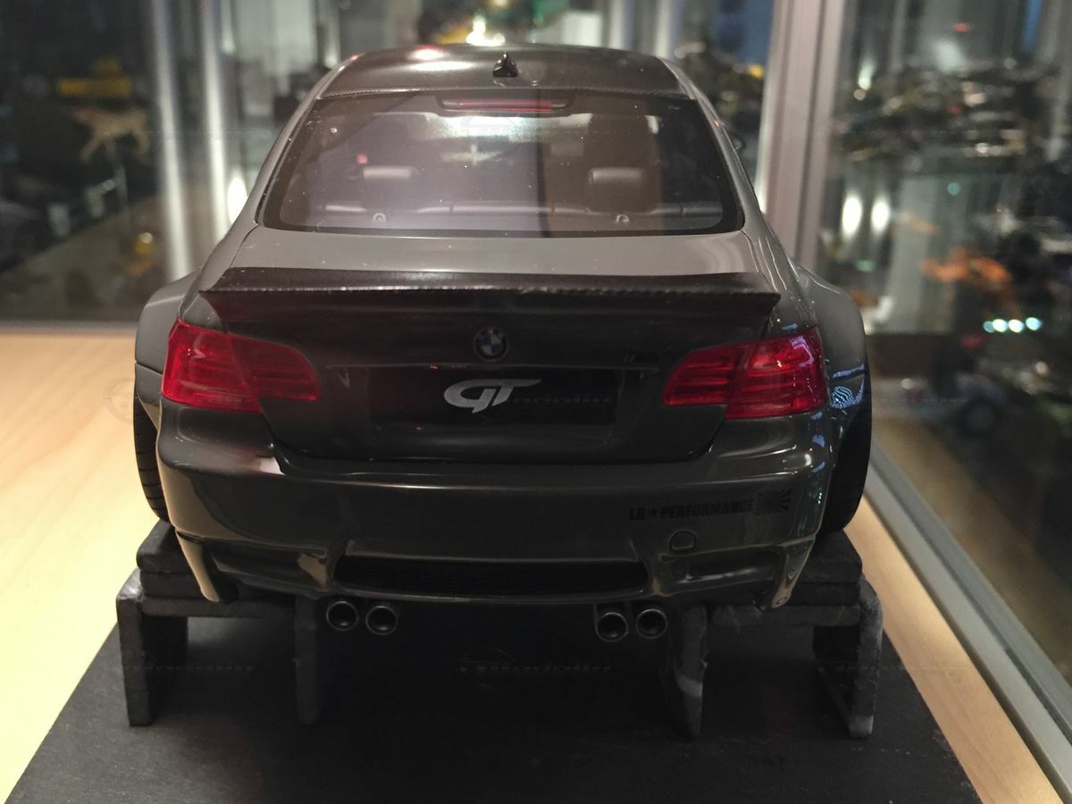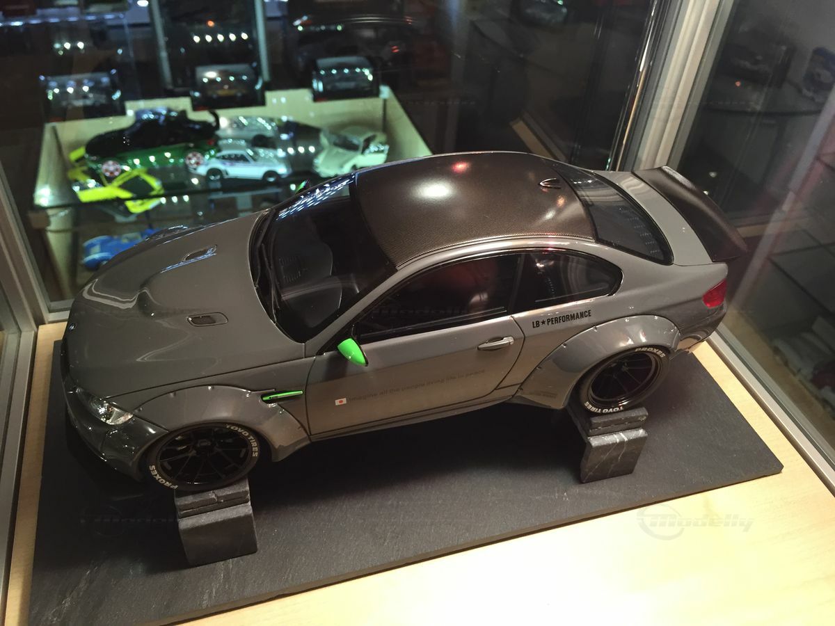 The model car you see here, in 1/18 scale, produced by GT Spirit, is a detailed replica of the BMW M3 E92. Made from resin, this model boasts precise body details and clean craftsmanship. The paint job is eye-catching too. The glossy gray finishes highlight the sporty curves, while the carbon pattern on the roof replicates authentic details. The neon green accents on the side mirrors and air intakes really crank up the aggressive design. The widened wheel arches and bold LB-Performance logos hint at customization from the well-known Japanese tuning company Liberty Walk, based in Nagoya, Japan, famous for radical reworks since it was founded in 1993.
