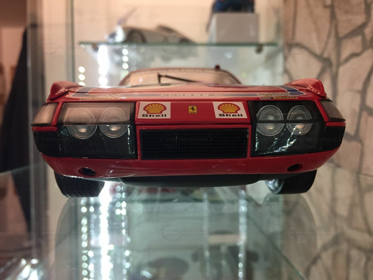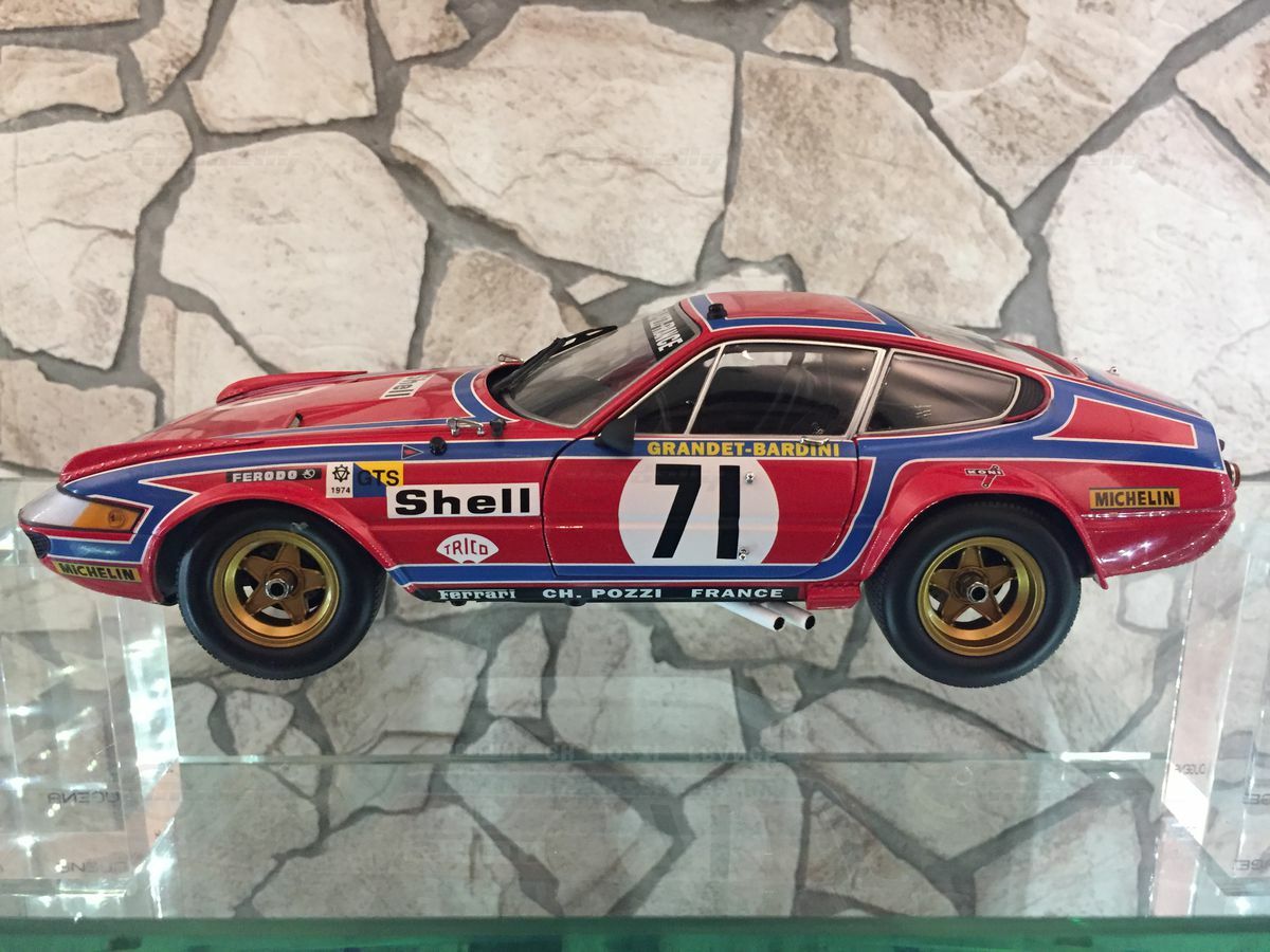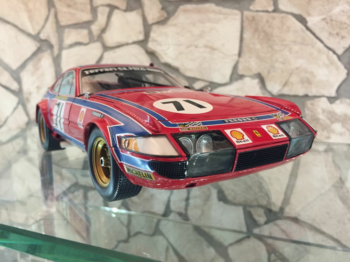 This impressive miniature of the Ferrari 365 GTB/4 Competizione Le Mans is a 1/18 scale replica made by Kyosho. The accuracy of detail in the replica is remarkable. The miniature is made of diecast and is part of the collection of Modelly member "Carjunky". Notable are the precise reproductions of sponsor logos such as Ferodo, Michelin, and Shell. The iconic red and blue bodywork is meticulously recreated, just like in the original car. In addition, the golden rims and detailed headlights are points that highlight the value and attention to detail of this model. The model is not only a collector's item but also an excellent example of craftsmanship in model building that will make every collector's heart beat faster.