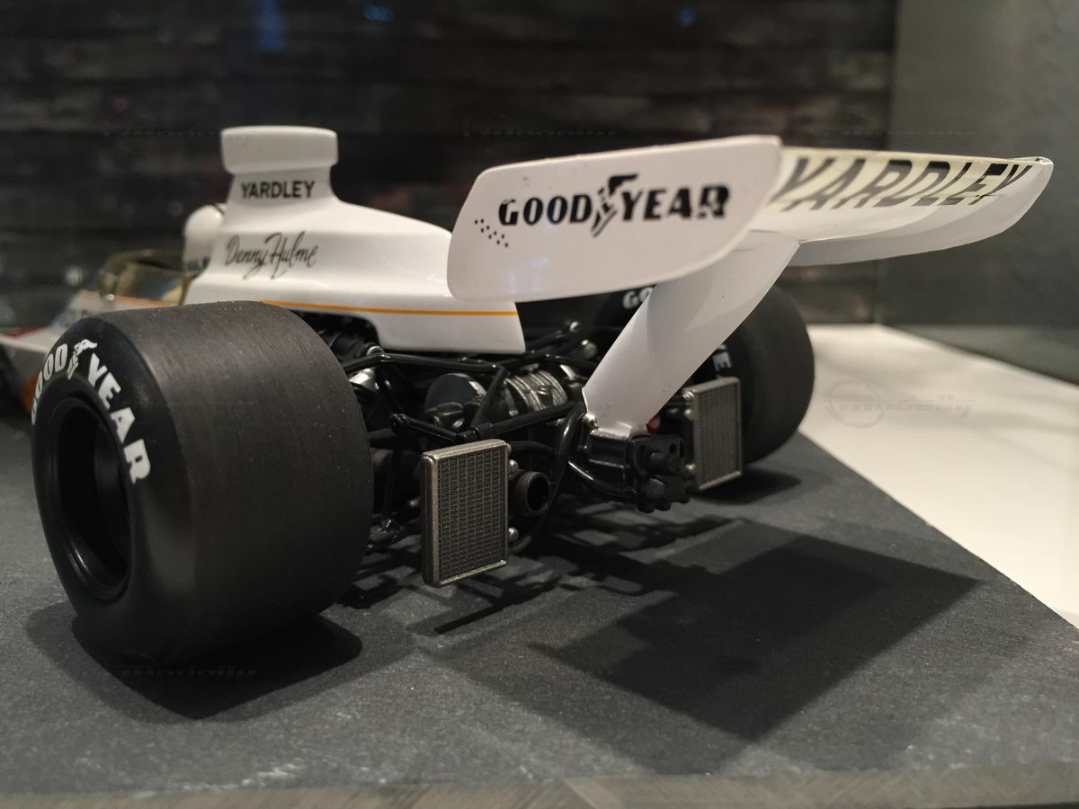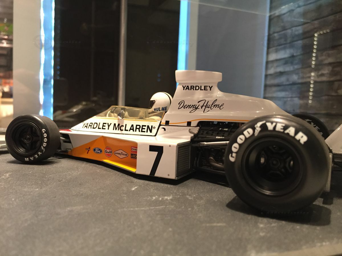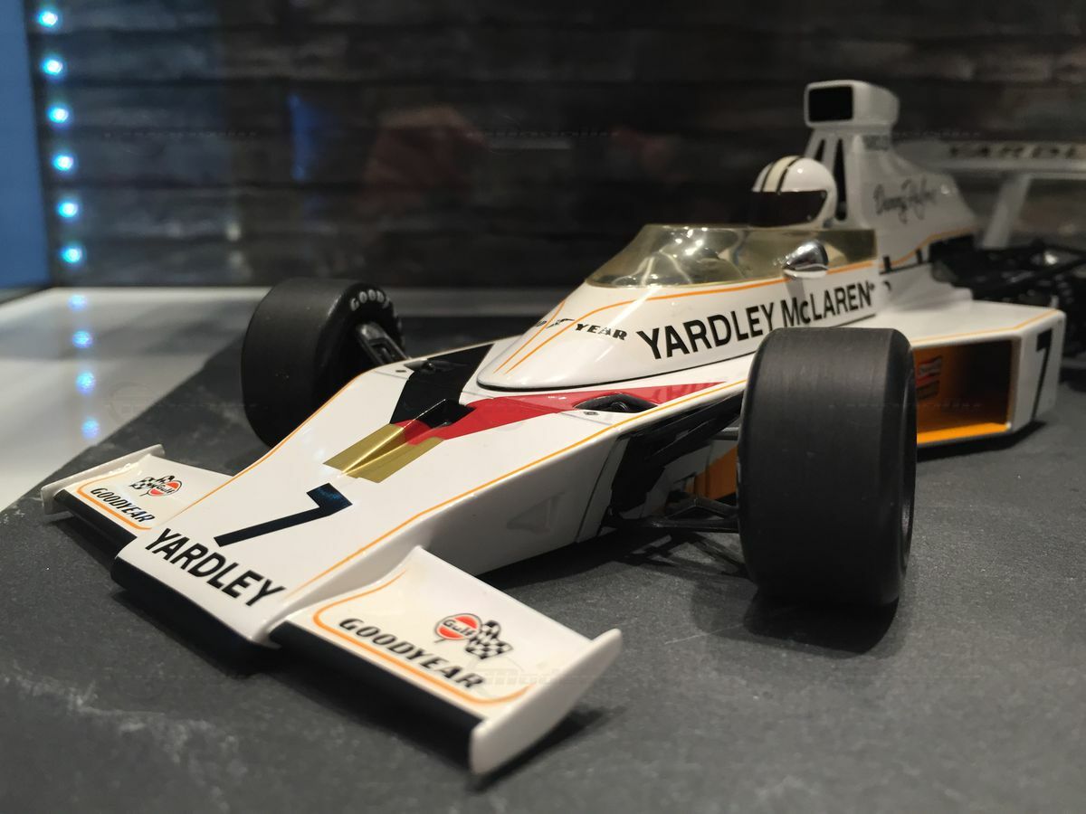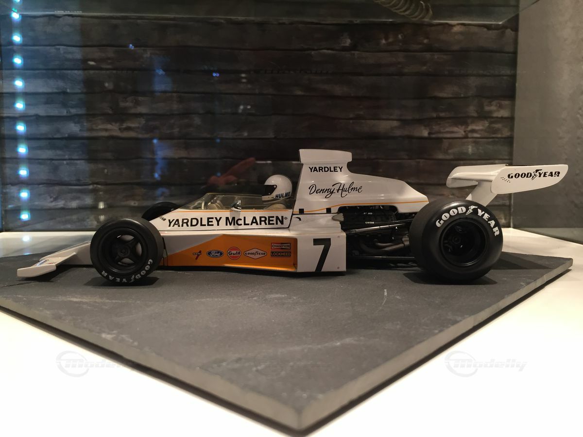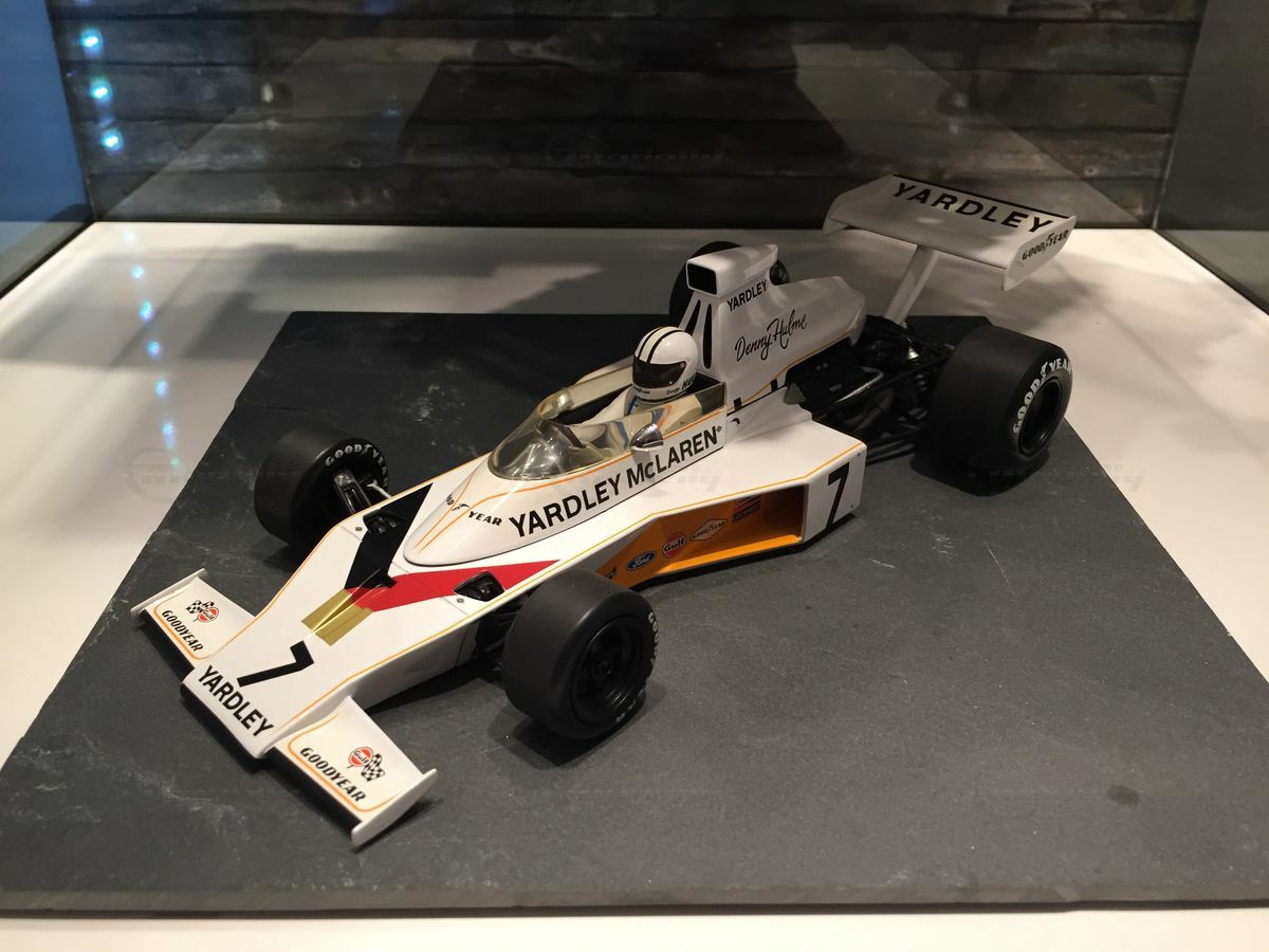 The livery of the Yardley McLaren M23 model stands out for its tri-color composition, particularly the blend of white, yellow, and black with golden accents, giving the model its authentic look. The right side of the miniature prominently features the sponsor logos of Gulf and Champion, highlighting the original configuration of this car. The name Denny Hulme can be spotted on the rear wing. The sleek and aerodynamic form of the model is meticulously replicated, reflecting the design elements that made the Yardley McLaren M23 so distinctive.