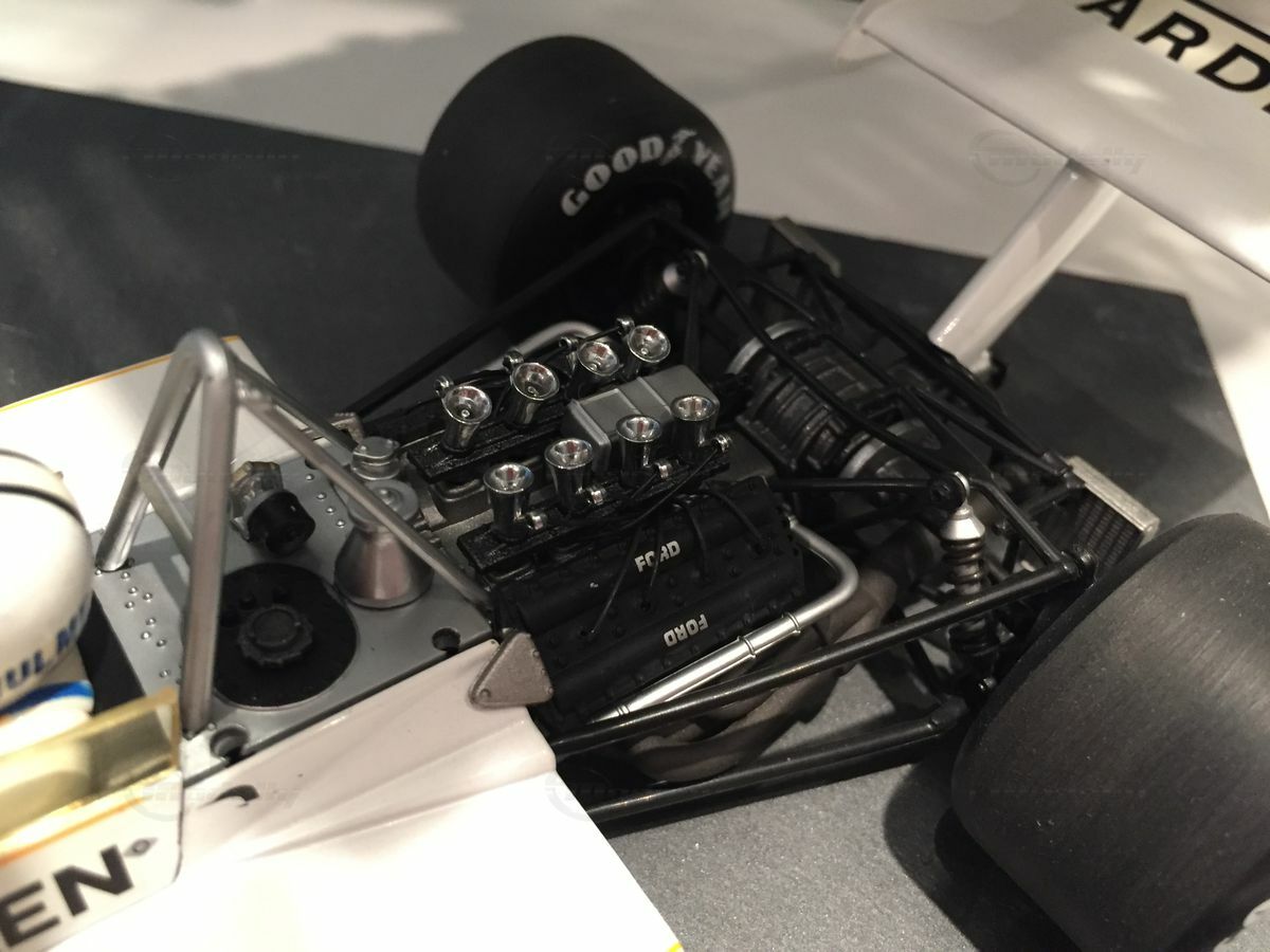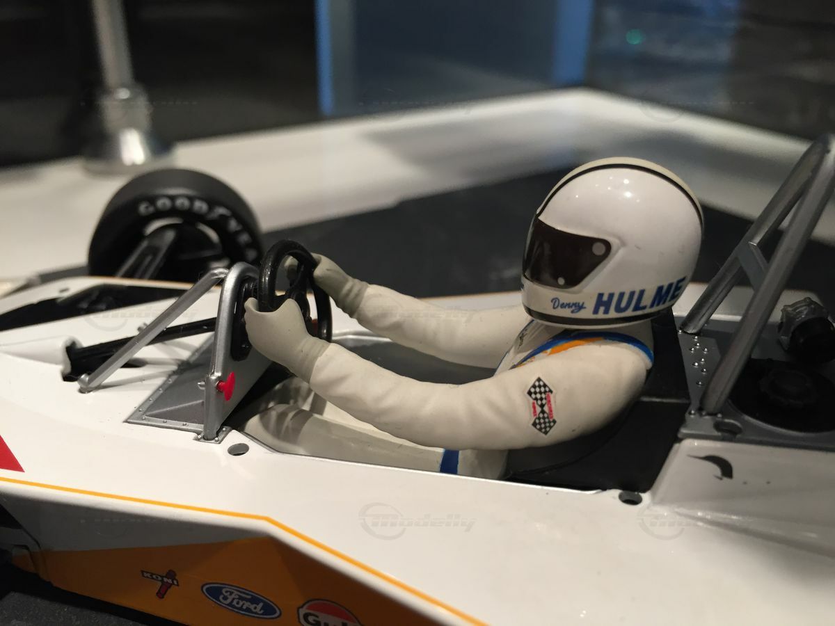 This precise model by Minichamps Paul's Model Art in 1/18 scale showcases meticulous detailing and high-quality diecast material. The Yardley McLaren M23 model displays the driver’s name, Denny Hulme, on the left side and features sponsors like Goodyear on the tires, along with logos of Gulf and Champion. The paintwork, with its distinctive white and golden lines, is faithfully replicated. The attention to detail extends to intricate features like the radiator grilles and aerodynamic elements, a true delight for model car enthusiasts and collectors worldwide.