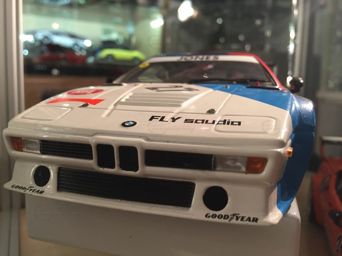 The model depicted showcases a distinctive paintwork in the typical BMW motorsport colors: white, blue, and red. These colors were often used for the BMW M1 Procar and are a prominent feature of this vehicle. The car carries the number 27 and displays sponsor decals like Shell and FLY. The design is eye-catching and represents the motorsport successes of that era. Every stripe and detail in the design of the model reflects the rich racing heritage of the car.