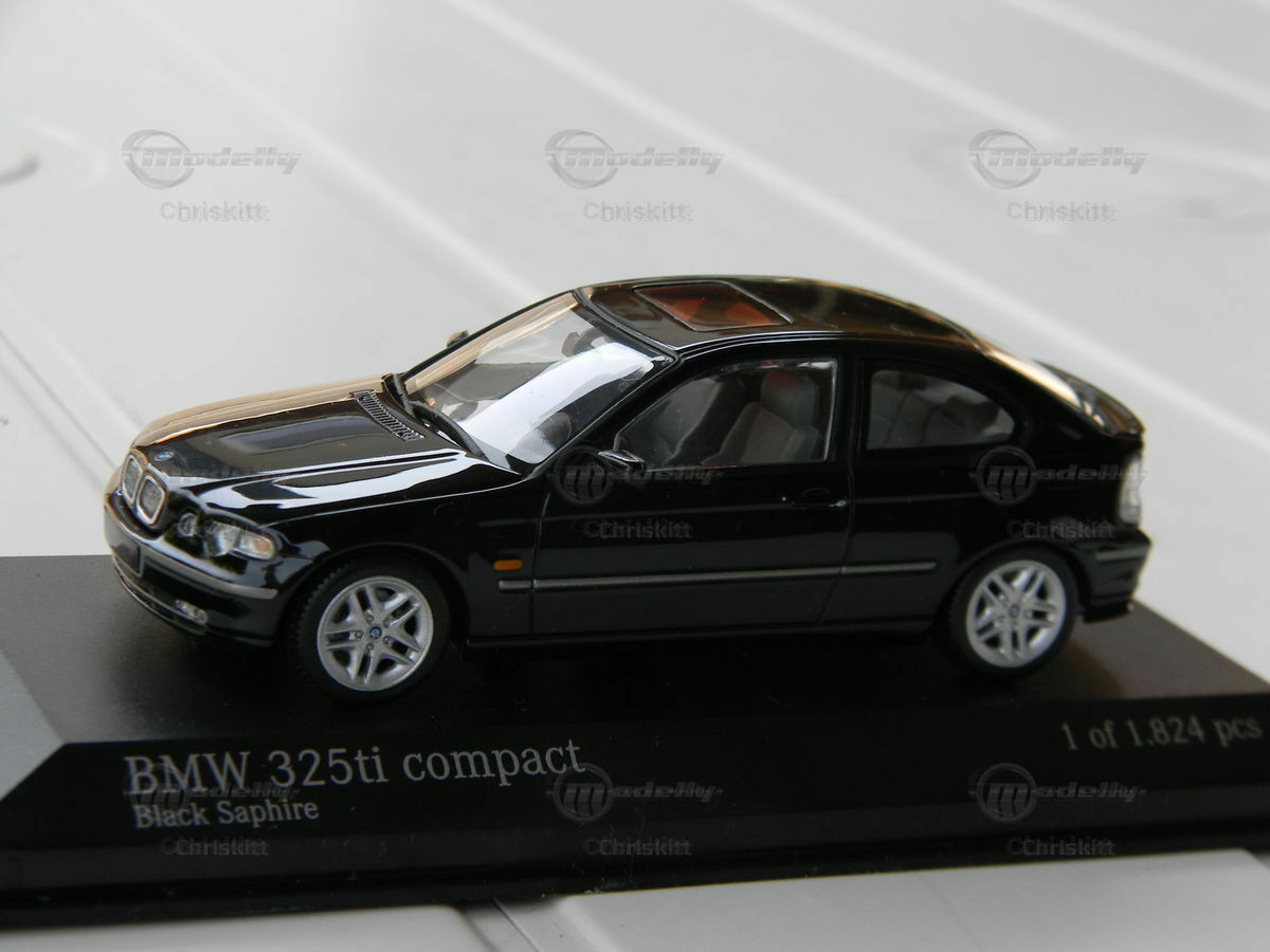 The model car shown here is in the scale-accurate 1/43 format and was crafted by Minichamps. The model is made of die-cast material, providing it with high durability and detail accuracy. The BMW 325ti Compact is painted in "Black Saphire", giving the vehicle an elegant and timeless look. Notable are the detailed reproductions of the front headlights, kidney grille, and six-spoke wheels. The interior of the model is also meticulously replicated, with clearly visible seats and instruments. This is a great example of the quality and precision for which Minichamps is known. Once again, the renowned manufacturer reaffirms its status in the world of model cars.