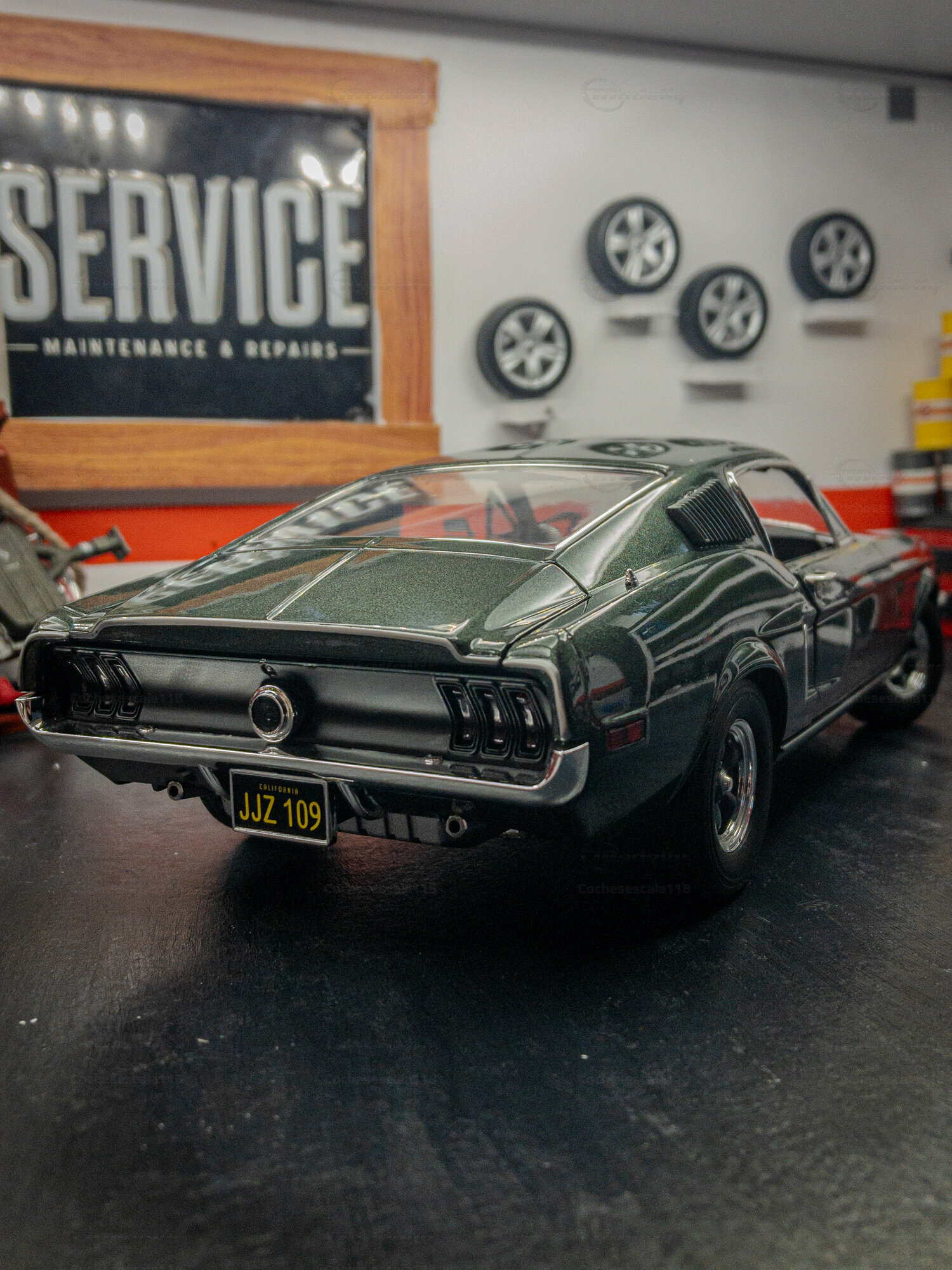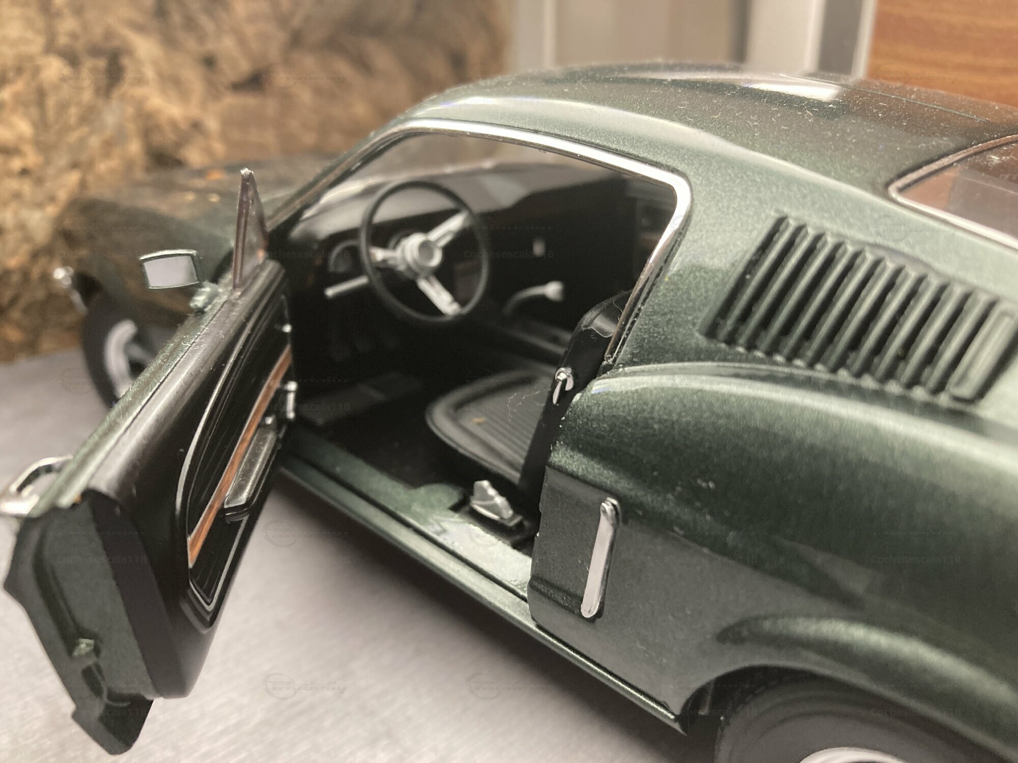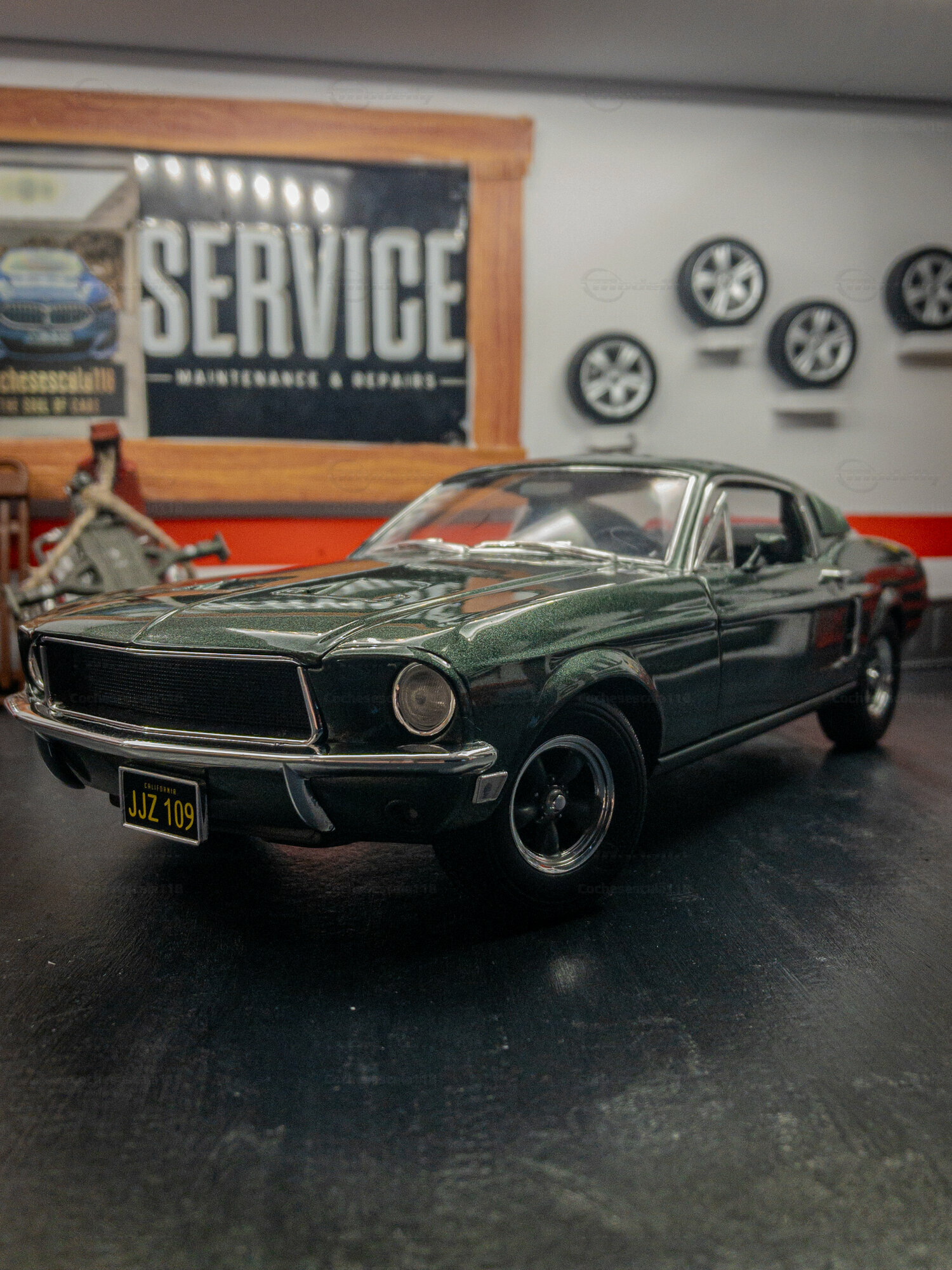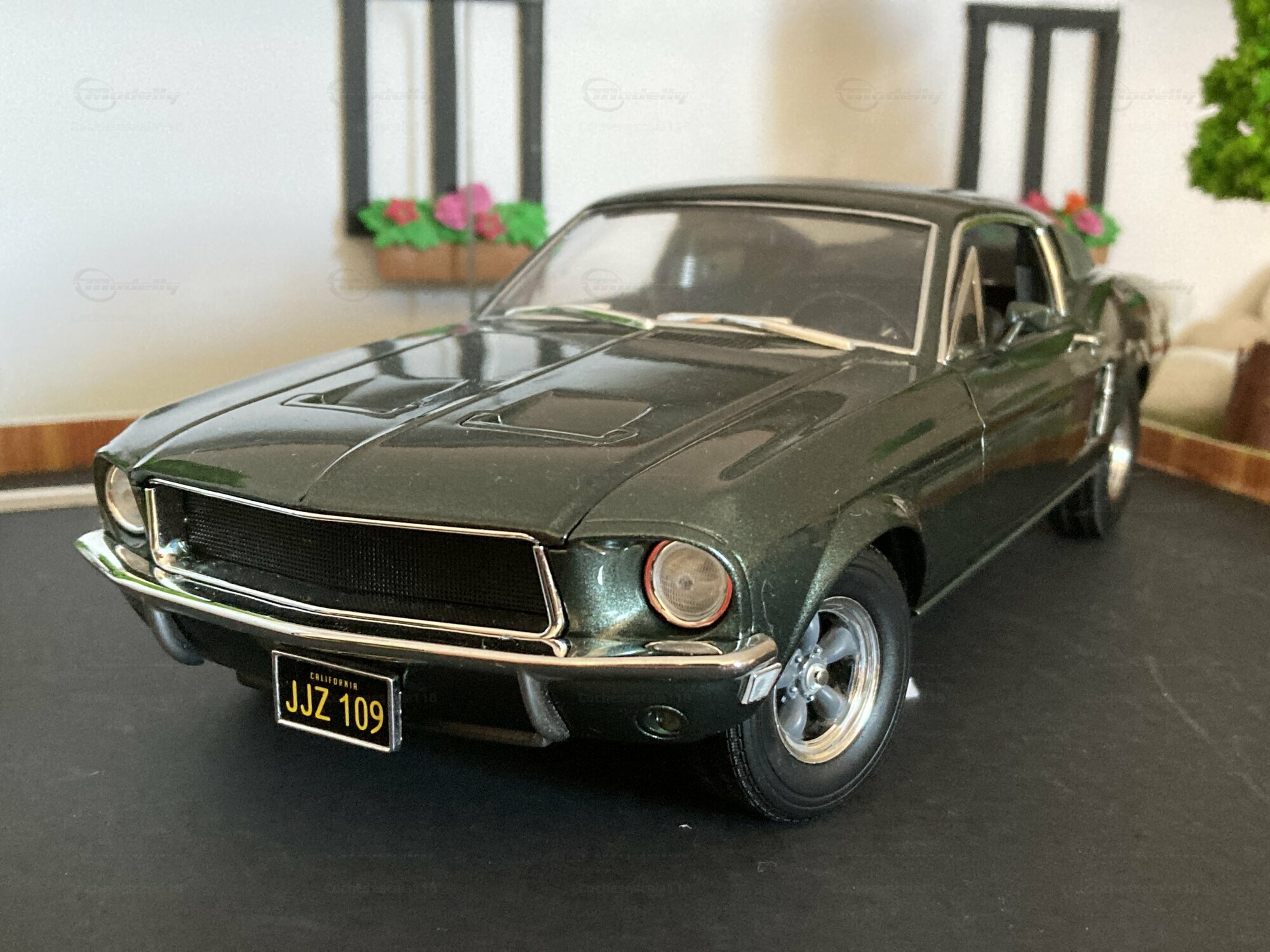 This Greenlight model of the Ford Mustang in 1/18 scale is painted in a deep, glossy green hue reminiscent of the famous "Highland Green" color seen in many iconic films. It is adorned with detailed black racing stripes that run along the entire body. The rims are also well-crafted, reflecting the classic design of the original. Distinct features such as the prominent headlights, sporty grille, and authentic taillights have been faithfully replicated, highlighting the authenticity and precision of the model. Overall, this model not only represents a miniature of one of the most legendary muscle cars in automotive history but also serves as a high-quality and historically valuable collector's item.