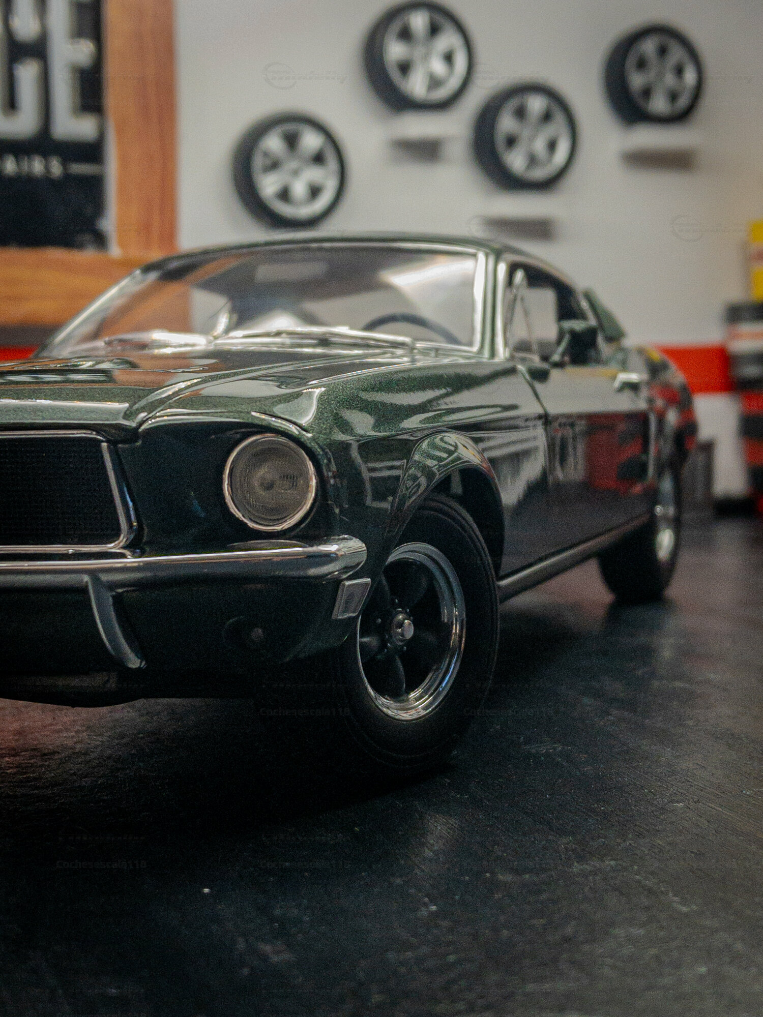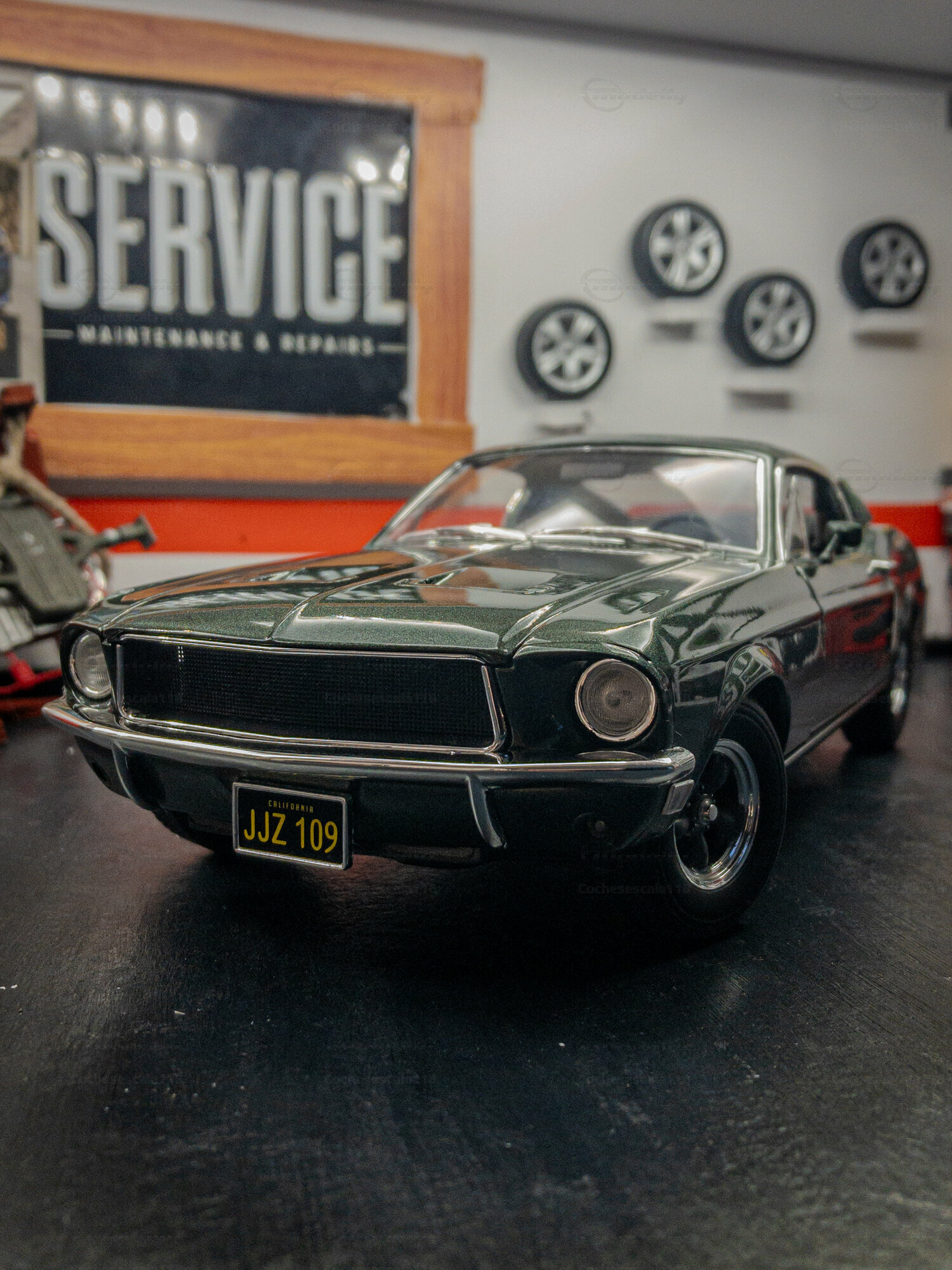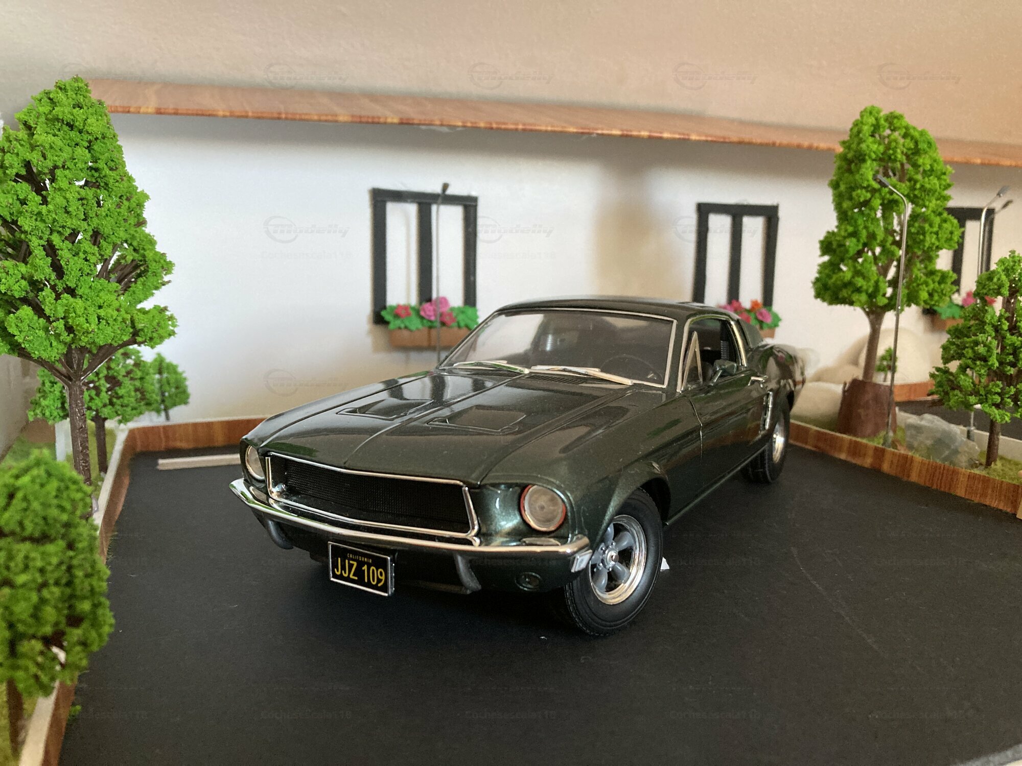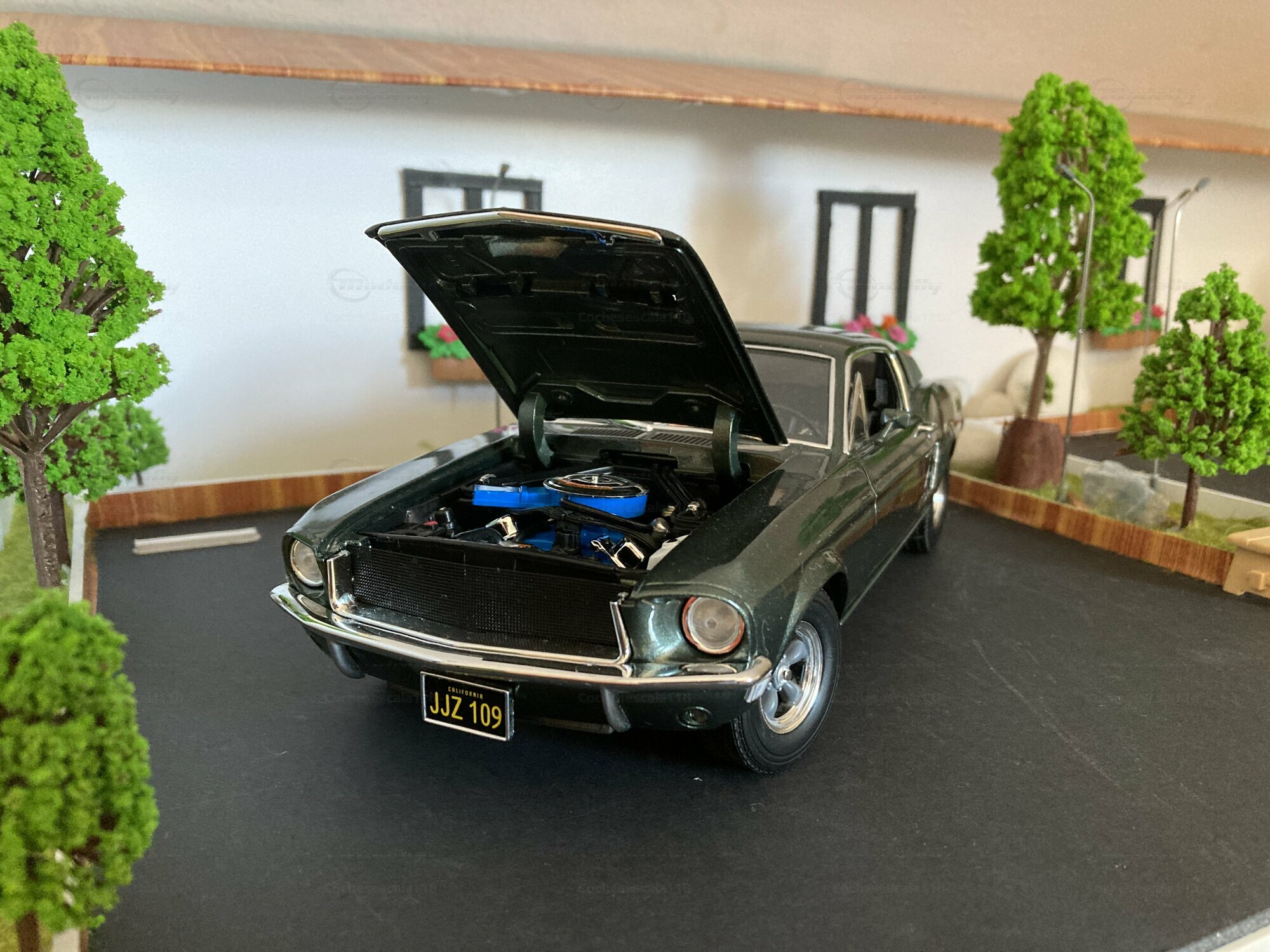 This Greenlight model of the Ford Mustang in 1/18 scale is painted in a deep, glossy green hue reminiscent of the famous "Highland Green" color seen in many iconic films. It is adorned with detailed black racing stripes that run along the entire body. The rims are also well-crafted, reflecting the classic design of the original. Distinct features such as the prominent headlights, sporty grille, and authentic taillights have been faithfully replicated, highlighting the authenticity and precision of the model. Overall, this model not only represents a miniature of one of the most legendary muscle cars in automotive history but also serves as a high-quality and historically valuable collector's item.