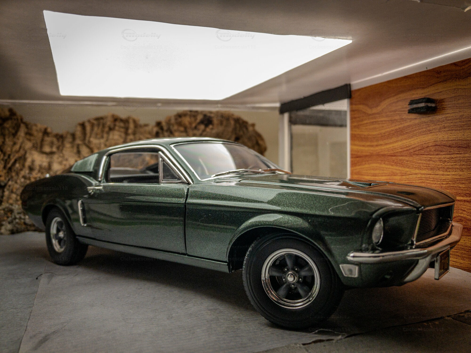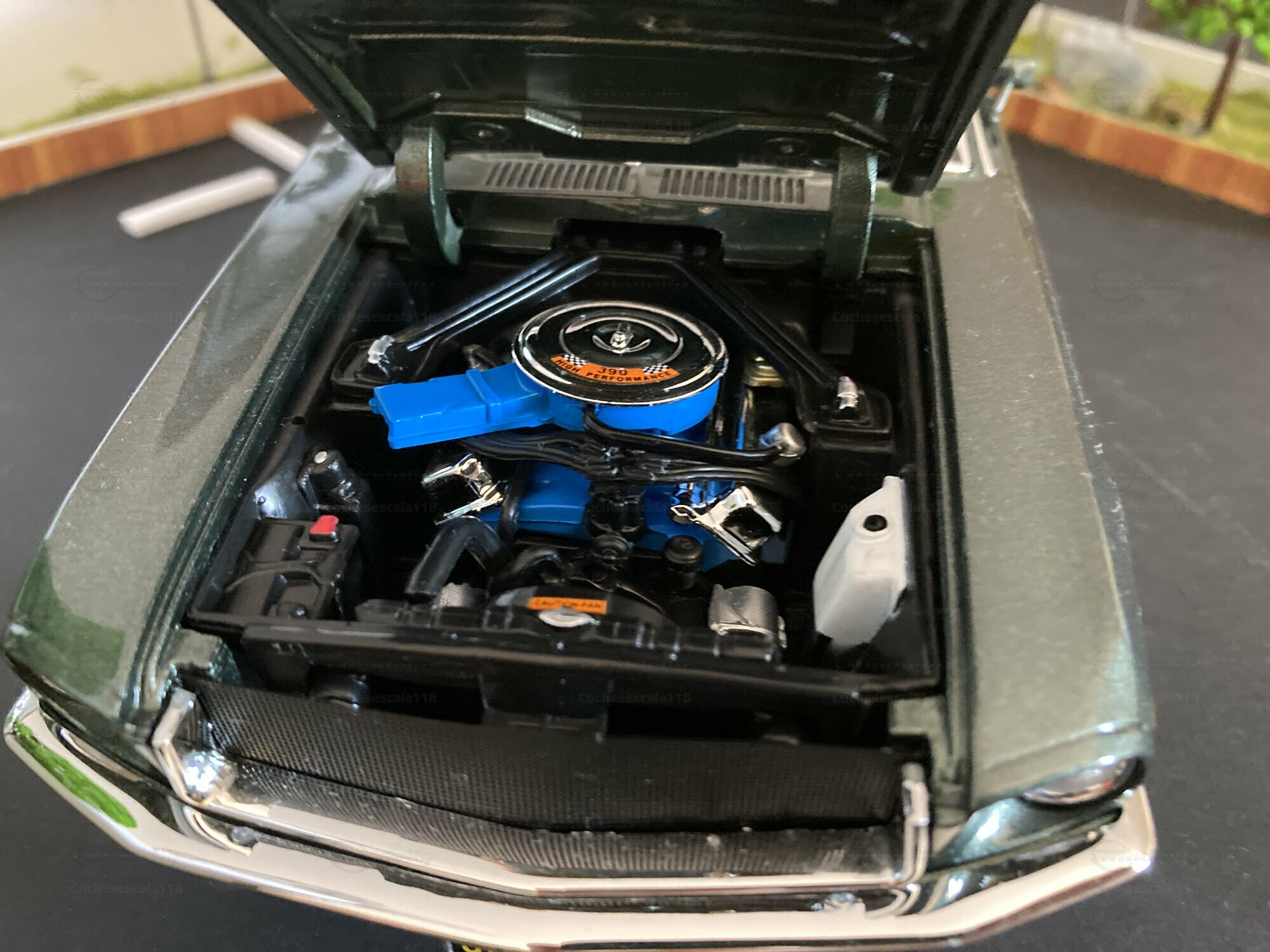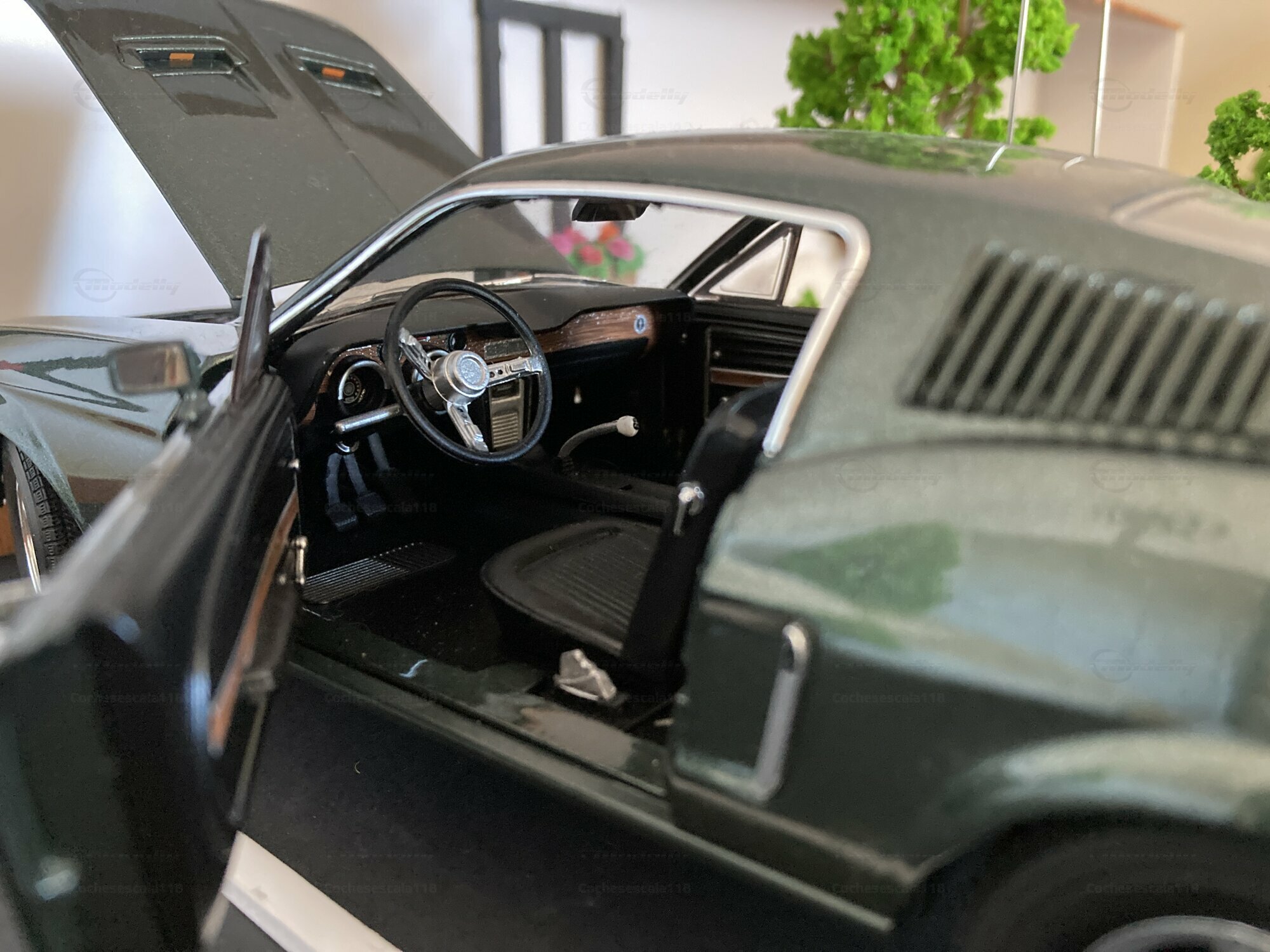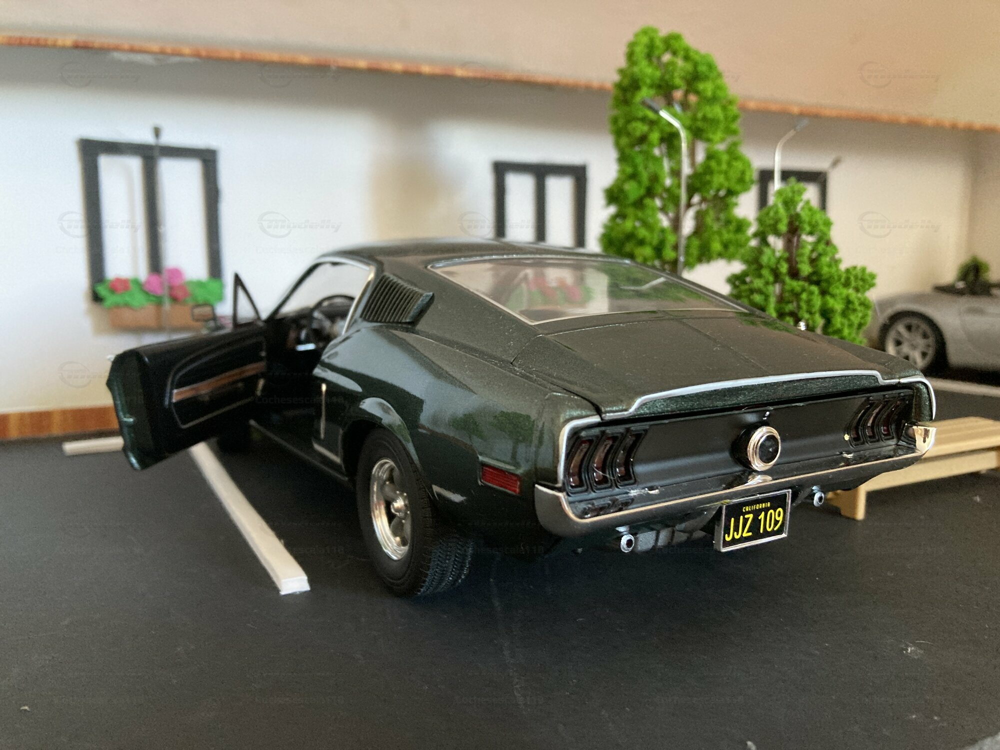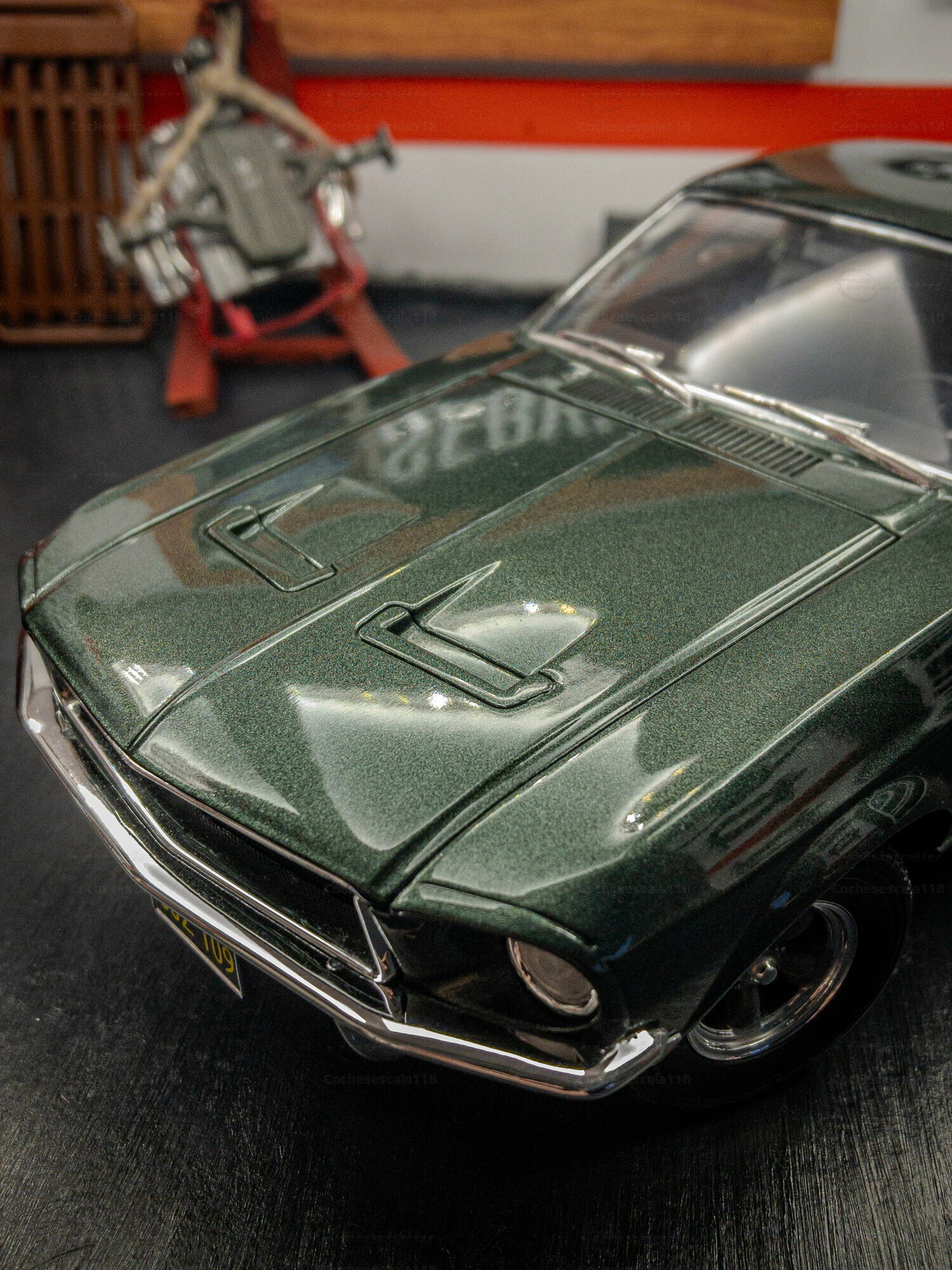 This Greenlight model of the Ford Mustang in 1/18 scale is painted in a deep, glossy green hue reminiscent of the famous "Highland Green" color seen in many iconic films. It is adorned with detailed black racing stripes that run along the entire body. The rims are also well-crafted, reflecting the classic design of the original. Distinct features such as the prominent headlights, sporty grille, and authentic taillights have been faithfully replicated, highlighting the authenticity and precision of the model. Overall, this model not only represents a miniature of one of the most legendary muscle cars in automotive history but also serves as a high-quality and historically valuable collector's item.