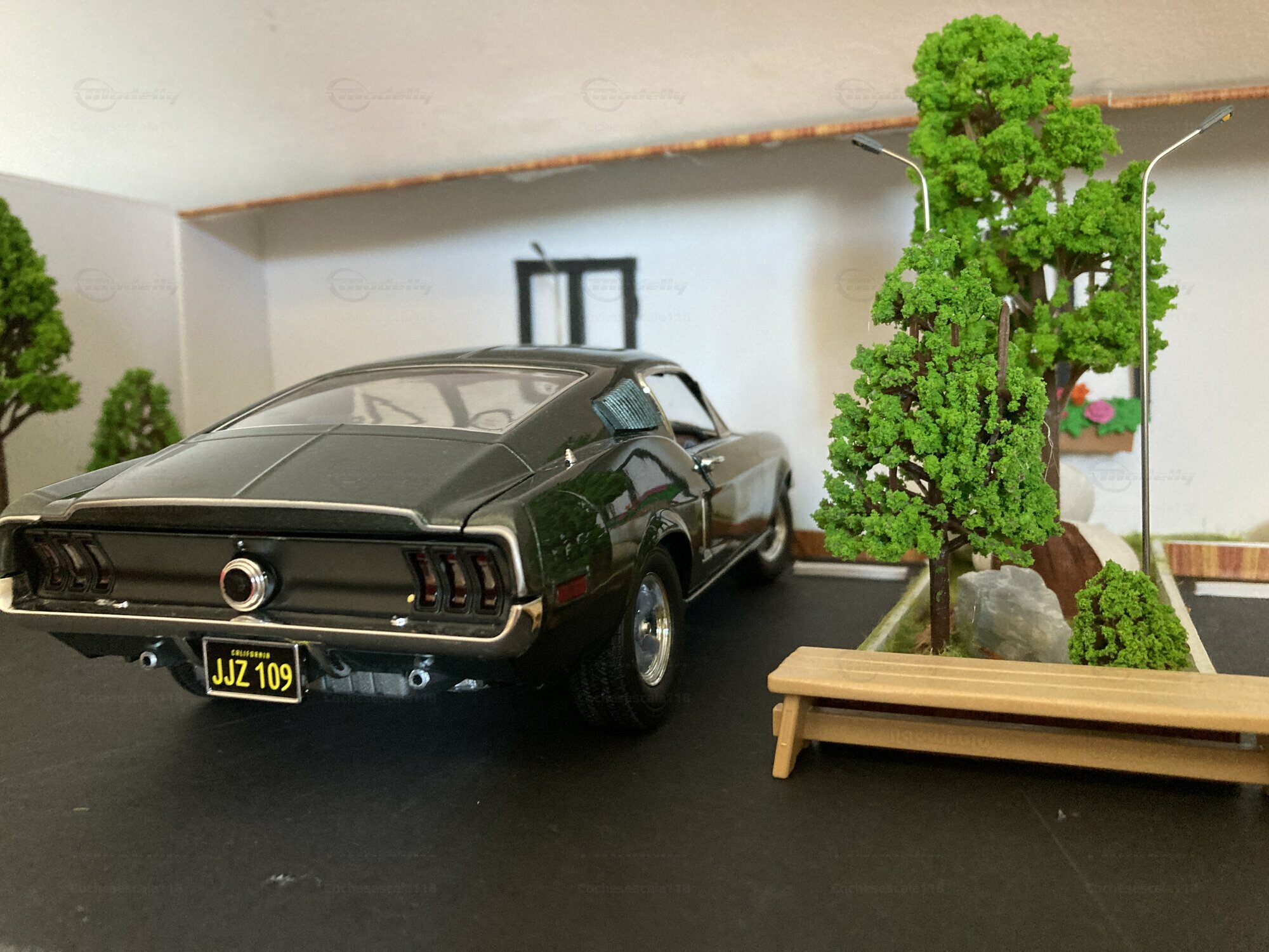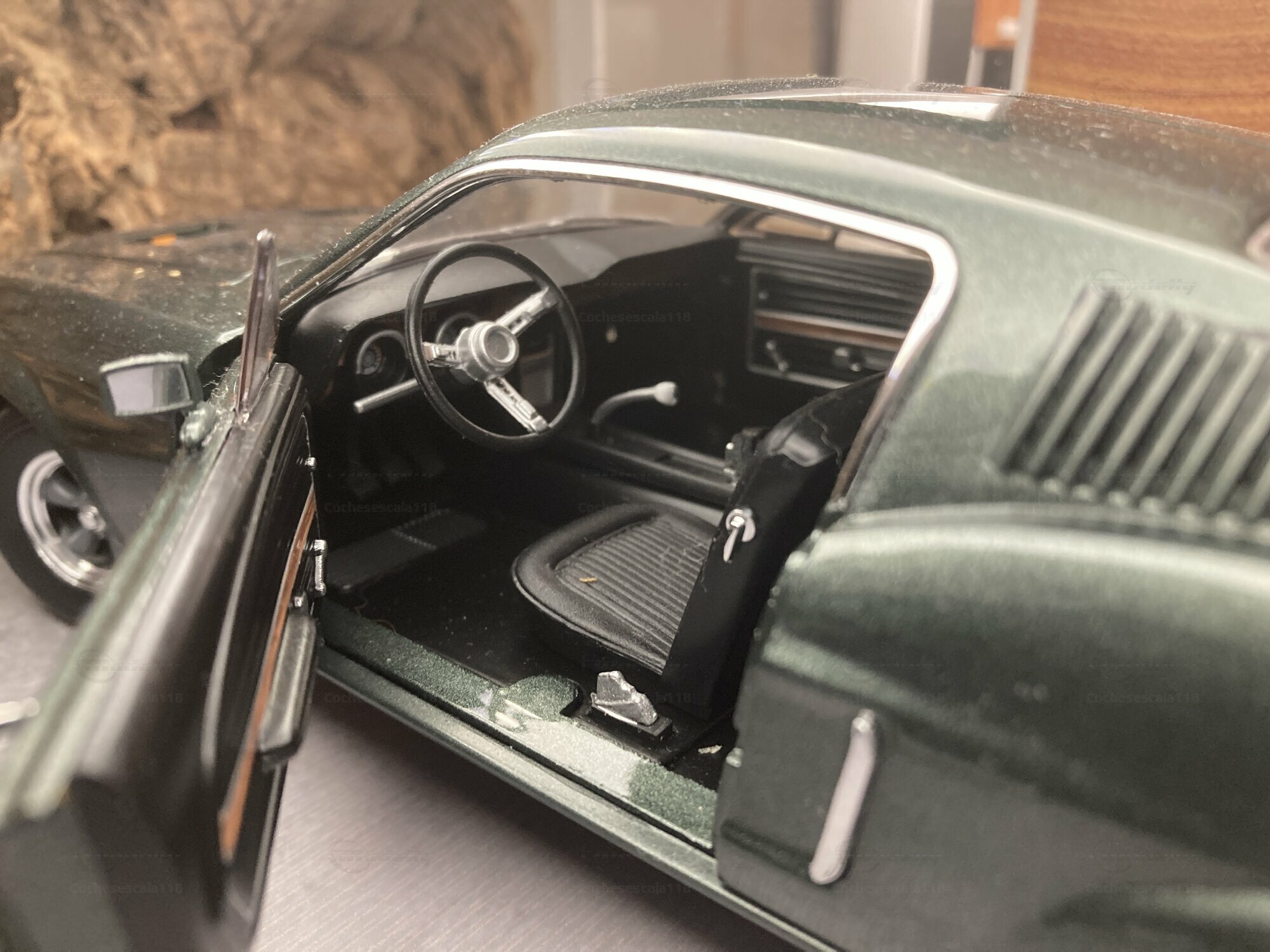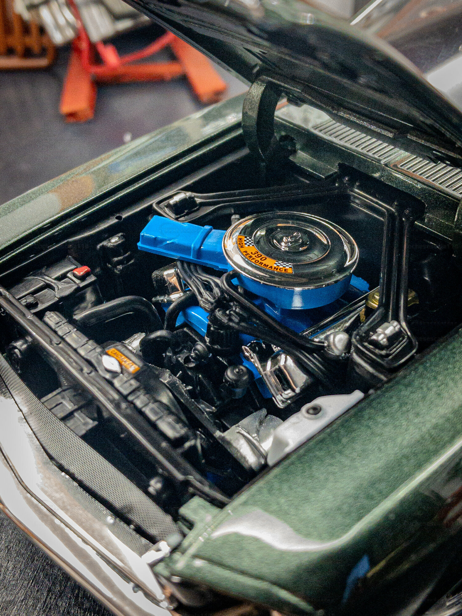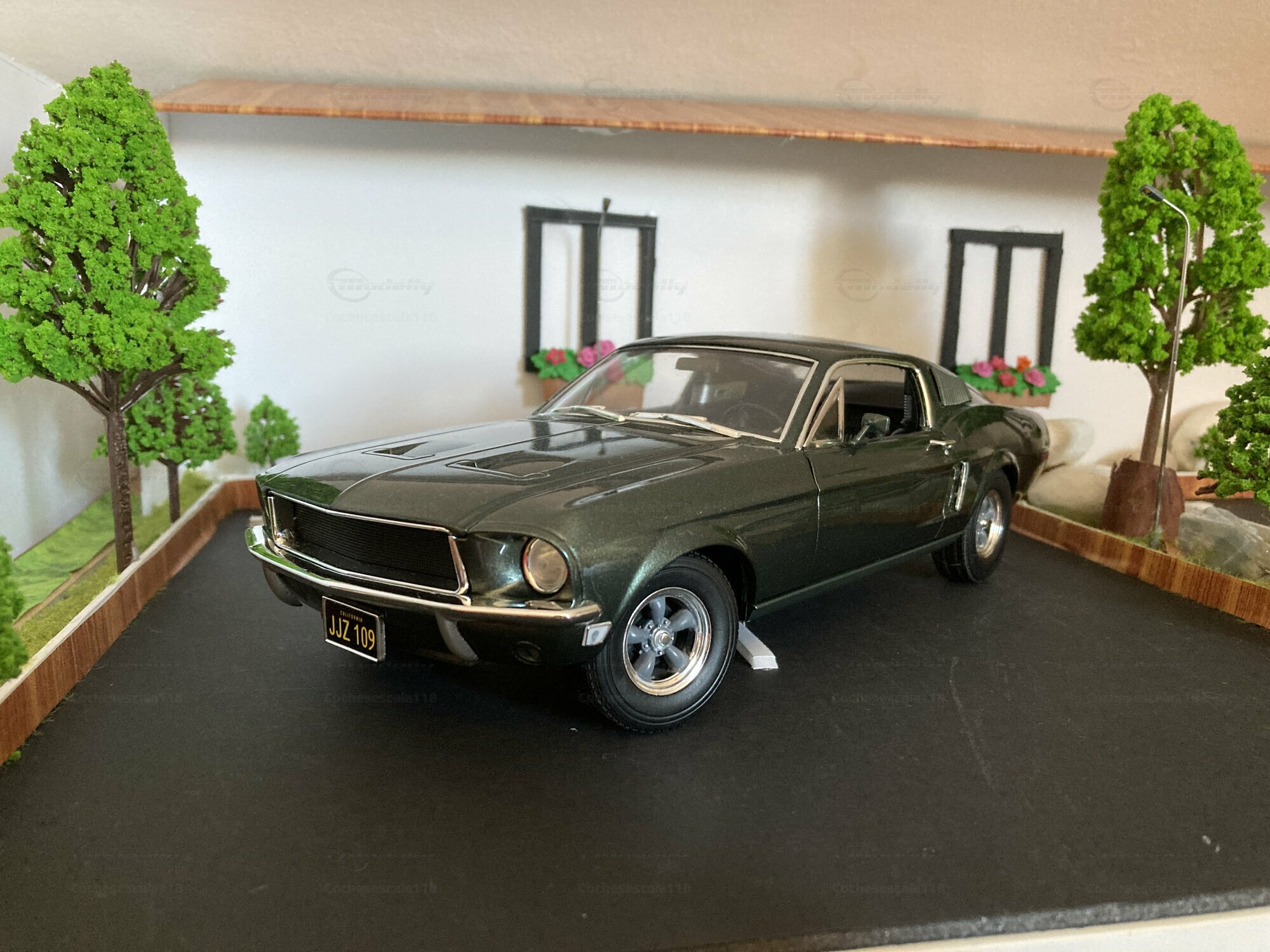 This Greenlight model of the Ford Mustang in 1/18 scale is painted in a deep, glossy green hue reminiscent of the famous "Highland Green" color seen in many iconic films. It is adorned with detailed black racing stripes that run along the entire body. The rims are also well-crafted, reflecting the classic design of the original. Distinct features such as the prominent headlights, sporty grille, and authentic taillights have been faithfully replicated, highlighting the authenticity and precision of the model. Overall, this model not only represents a miniature of one of the most legendary muscle cars in automotive history but also serves as a high-quality and historically valuable collector's item.