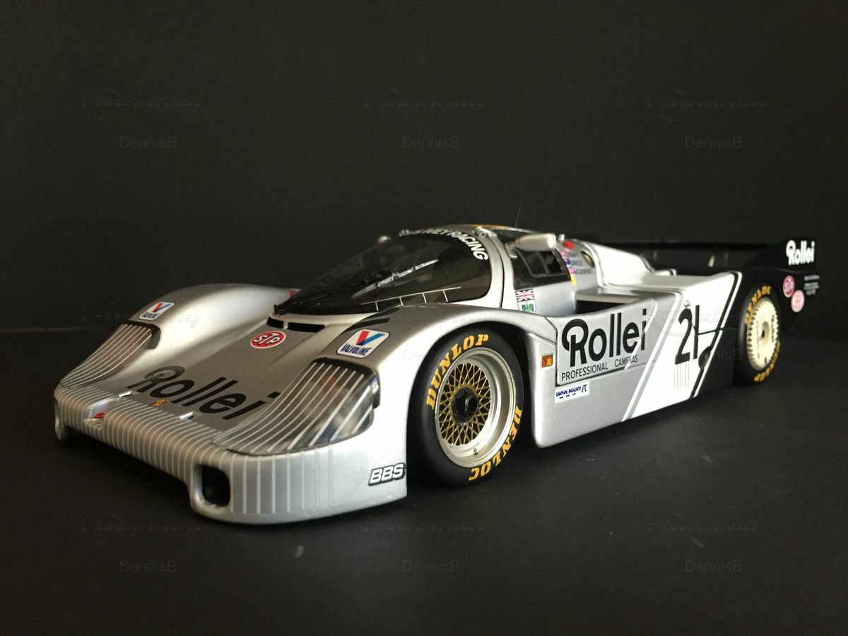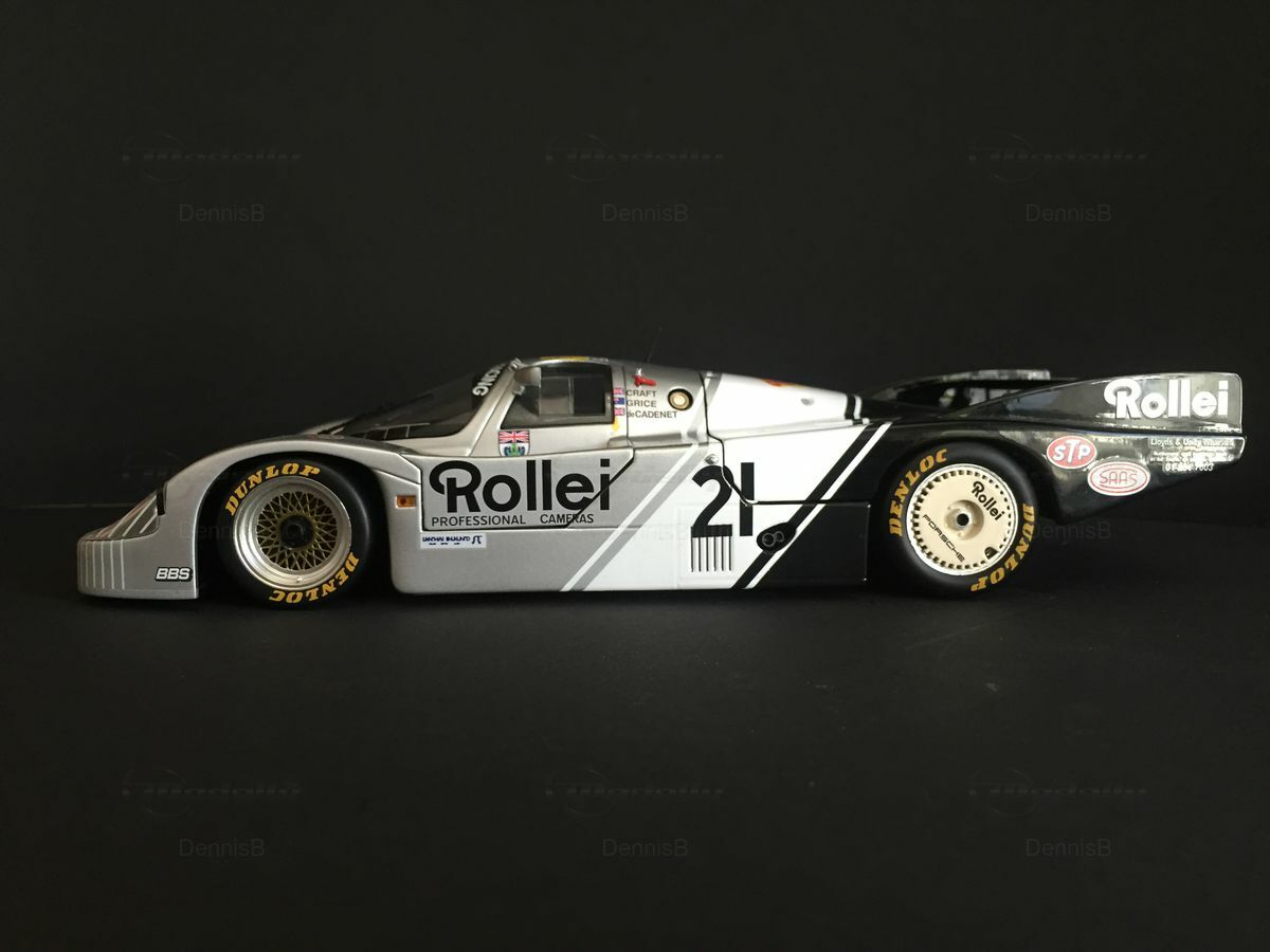 The miniature model of the Porsche 956 Langheck Group C in 1/18 scale, manufactured by Minichamps, shows remarkable attention to detail. This model, made of plastic, is an essential piece in the collection of Modelly member 'DennisB'. Noteworthy are the precise sponsor decals like the Rollei logos on the hood and side doors, as well as other sponsor stickers such as Valvoline and STP. The authentic silver livery accentuates the sleek and aerodynamic appearance of the car.