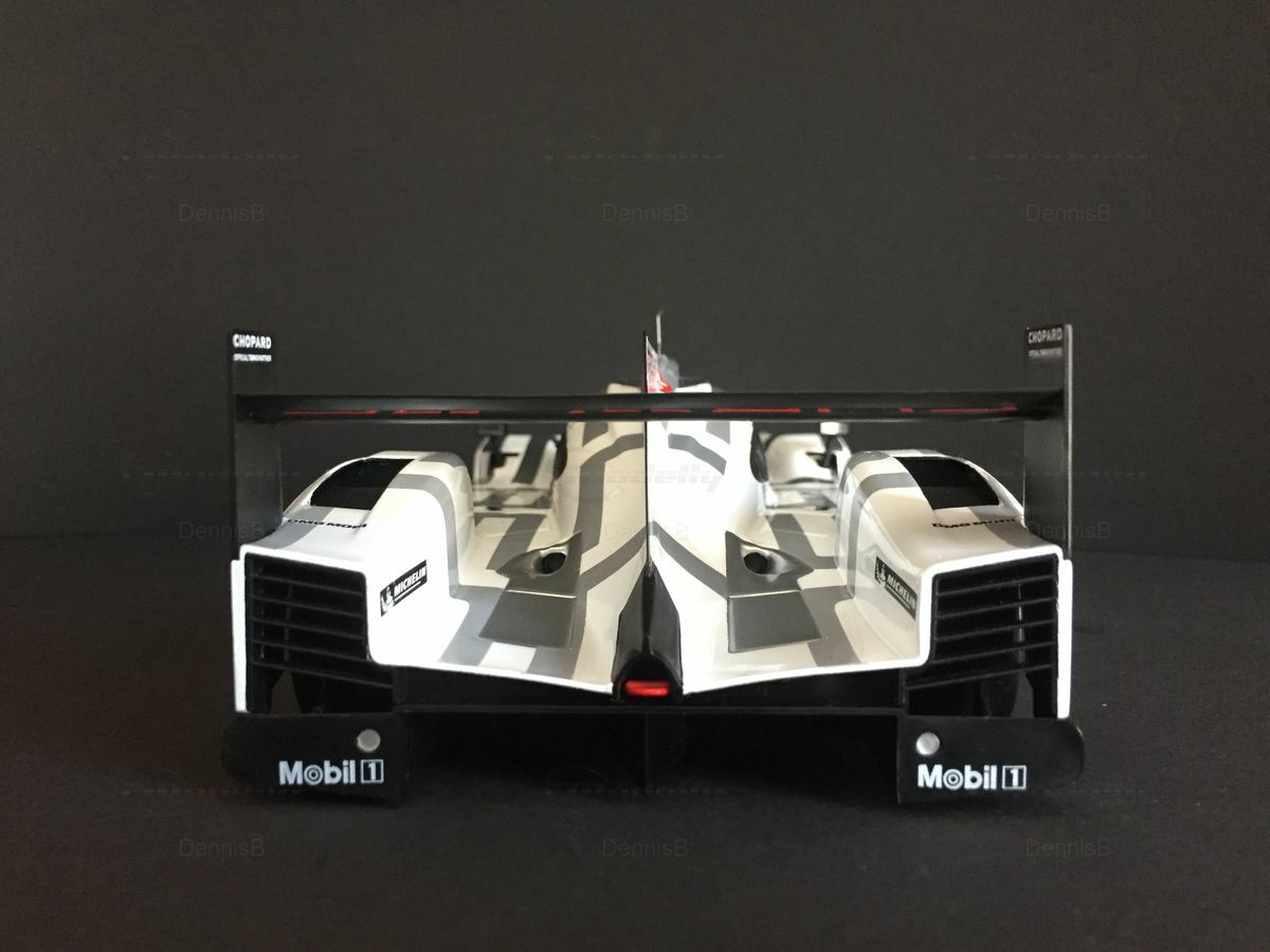 The Porsche 919 Hybrid is not only a technical marvel but also a masterpiece of design. With its distinctive shape and aerodynamic lines, it offers an impressive silhouette. The model is painted in a striking combination of white, black, and red and features prominent logos of sponsors Mobil 1, Michelin, and Chopard. The black hood and stripes running along the length of the car contribute to its dynamic appearance. The livery of the car also shines with a clear, high-gloss finish, while the sponsor logos are cleverly placed to emphasize both functionality and style.