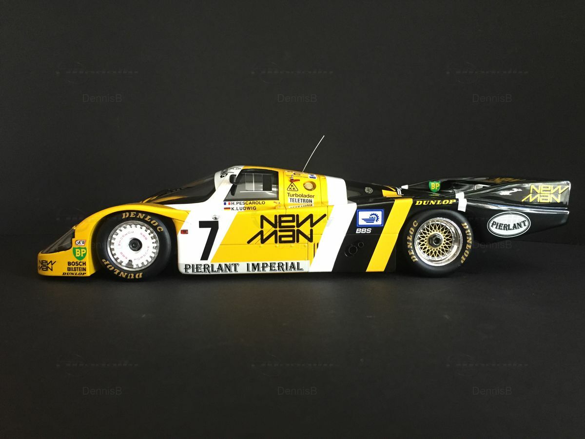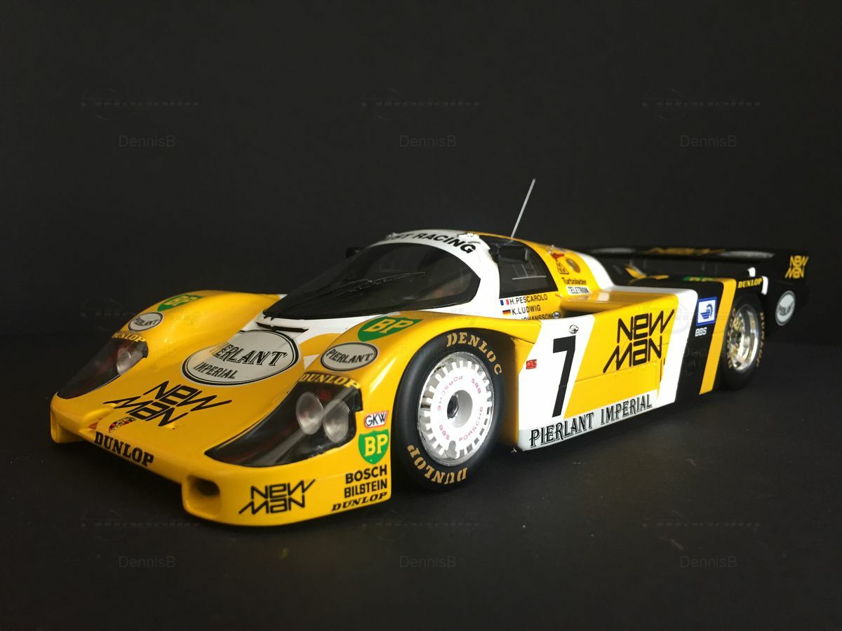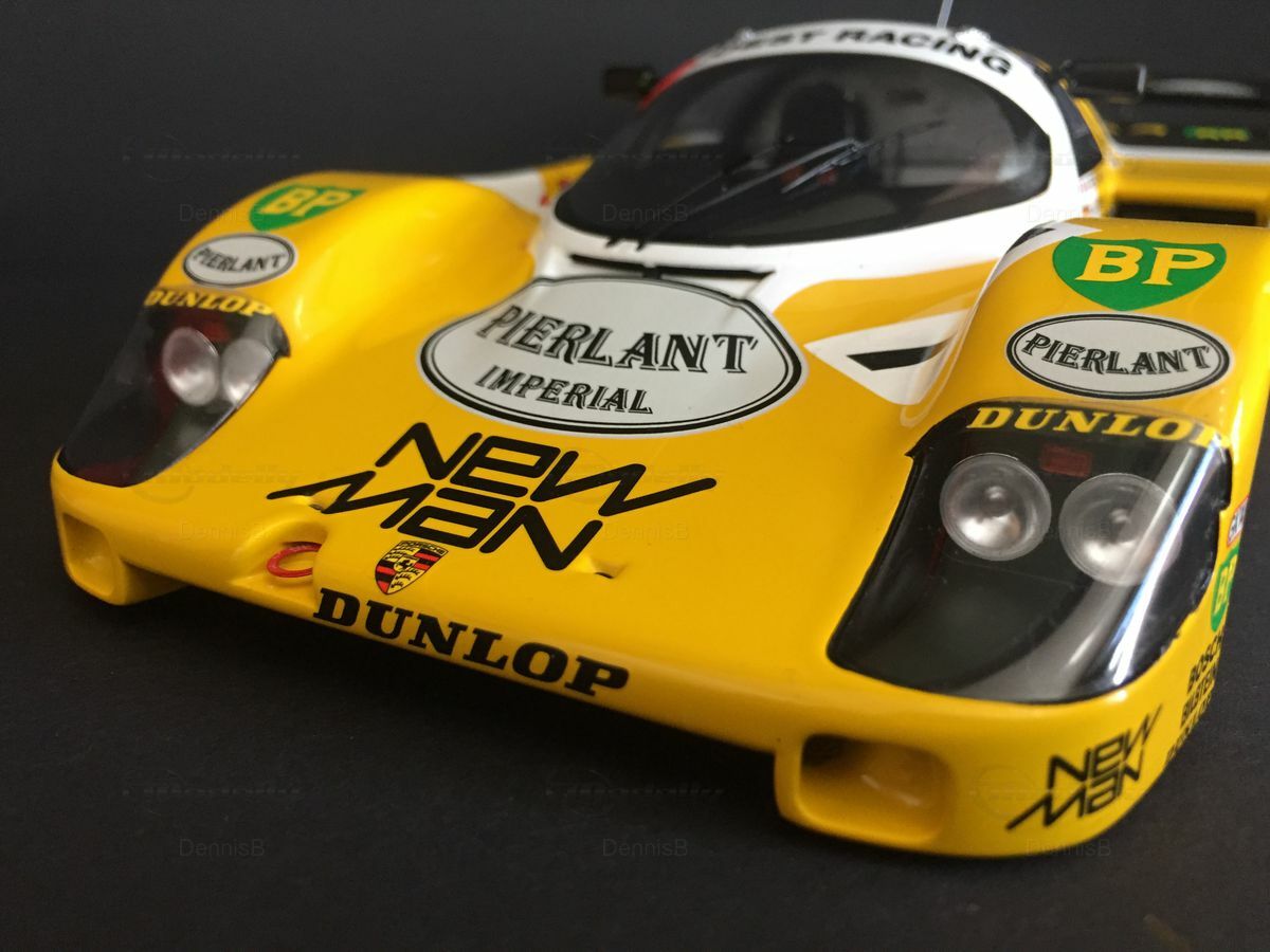 The design of the Porsche 956 LH Winner 24h Le Mans is distinctive and instantly recognizable. The livery of this specific model we have here showcases the iconic yellow-black color scheme of sponsor New Man, a fashion designer, along with other sponsors like BP and Dunlop. There are precise decals displaying the sponsor logos and lettering. The prominent number "7" sticker on the doors and rear is eye-catching. The front hood bears the logos of New Man and Pierlant Imperial, giving the car a classic yet professional look.