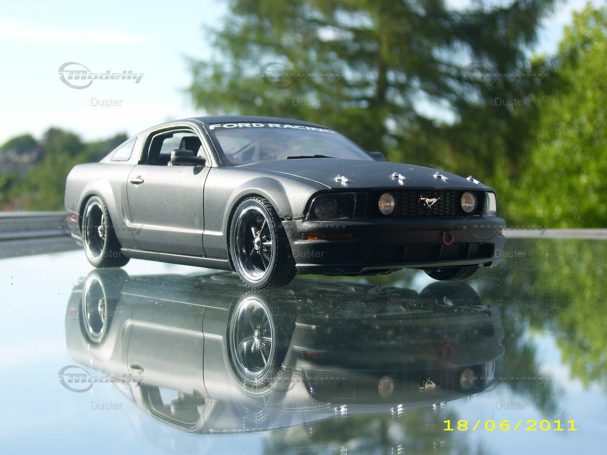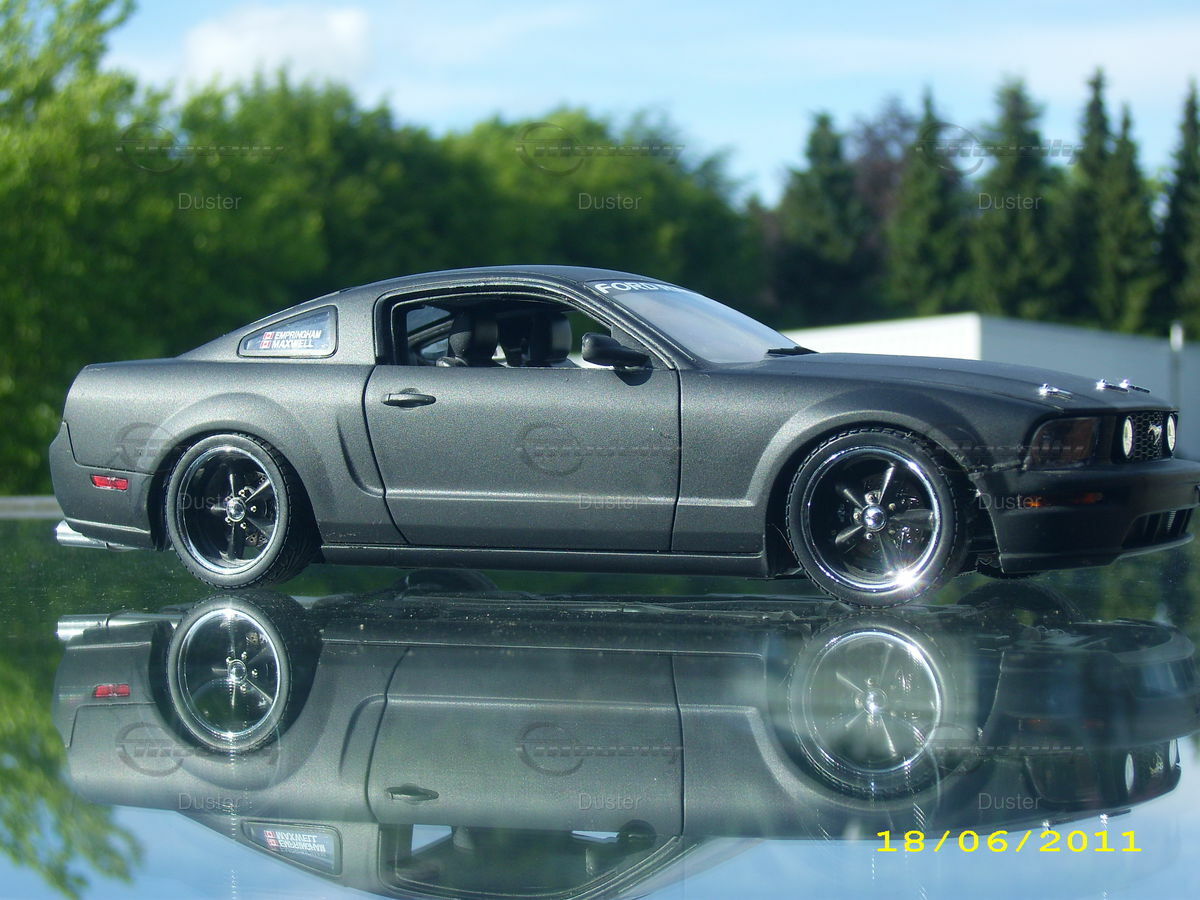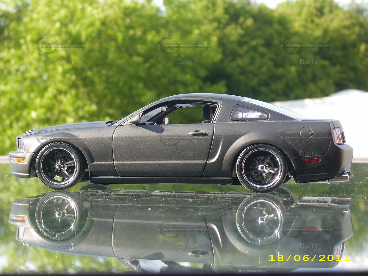 This model is part of the collection of Modelly member "Duster." The model impresses with its accurate reproduction of the original and the additional modifications. It is evident that the model vehicle features a matte black finish that makes it particularly striking. The paintwork includes a dark gray hue and detailed modifications such as adding a lowered suspension and special rims. These wheels appear to be from the manufacturer Empirichan Maxwell. The decals and Cobra emblem are precisely applied, adding special attention to detail to the model.